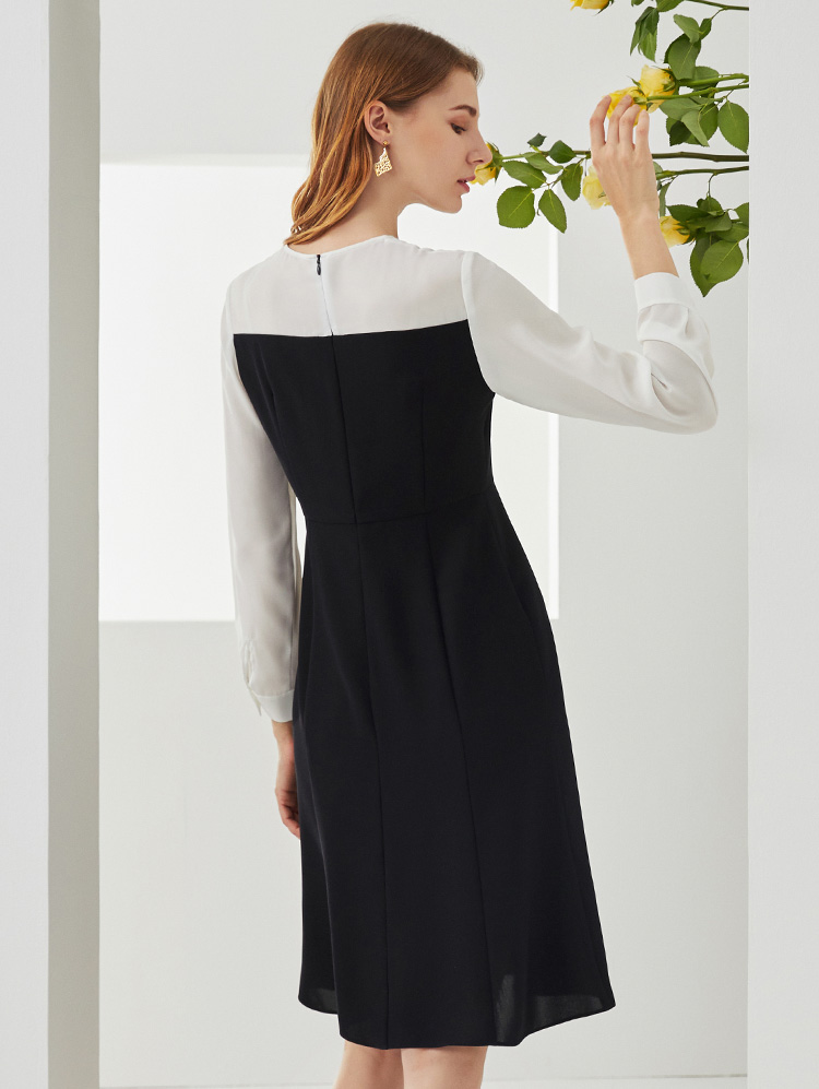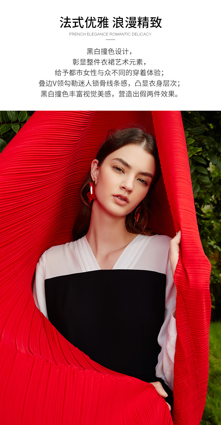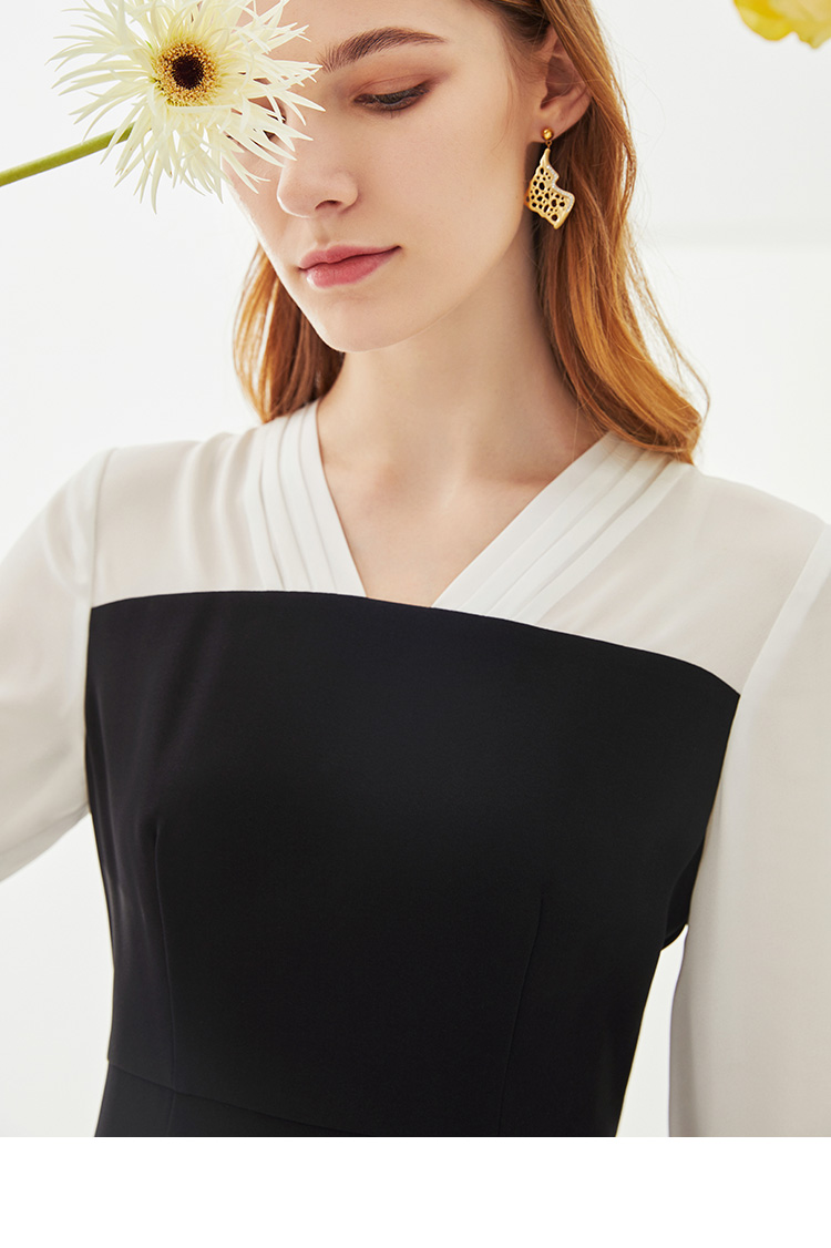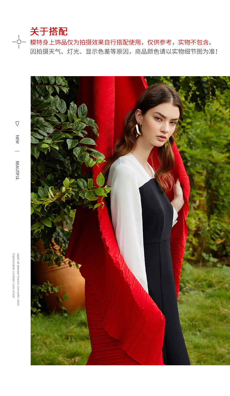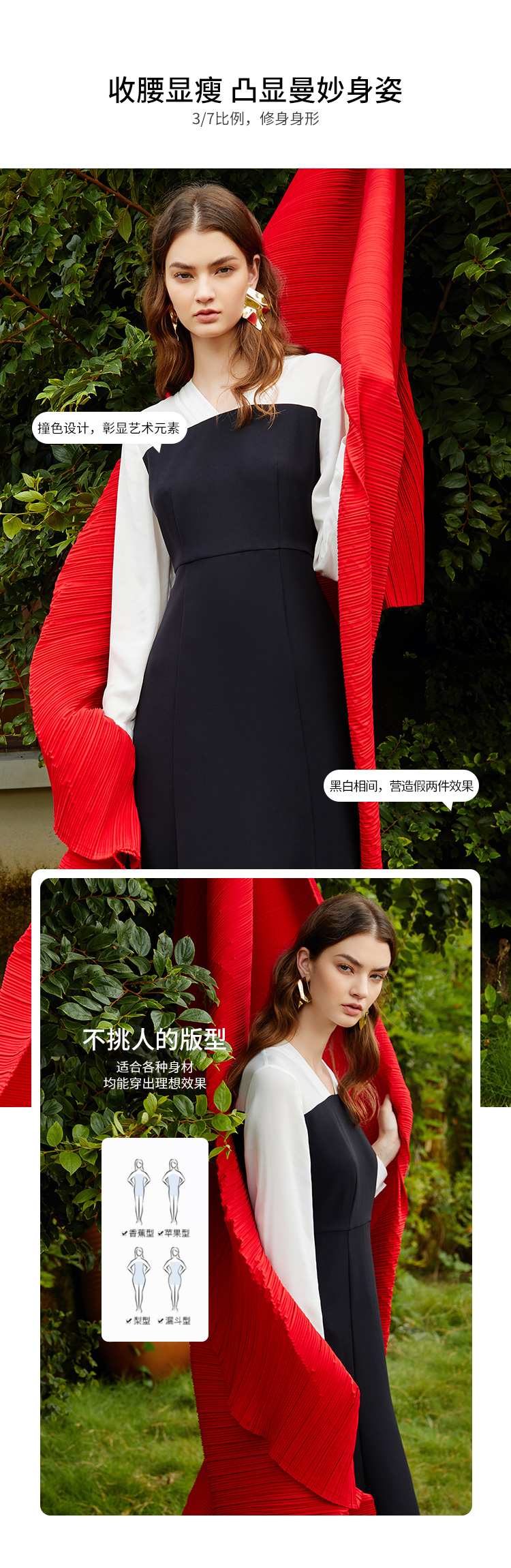 EITIE爱特爱新款时尚气质V领收腰撞色A版显瘦连衣裙C2107818