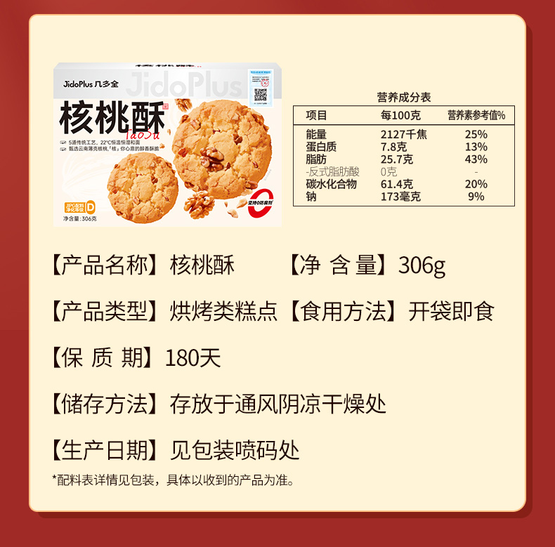 【新品】几多全核桃酥 传统糕点 老少皆宜 送礼必备 306g/盒