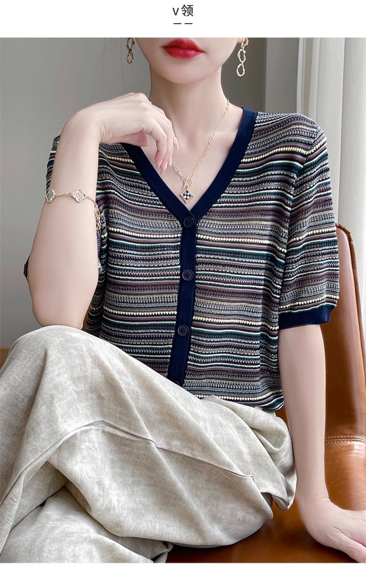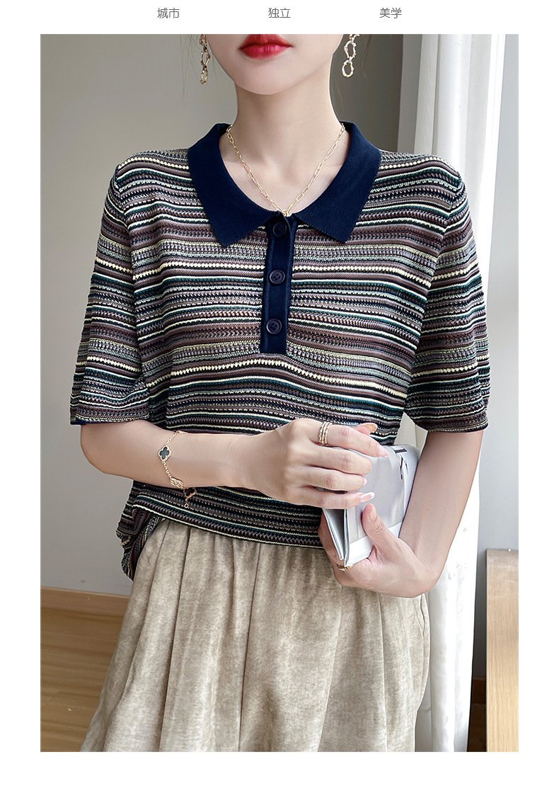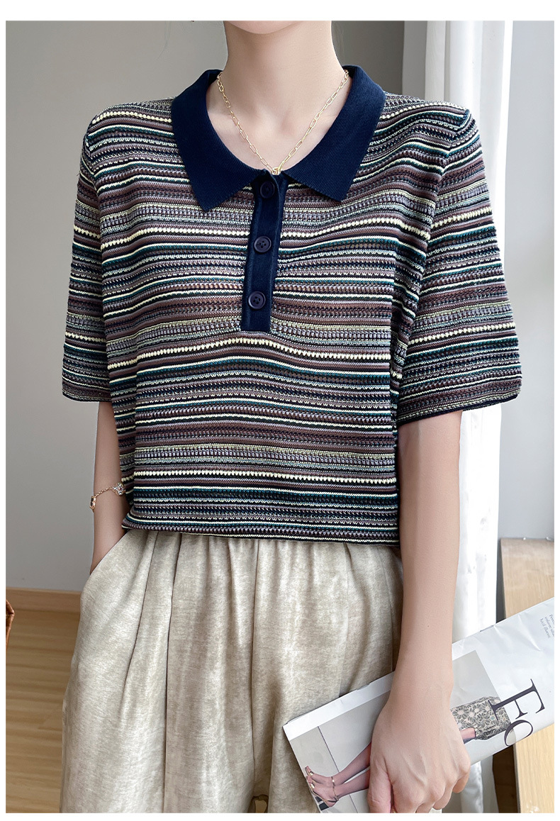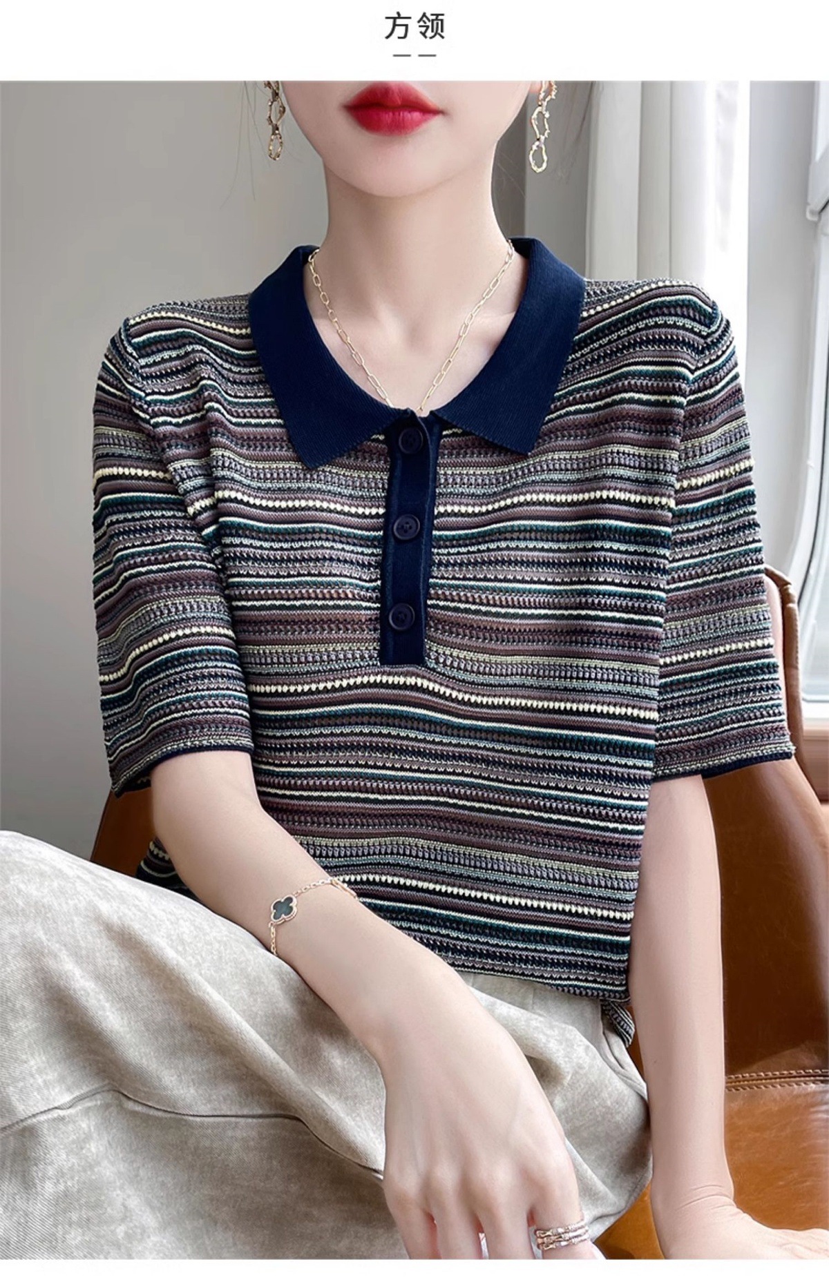 CC-XIX-179新款时尚洋气彩条短款女装夏季上衣冰丝针织短袖t恤女