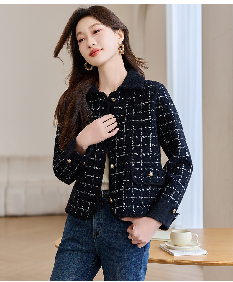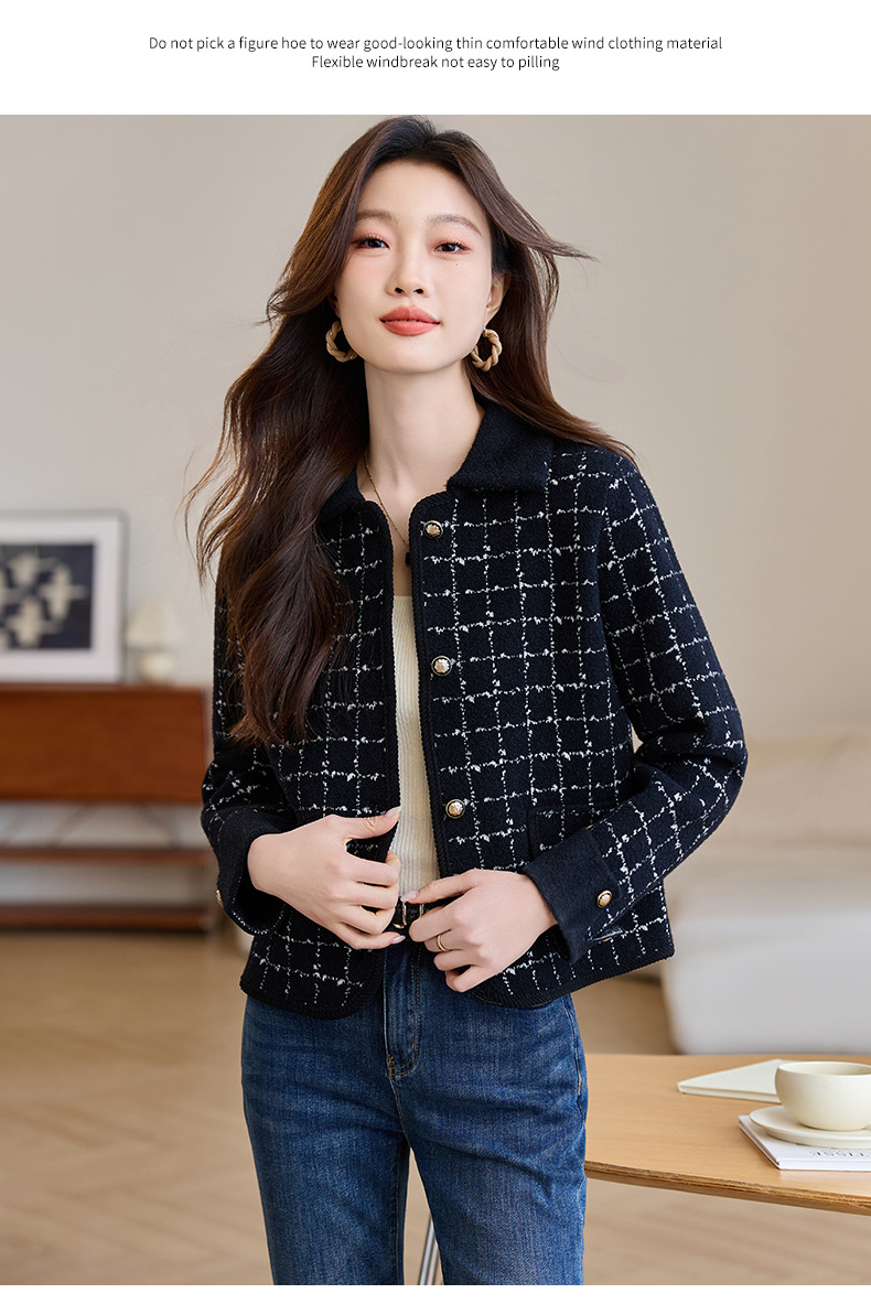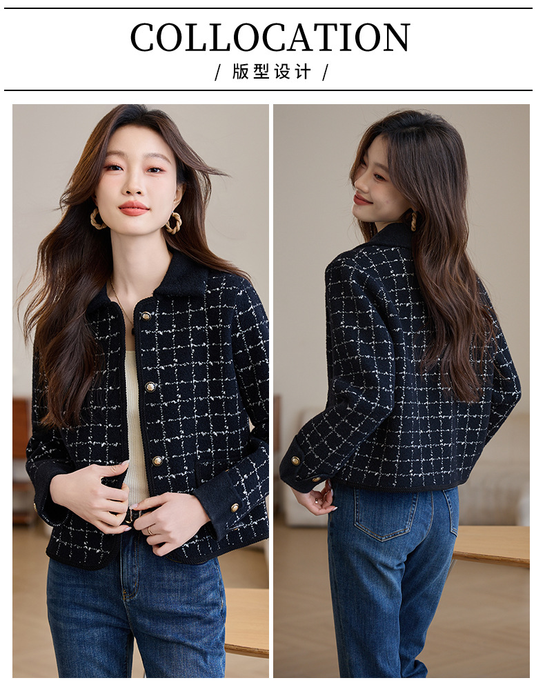 CC-XFY-2511翻领小香风外套女春秋2025新款短款气质港风翻领格子上衣开衫女