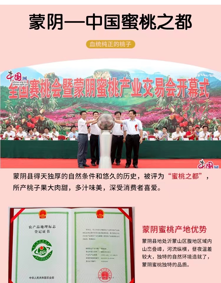 蒙阴素来有中国蜜桃之都的称号,地处沂蒙山腹地,年降雨量在820毫米,年日照时数2207个小时,年无霜期是197天,平均海拔311米,昼夜温差大,这里孕育的桃子格外香甜,也被评为中国地理标志性产物。