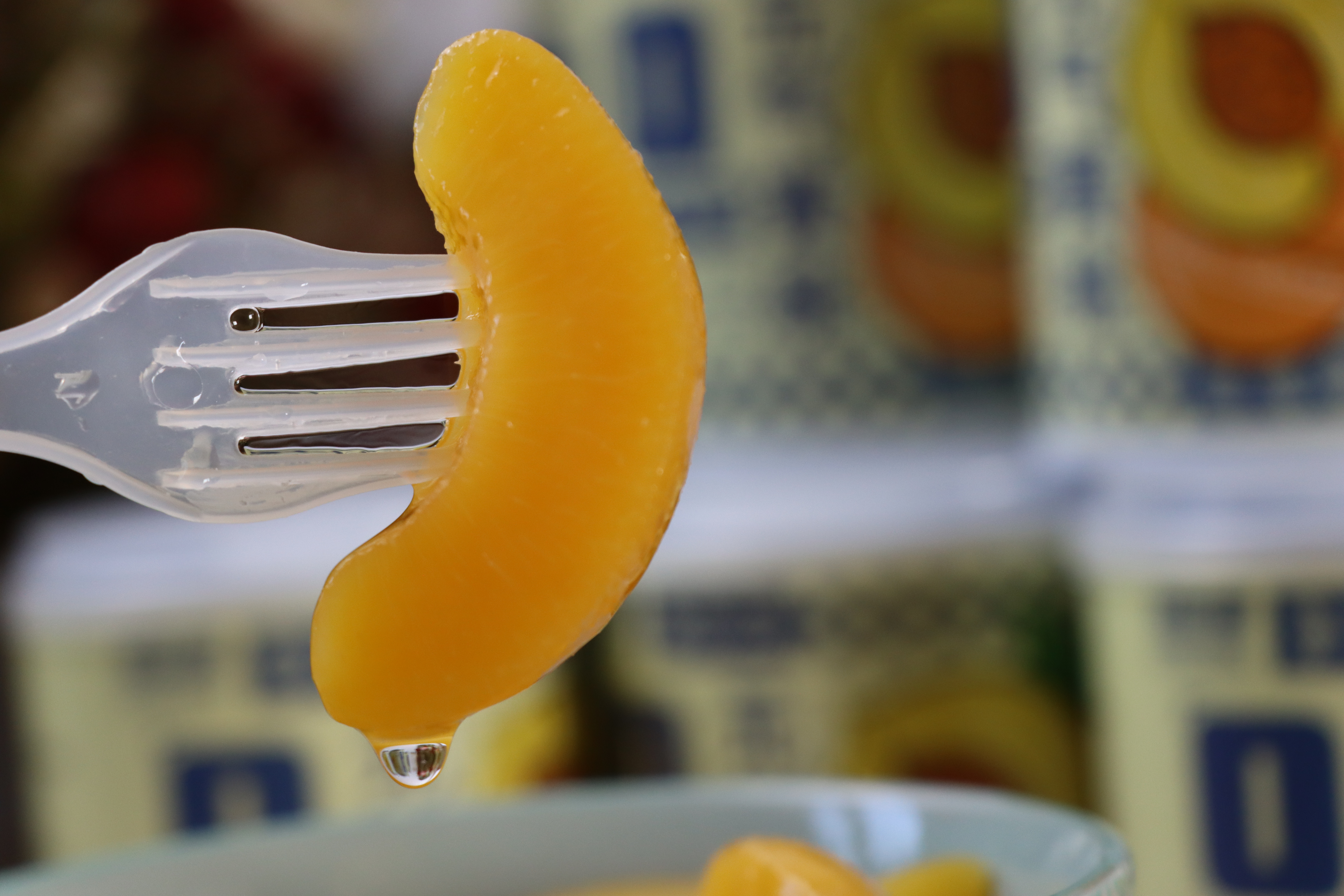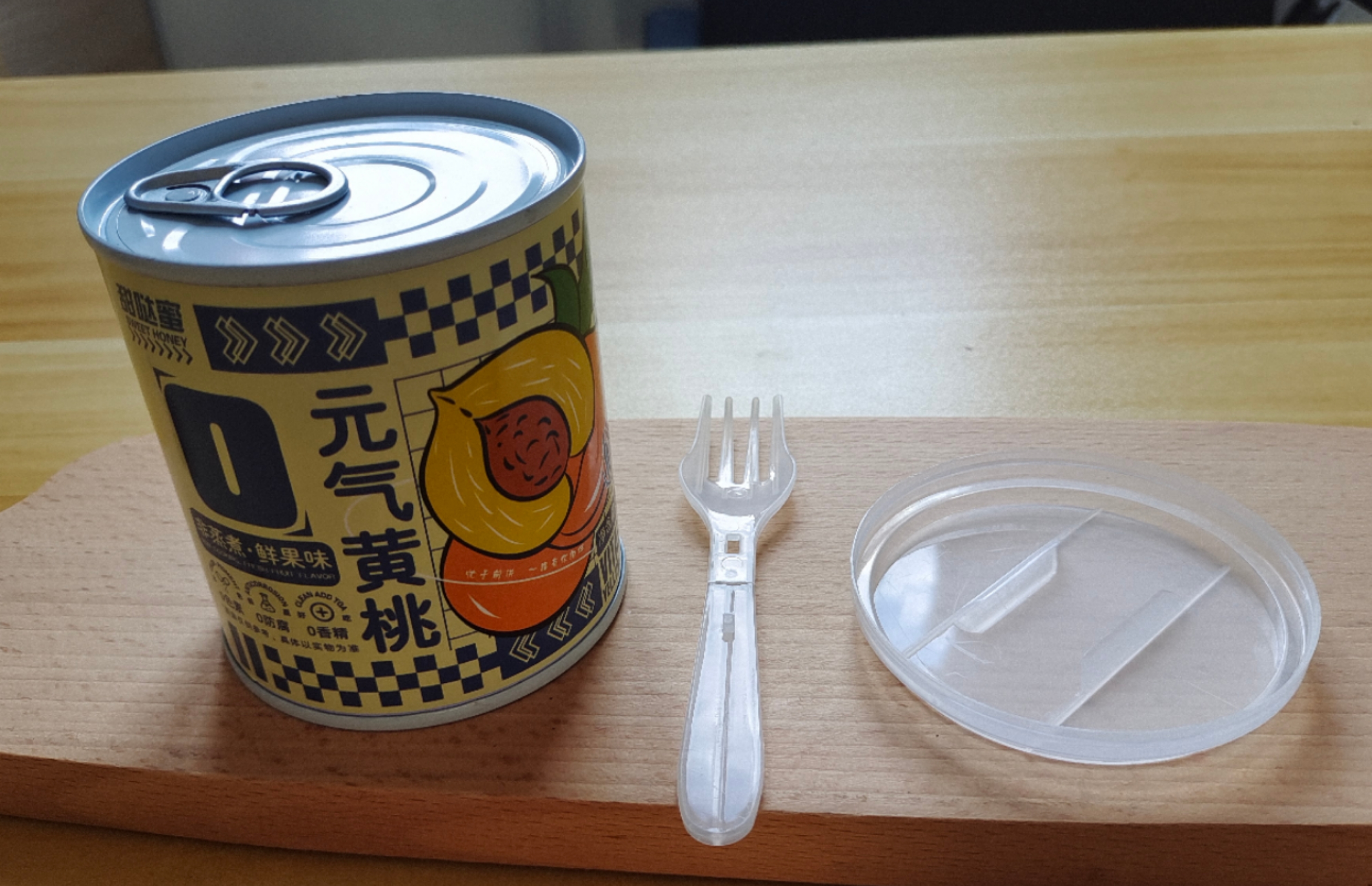 每一罐黄桃罐头都配有防尘盖和叉子,随时随地,想吃就吃。