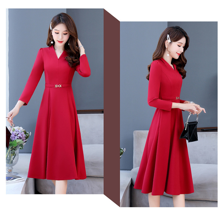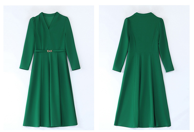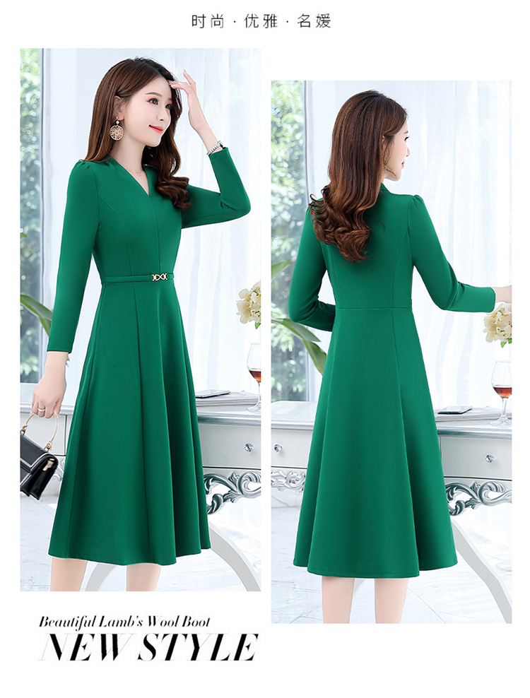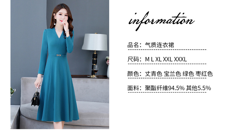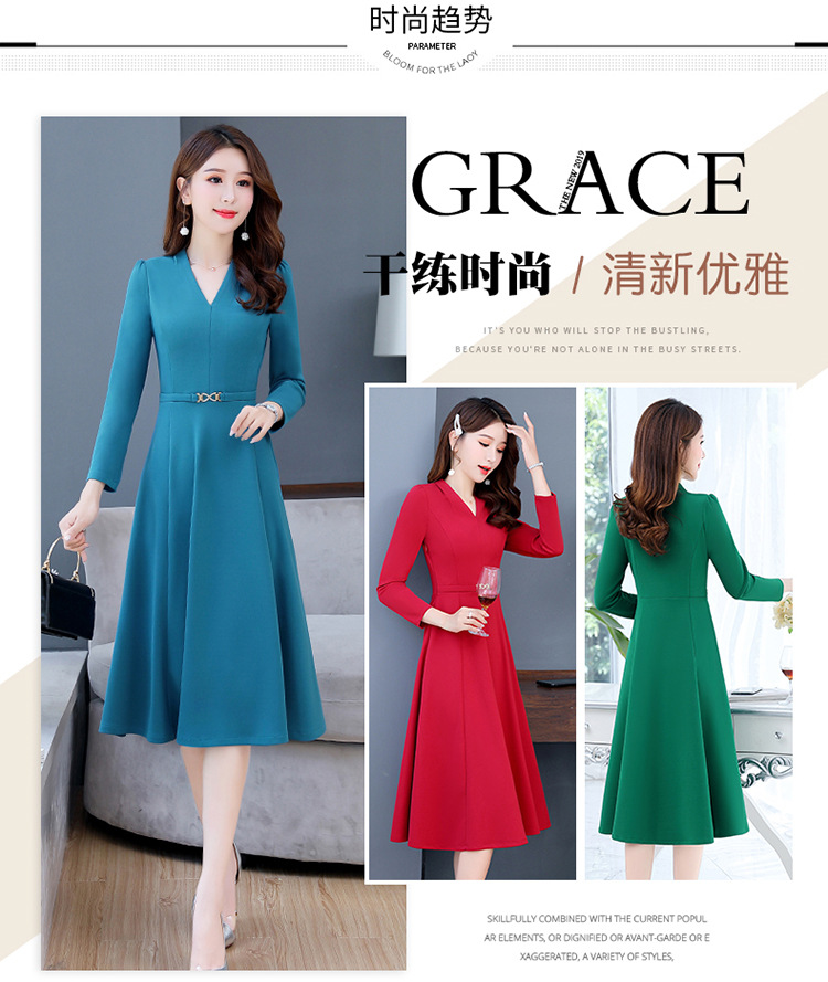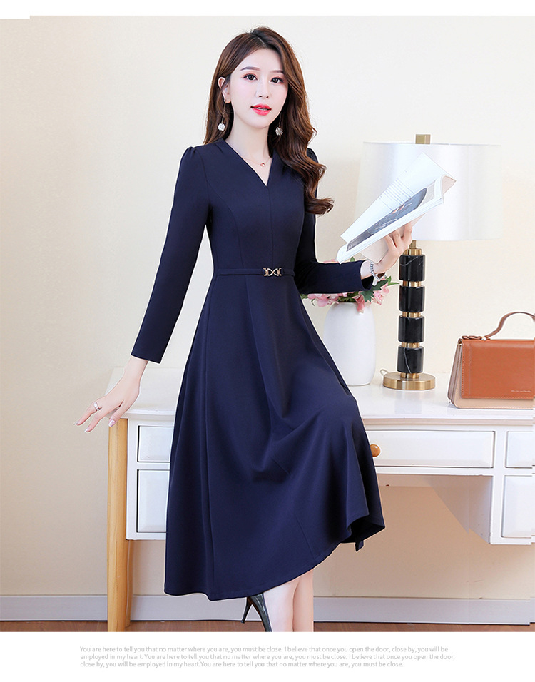 HR-WX20329时尚百搭气质通勤优雅V领长袖气质中长款修身显瘦连衣裙
