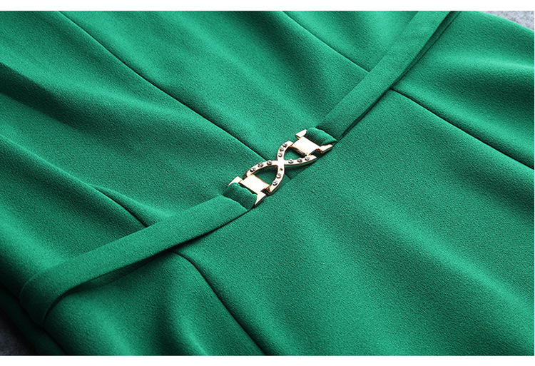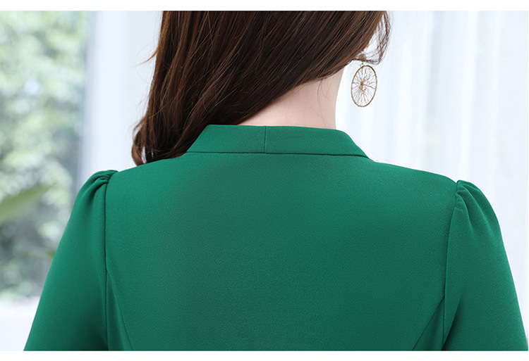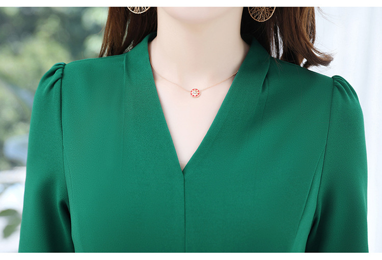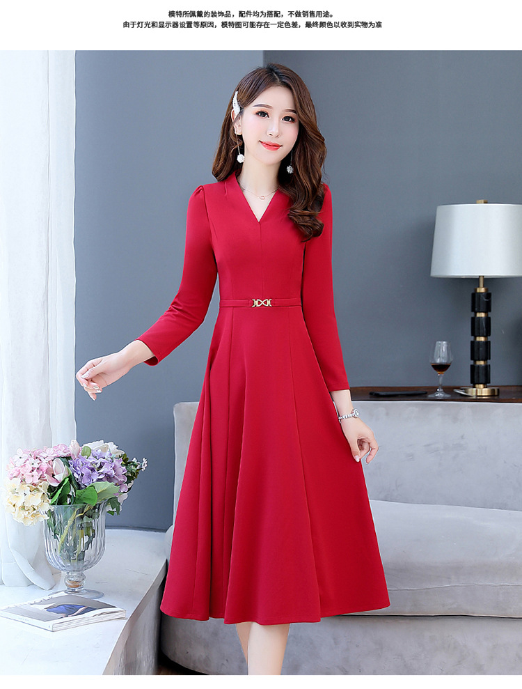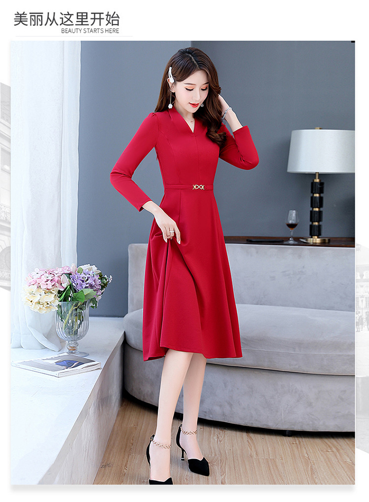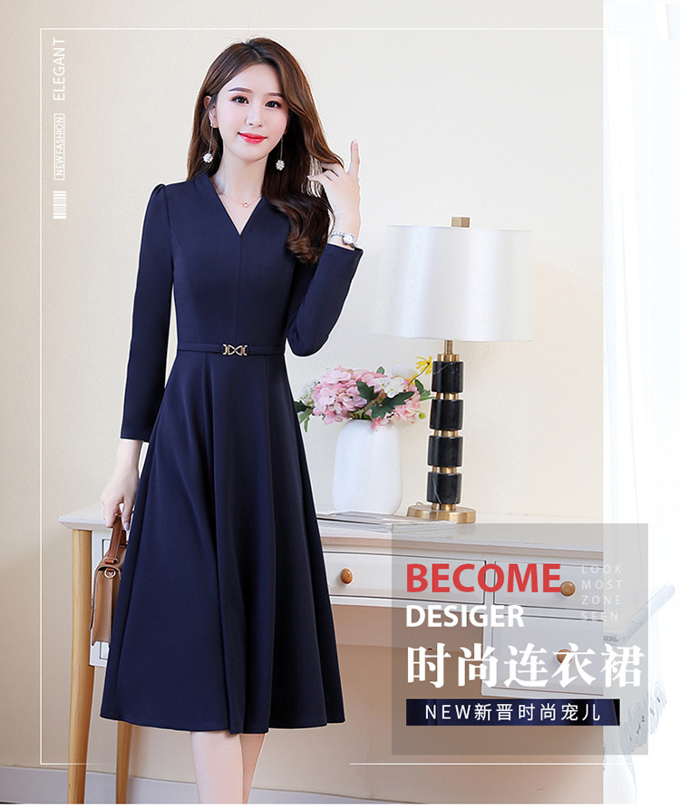 HR-WX20329时尚百搭气质通勤优雅V领长袖气质中长款修身显瘦连衣裙