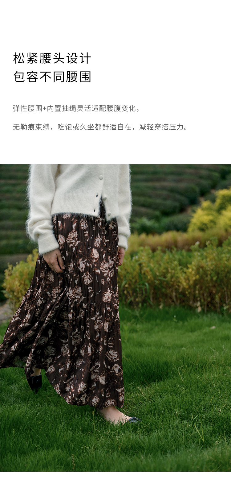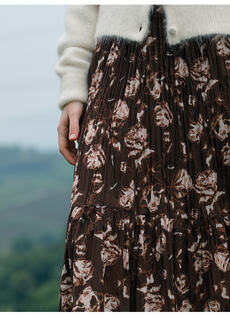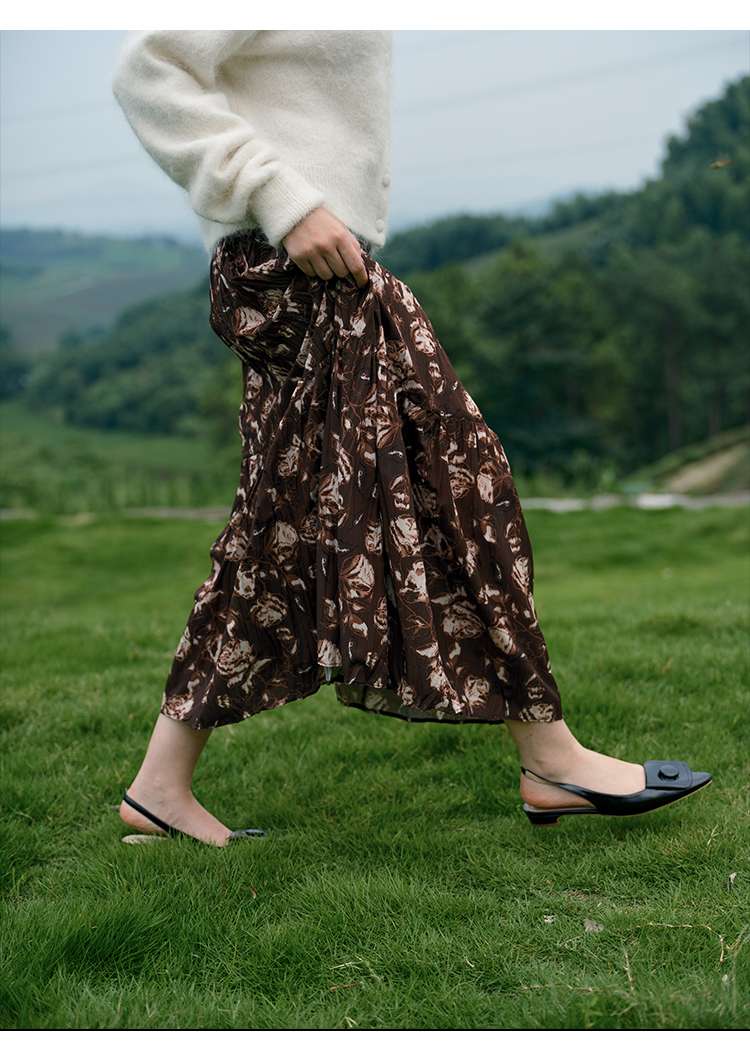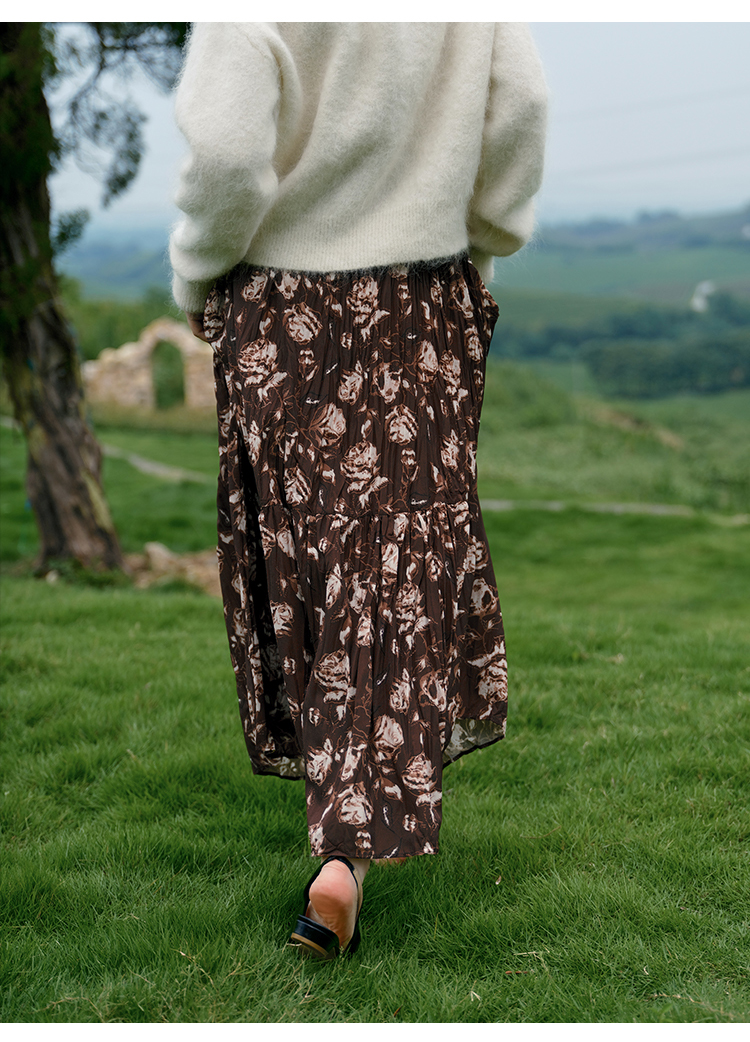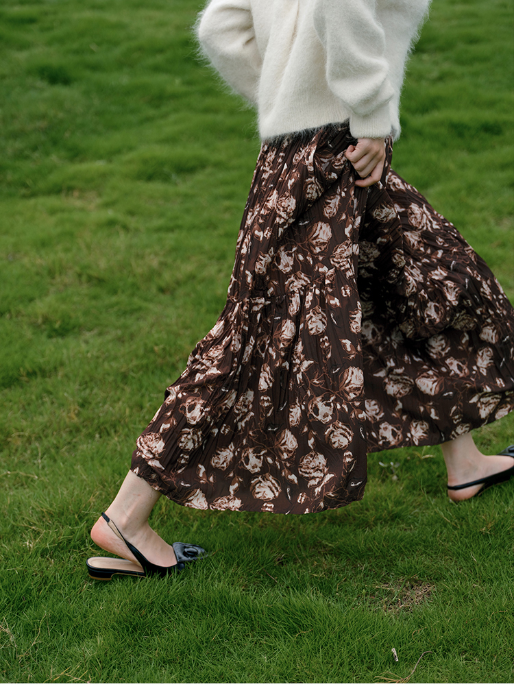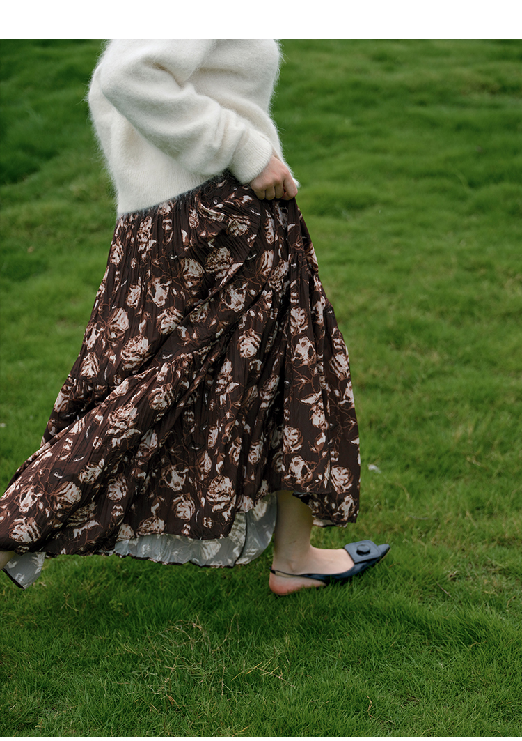 HeyDress松紧腰压褶印花拼接半身裙