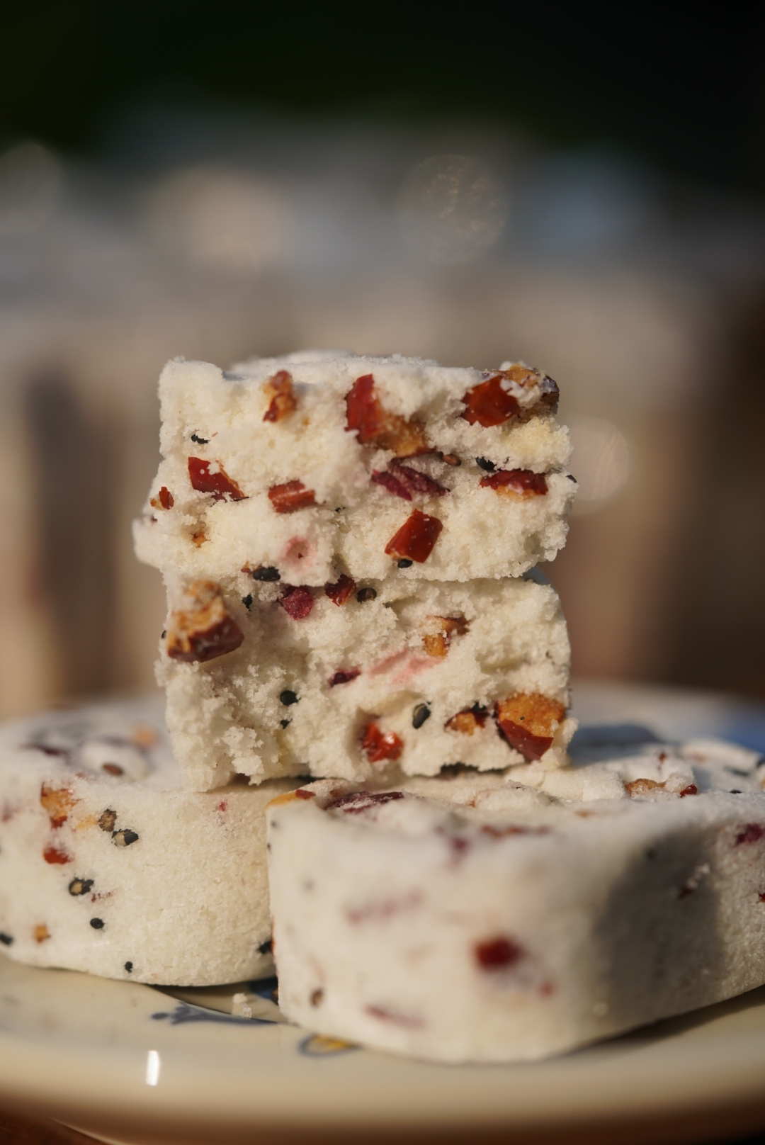 红枣山药八珍糕,名字听起来就有种十全十美的高贵之气。它的配方可是来头不小,源于400年前宫廷秘方,是根据《外科正宗》里的八珍糕改良而来的。将原方的食材做了优化改良为:山药、茯苓、芡实、莲子、薏米、山楂、白扁豆、麦芽等。另外还添加了葡萄干、黑芝麻、蔓越莓调和口味。