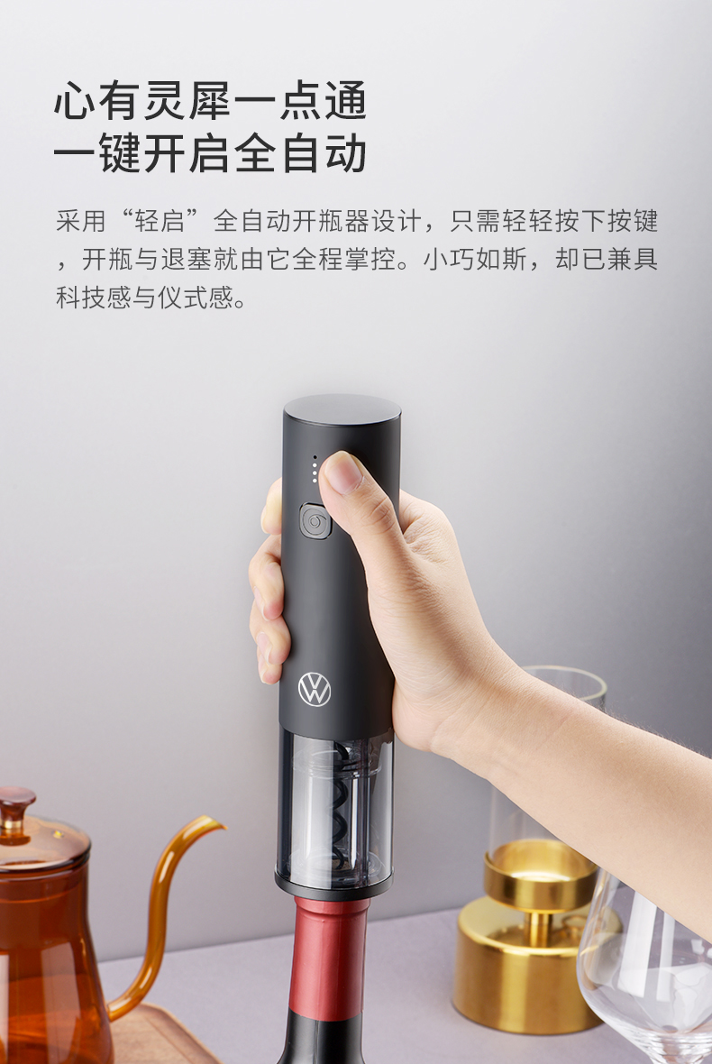 采用“轻启”全自动开瓶器设计,只需轻轻按下按键,开瓶与退塞就由它全程掌控。小巧如斯,却已兼具科技感与仪式感。