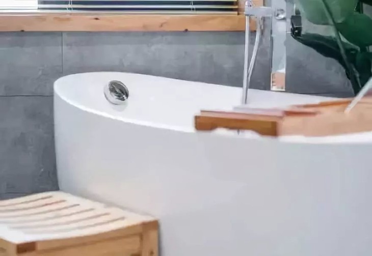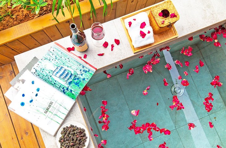 躺在浴缸里,透过窗户便能看到树林茂密,但这似乎还不够,两盘巨大绿植又给房间内添加了十足野趣。