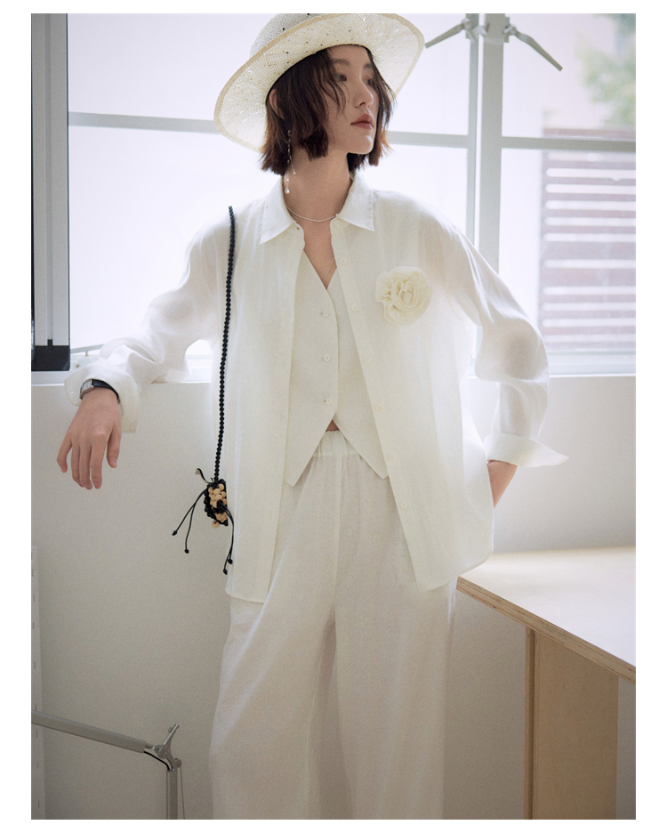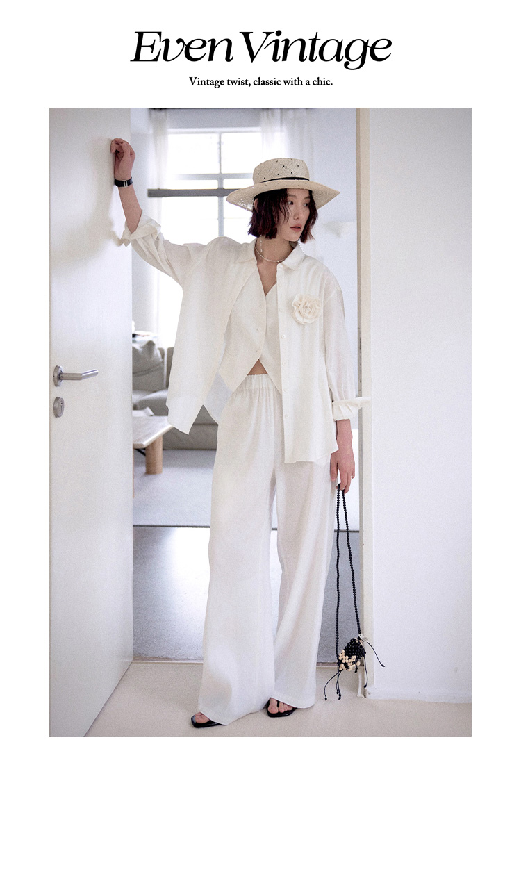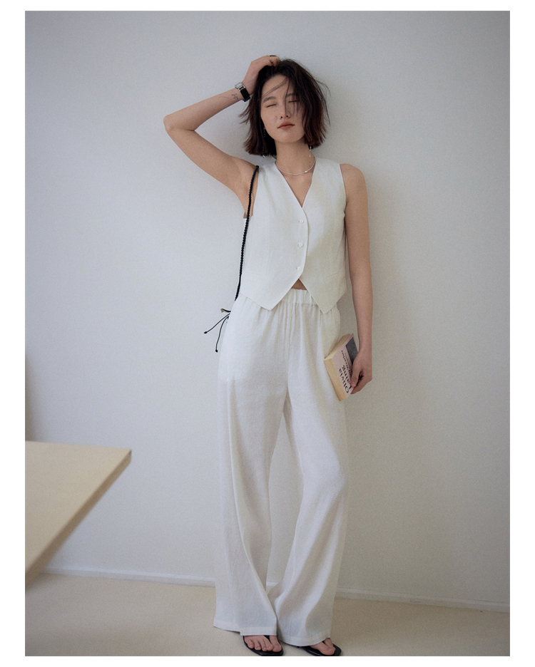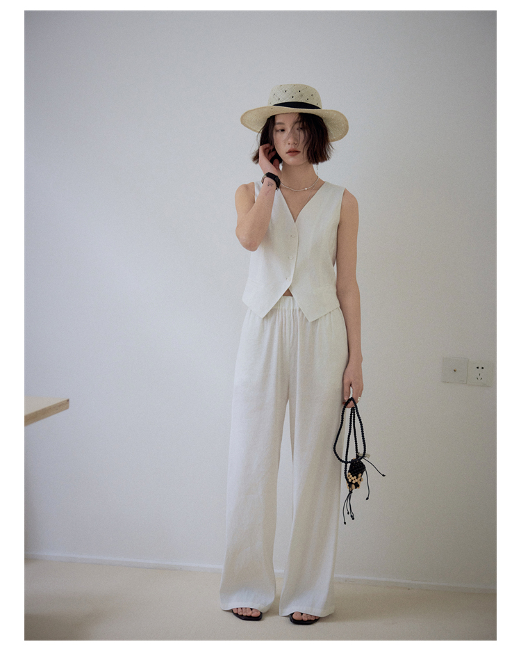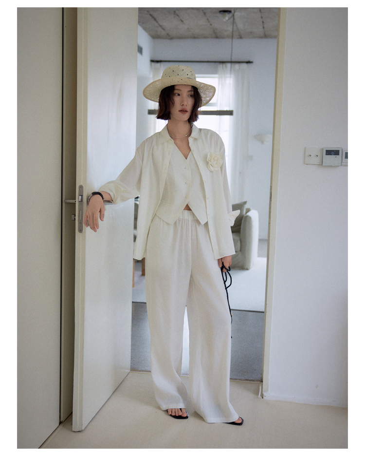 Even Vintage|亚麻混纺 简约宽松基础衬衫清爽感马甲白色长裤套装