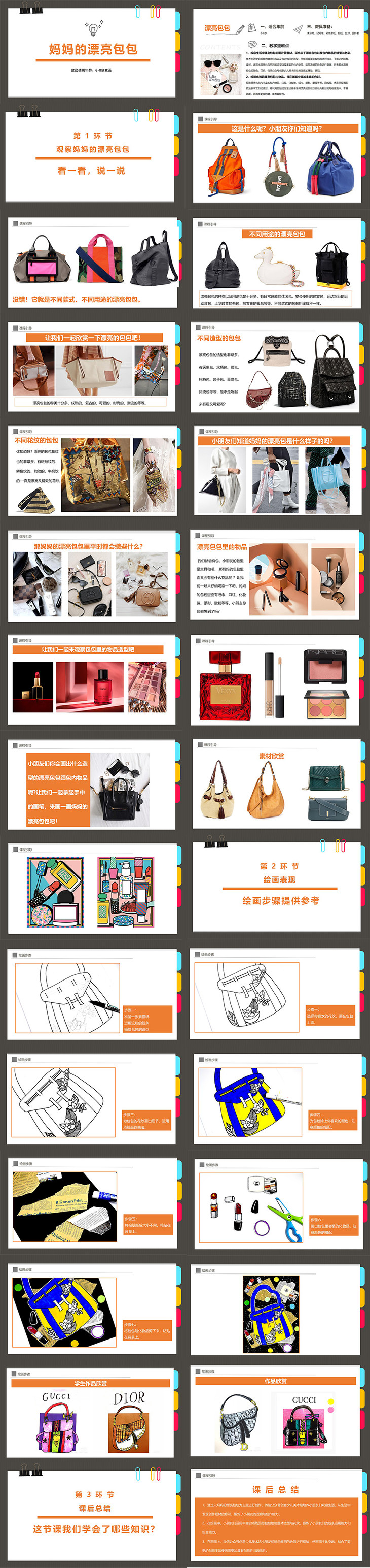参考生活中妈妈背的漂亮包包以及包内物品的造型,仔细观察漂亮包包的外形特点,了解它的造型、纹样,表现出漂亮包包不同的造型以及丰富的包内物品,运用流畅的线条进行刻画,并表现出漂亮包包的颜色、花纹,让画面更加精致、美观。
