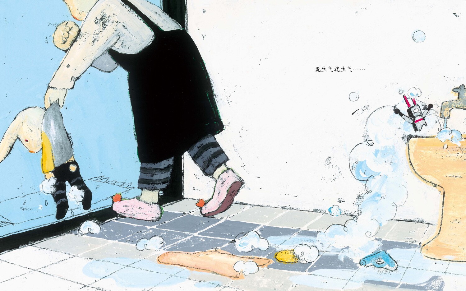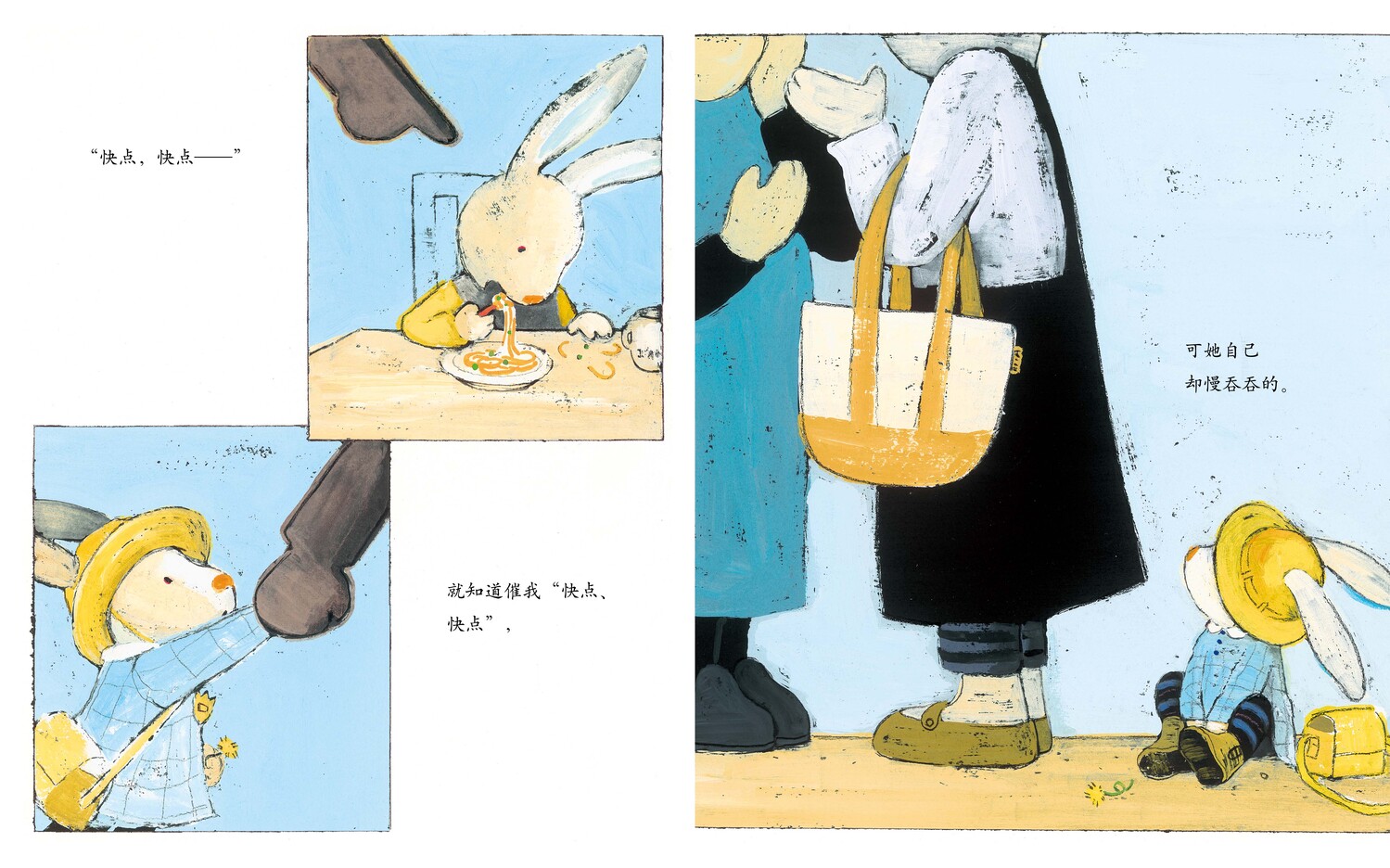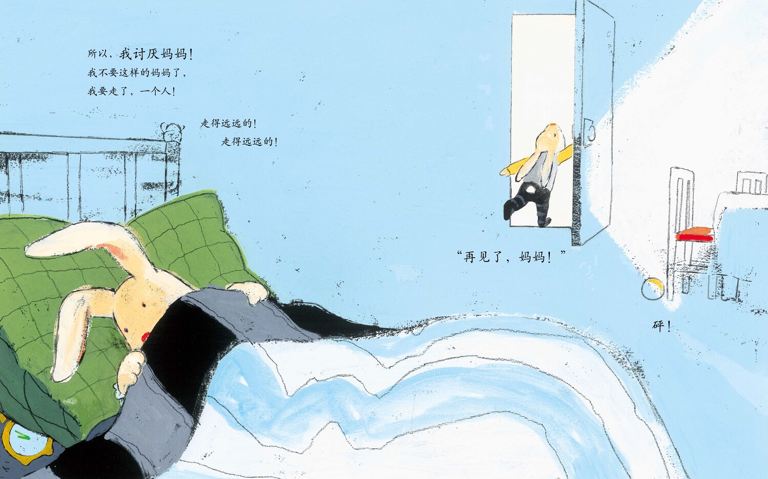 《我讨厌妈妈》中,小兔子对妈妈满满的爱用一种看似抗议的方式发作出来,他的每个抱怨与气嘟嘟的表情都在衬托他对妈妈的情感与期待。——童书工作者黄筱茵
