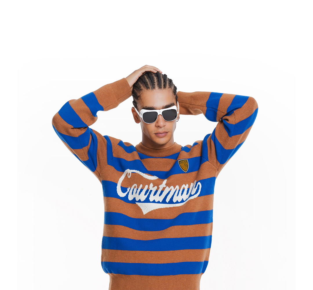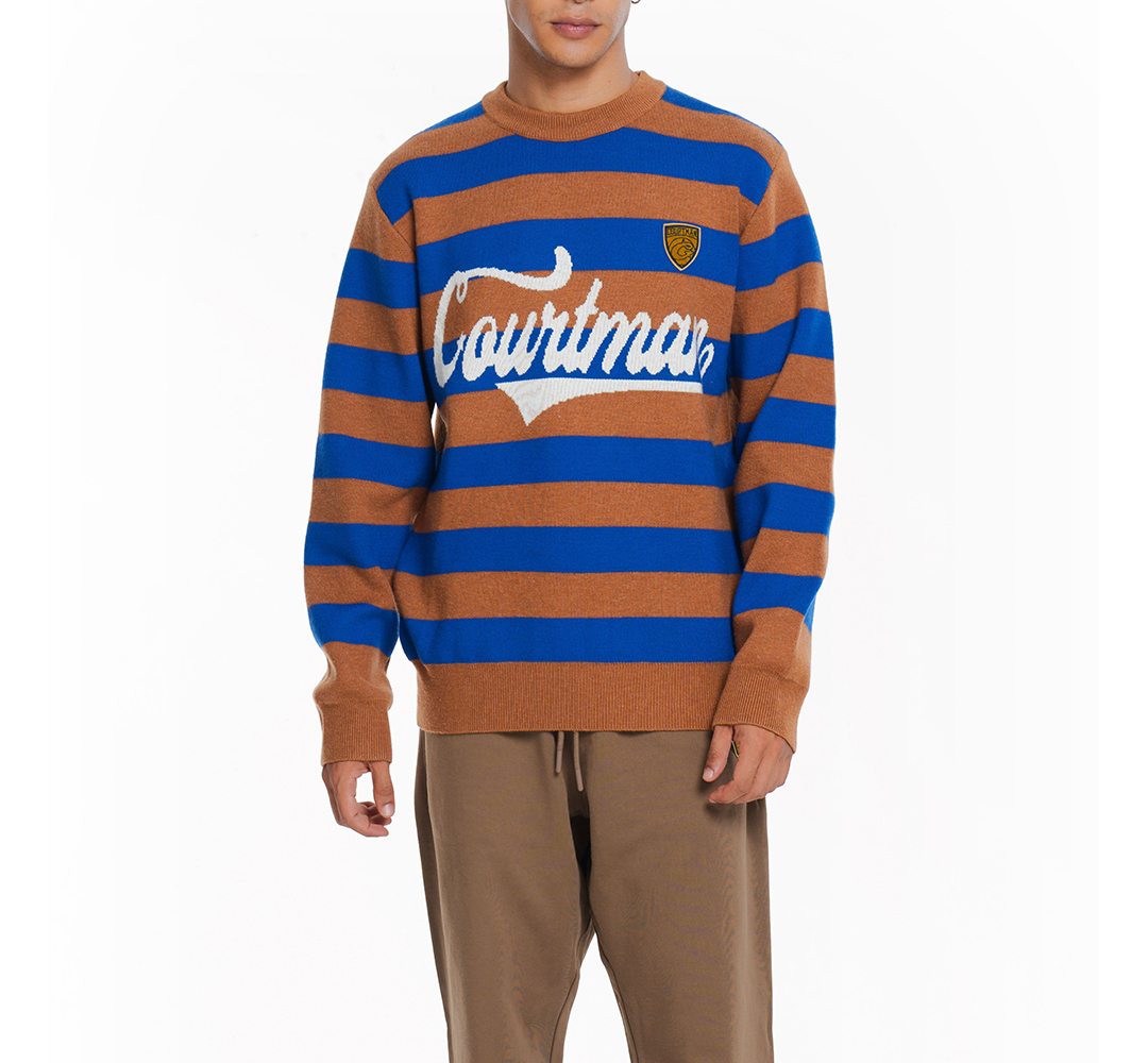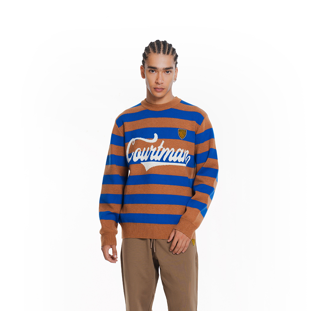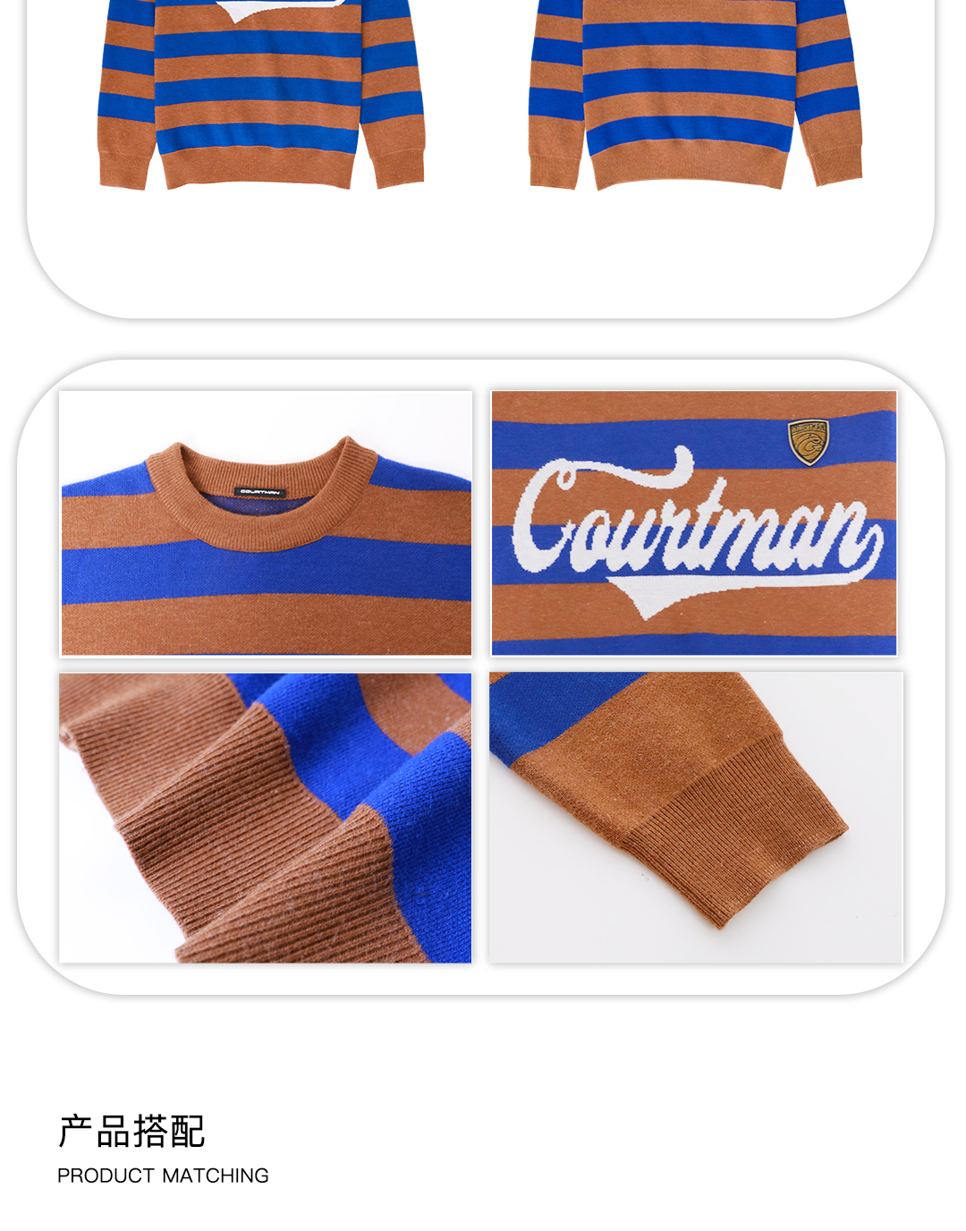 COURTMAN野球帝 美式复古上衣徽章字母条纹圆领毛衣宽松针织衫男