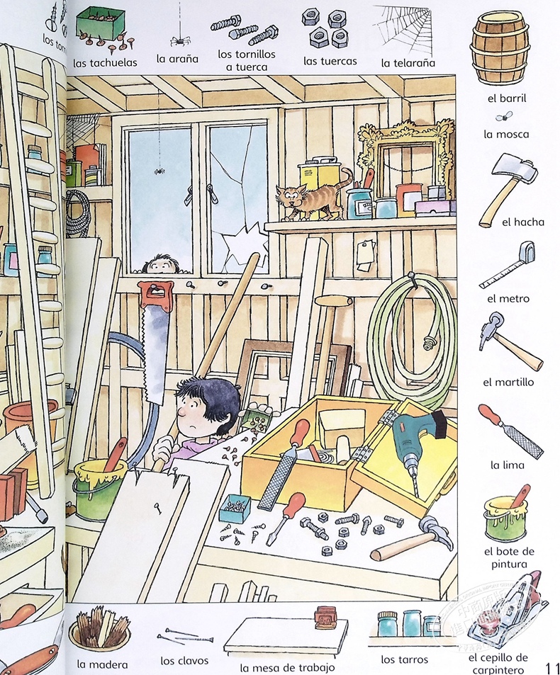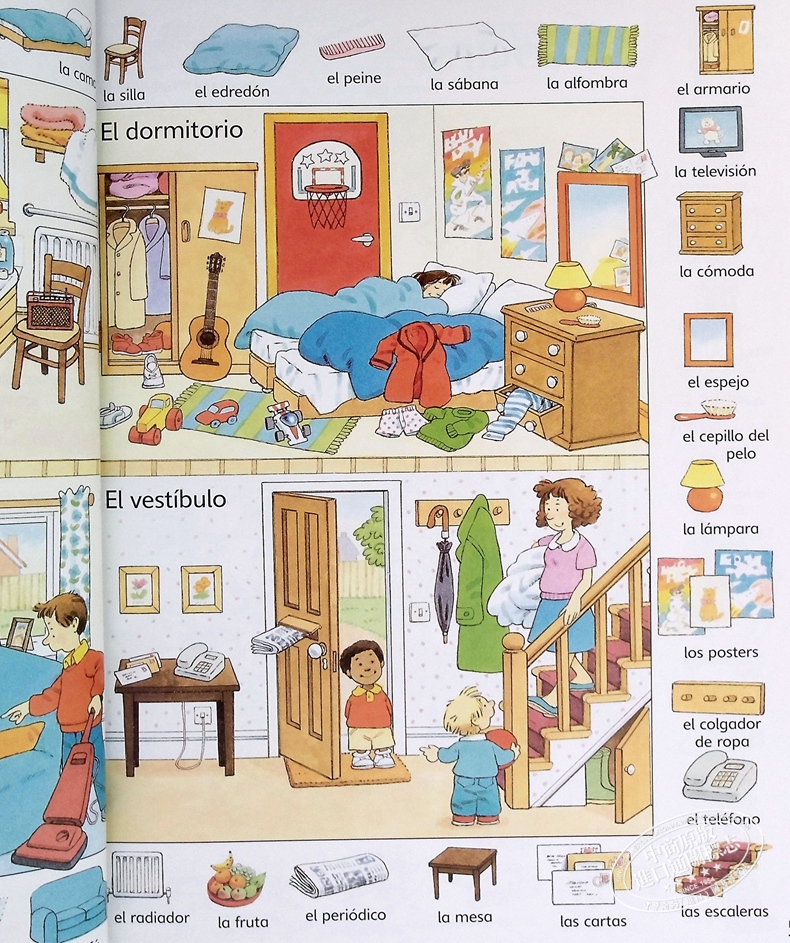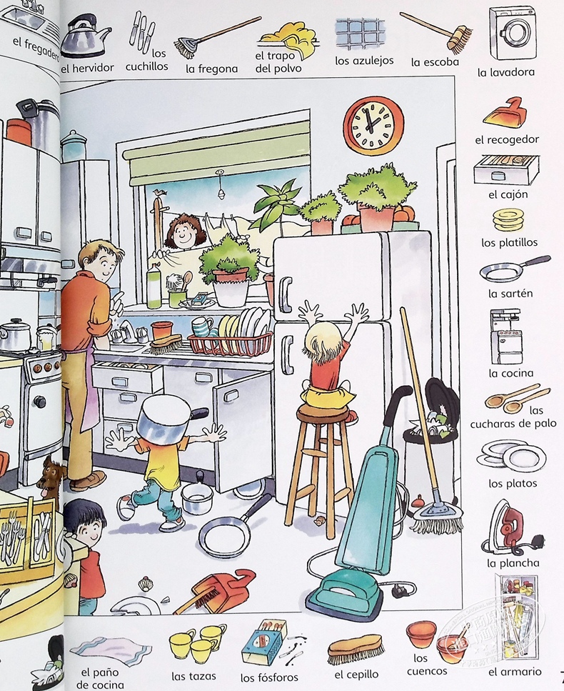 The classic Usborne word book as a bi-lingual Spanish/English edition, illustrated by Stephen Cartwright. A thousand everyday words illustrated with busy scenes and labelled pictures to help children learn key Spanish vocabulary.
