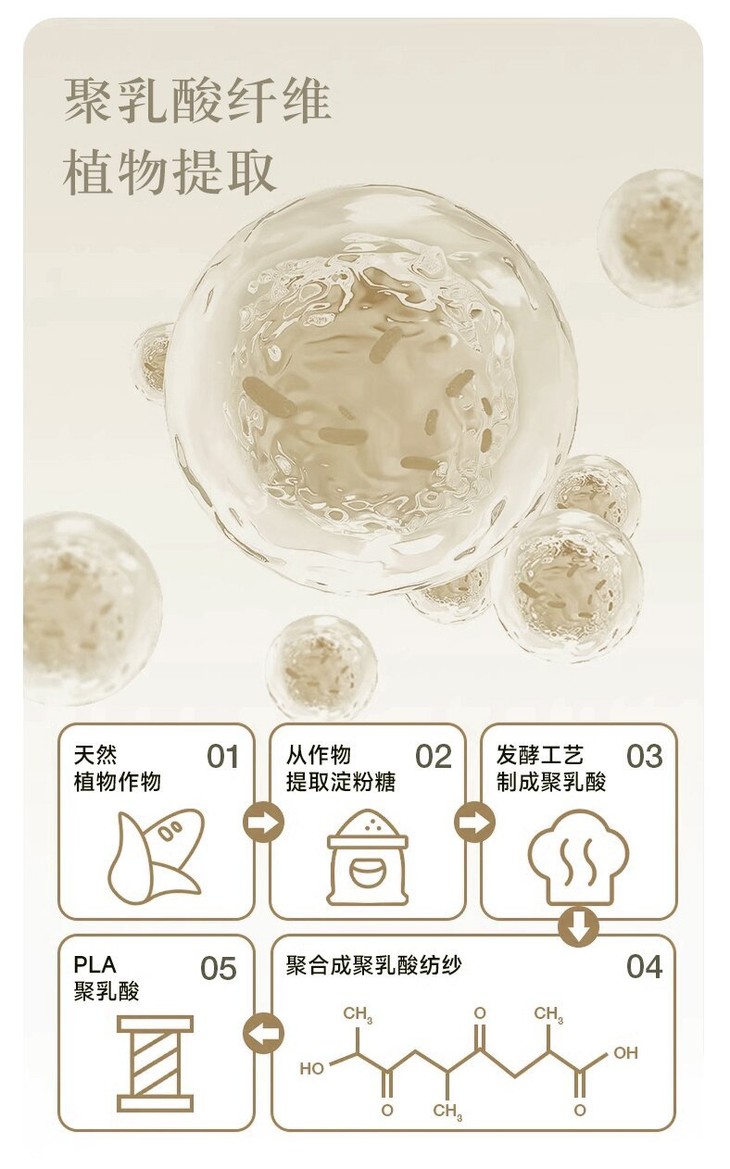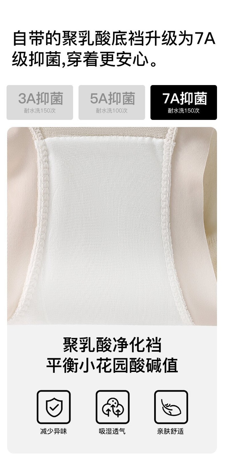 聚乳酸是一种环保且生物相容性好的材料 它具有良好的吸湿透气性和抗菌性能。 作为内裤的裆部材料,聚乳酸净化裆能有效防止细菌滋生,保持私处清洁健康