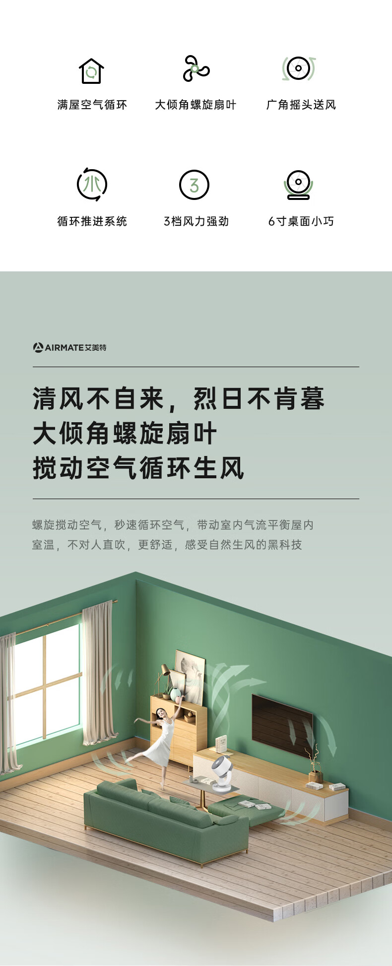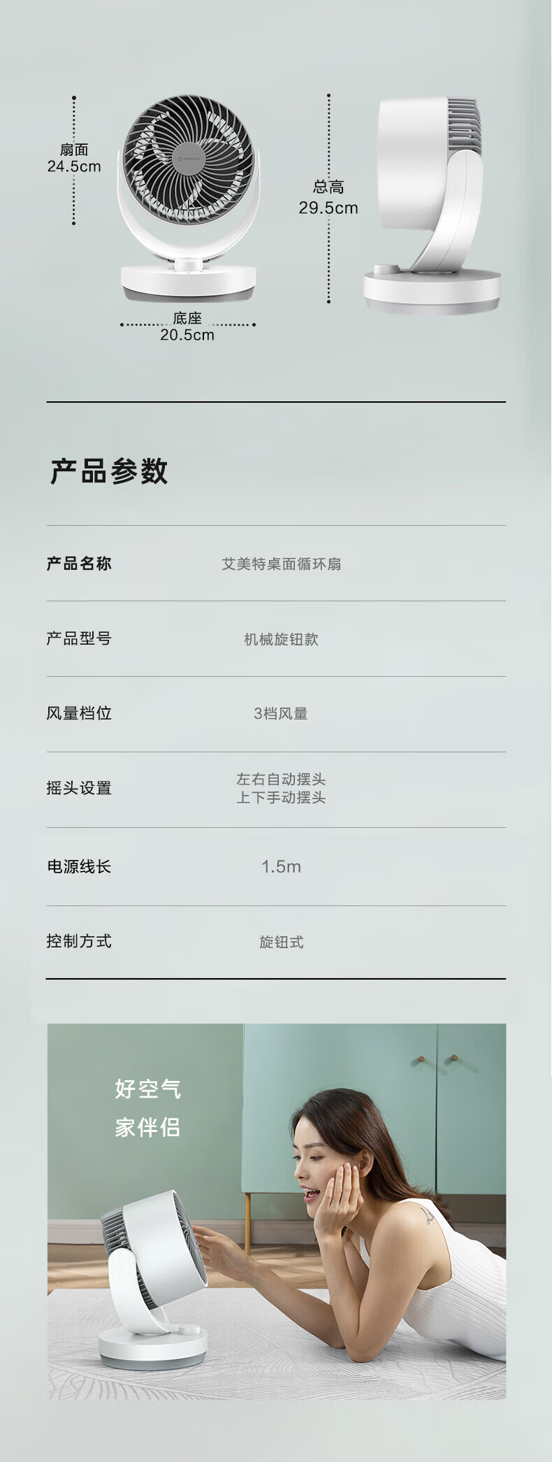艾美特(AIRMATE)空气循环扇家用节能电风扇四季循环对流小风扇大风量卧室宿舍台式摇头轻音空调伴侣 CA15-X28