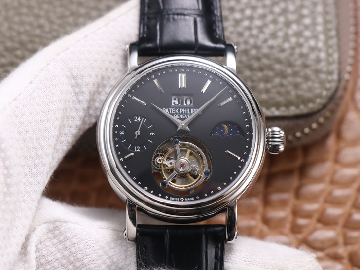 [AX]百达翡丽(大日期顯示)。(GMT显示)[拳头]月相星辰顶级手动同轴陀飞轮机芯 原装折叠扣Lin手动上链机械!雕花透底,316钢壳 烧钢蓝指针,直径42mm.厚度12.5mm,42小時储蓄动力双面蓝宝石玻璃 意大利真皮原装蝴蝶扣