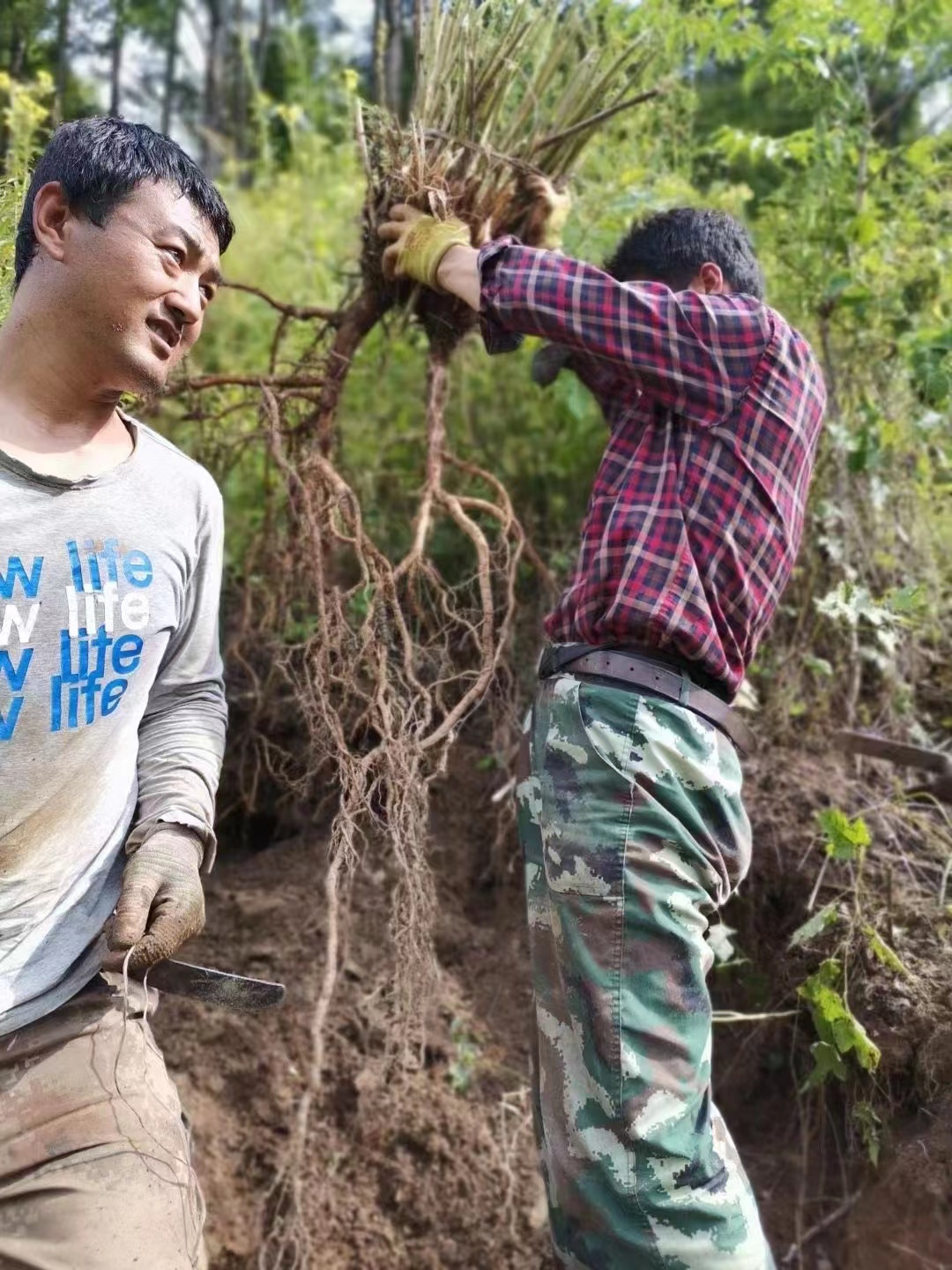 野生黄芪采挖后,其表皮纹路多、粗糙,出土后带有很多泥土,用山泉水清洗表皮,冲洗掉泥土
