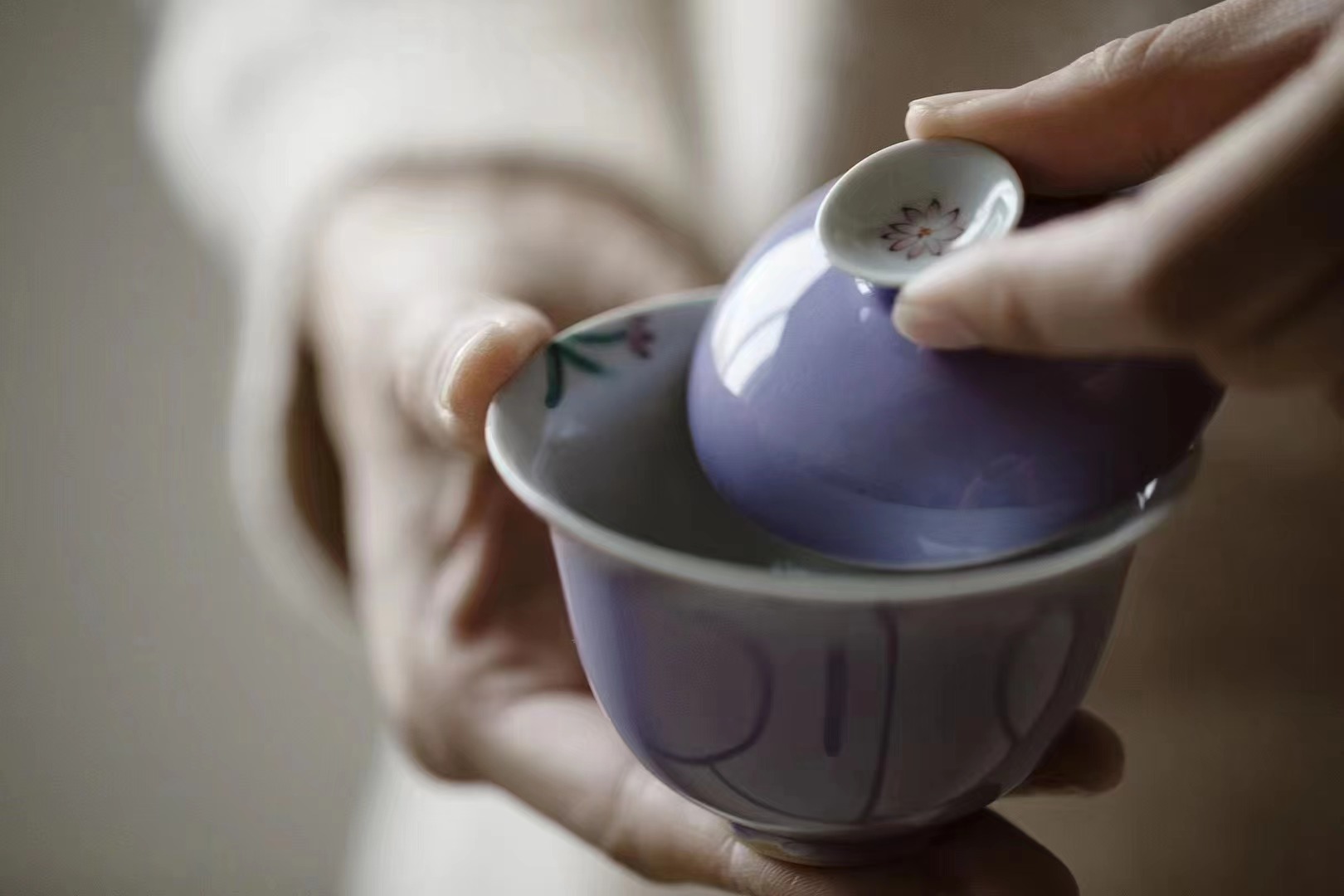 束刻/无落木槿紫花田错/福灵盖碗口径8.5cm 高6.6cm 容量120ml 原矿釉精工手绘彩蝶盖碗文人雅玩茶碗二才盖碗功夫茶具泡茶碗敬茶碗8g岩茶专用碗薄胎不烫手
