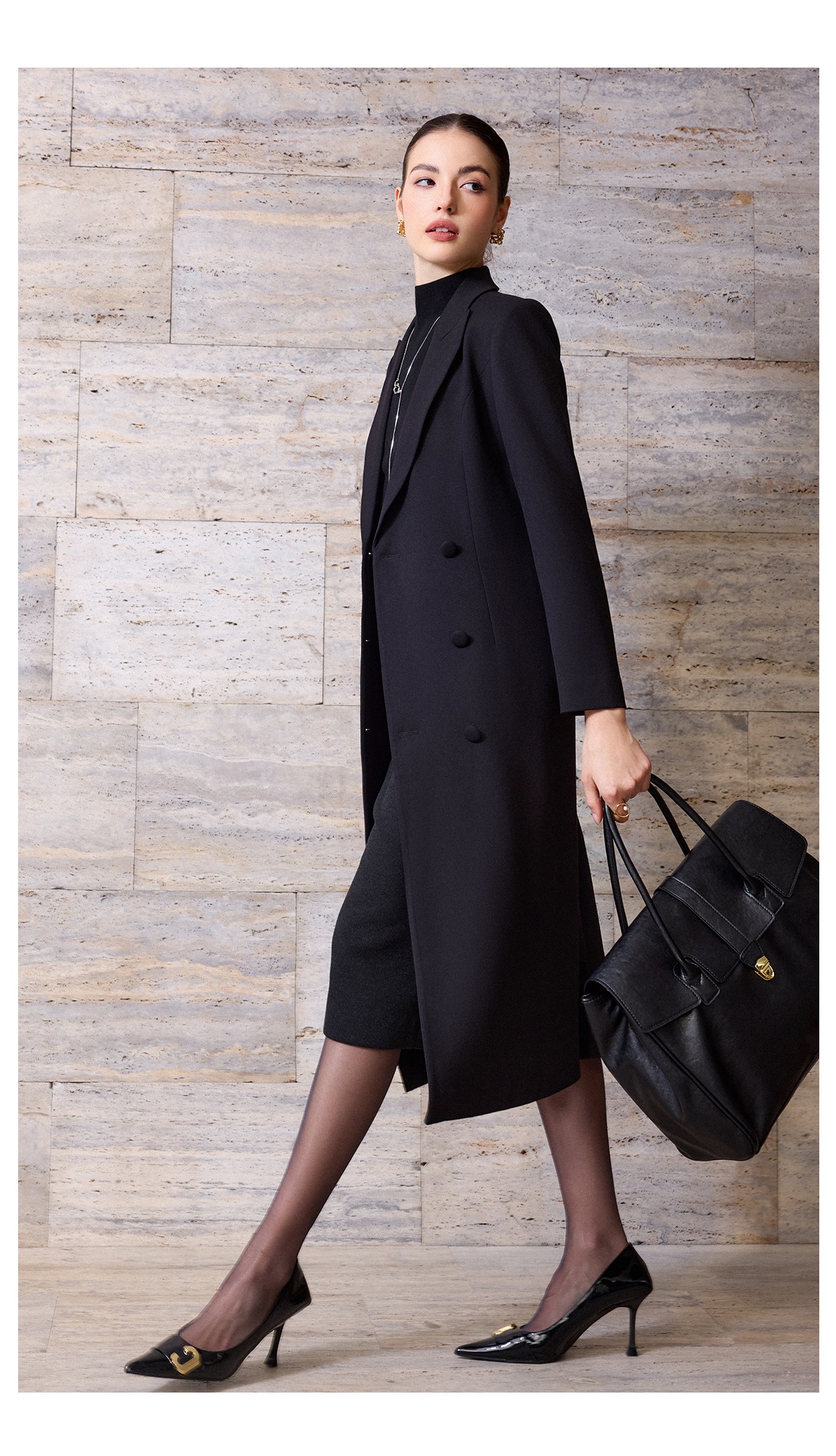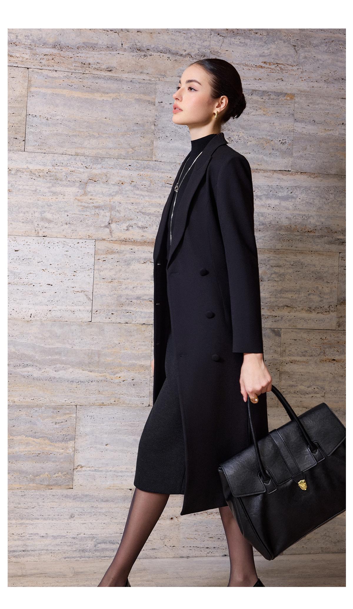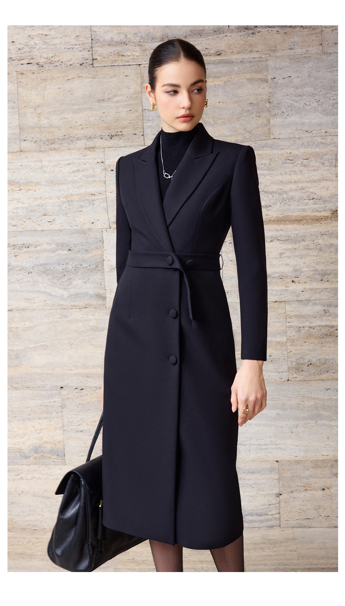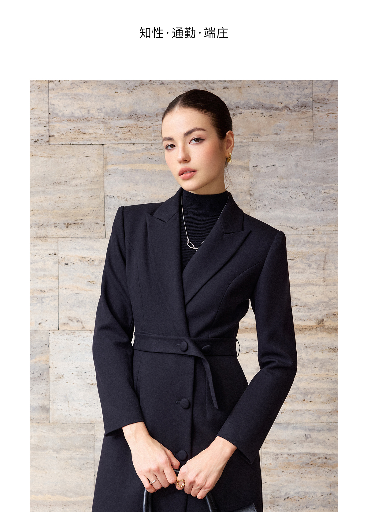 IWY/轻熟简约风黑色毛呢大衣女秋冬中长款收腰职业气质通勤外套C2571-B