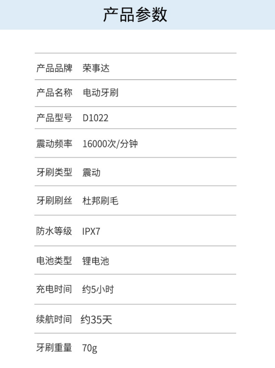 【产品名称】:荣事达家用便携式USB充电电动牙刷