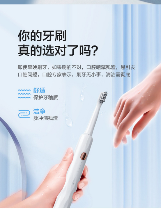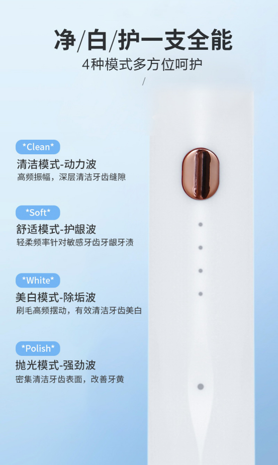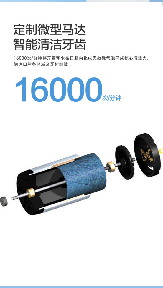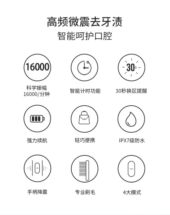 1.高频微震去牙渍,智能呵护口腔,科学振幅,16000/分钟