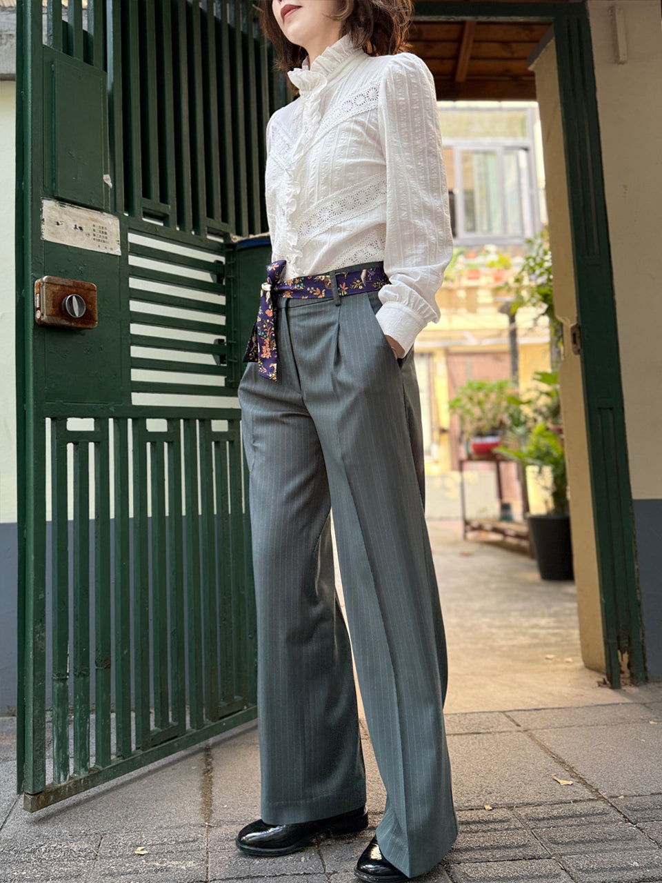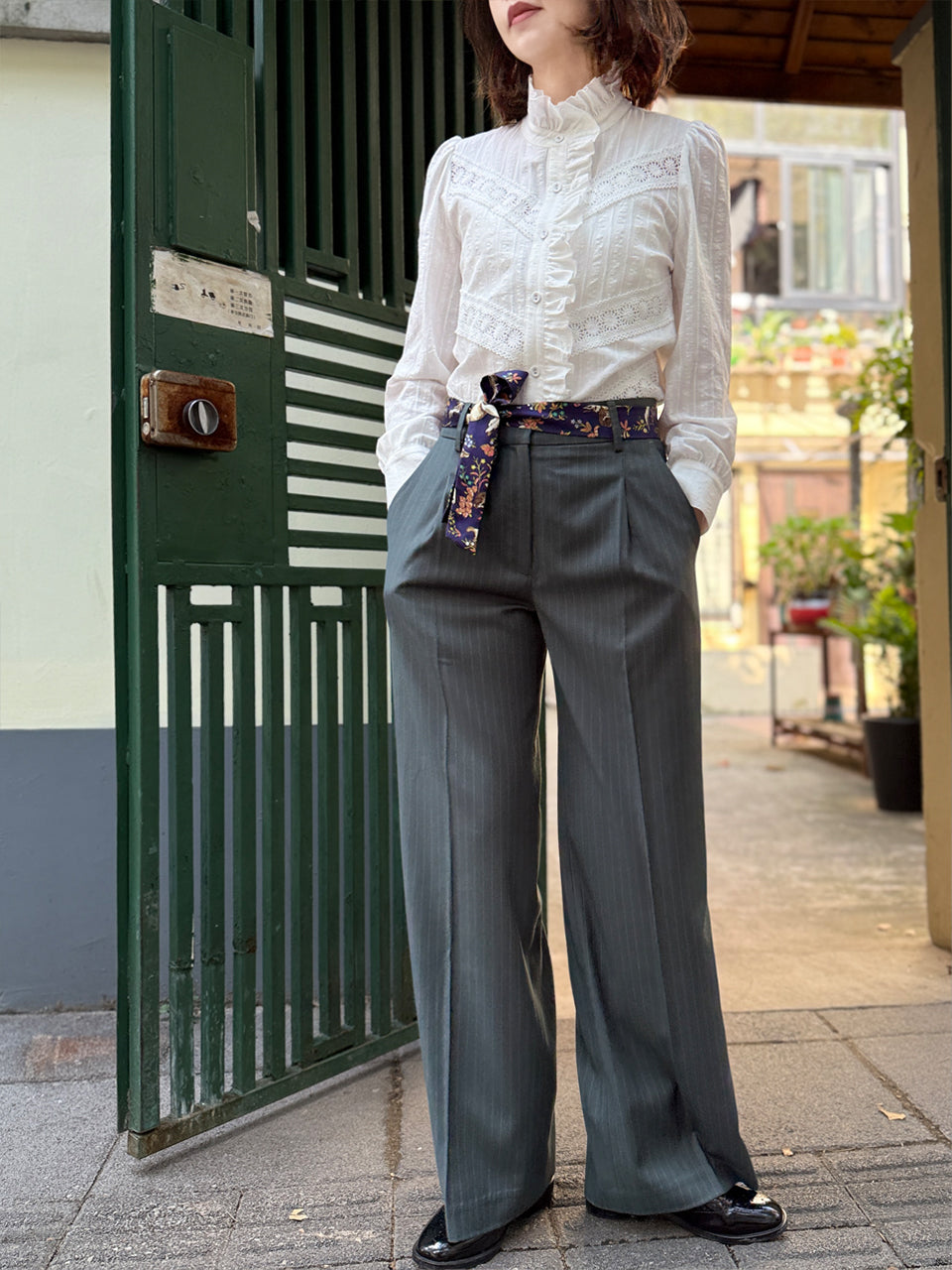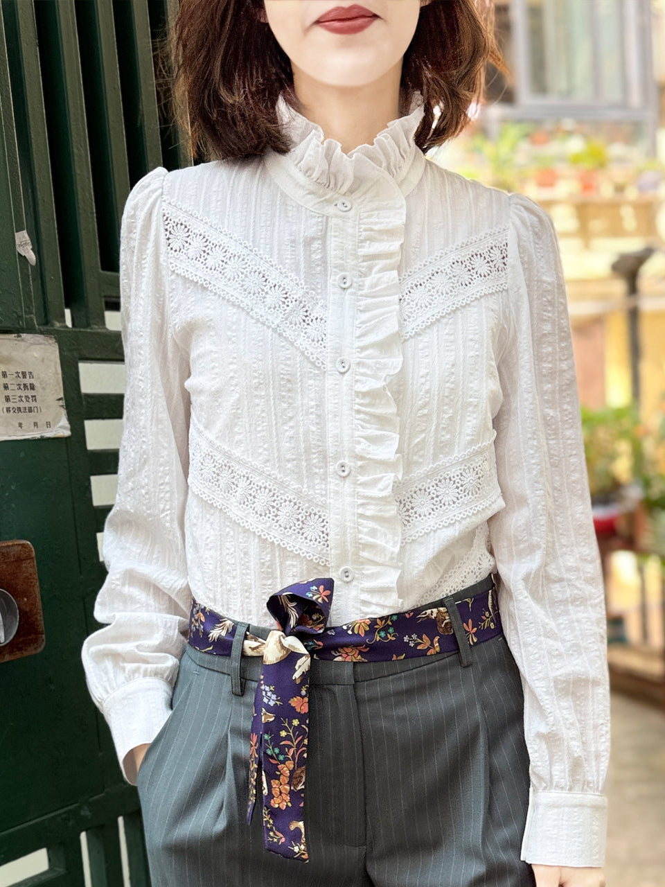 TYNVIE 木耳边领圈拼接长袖上衣-蓝条纹