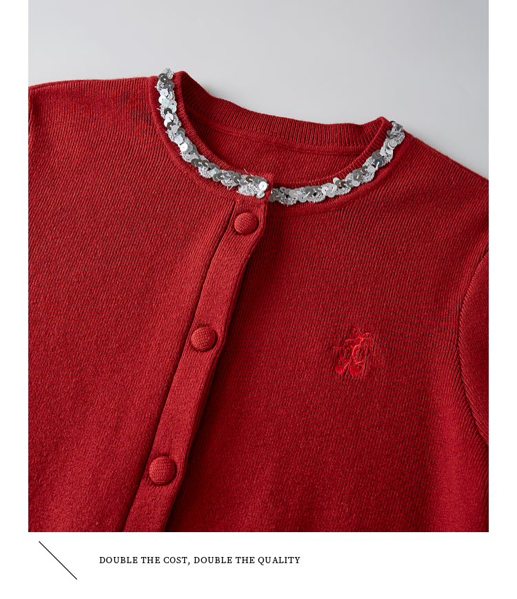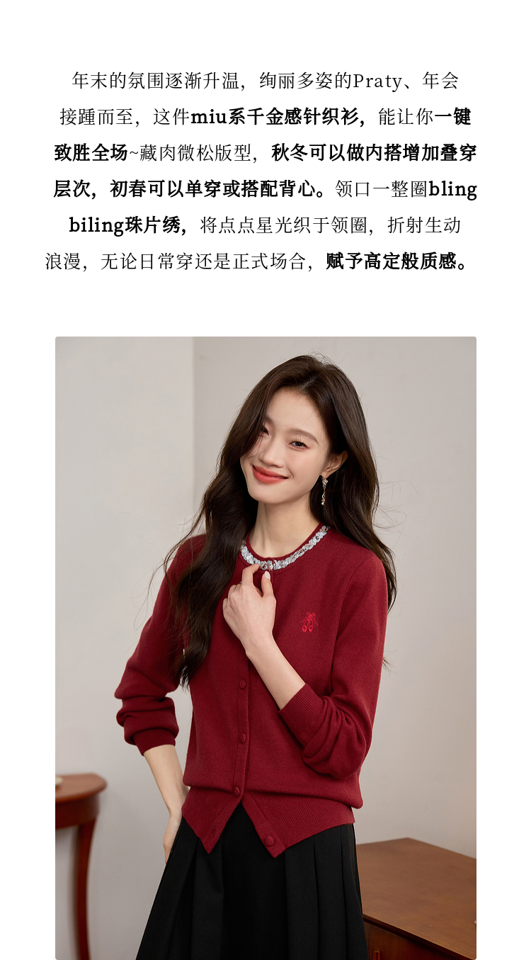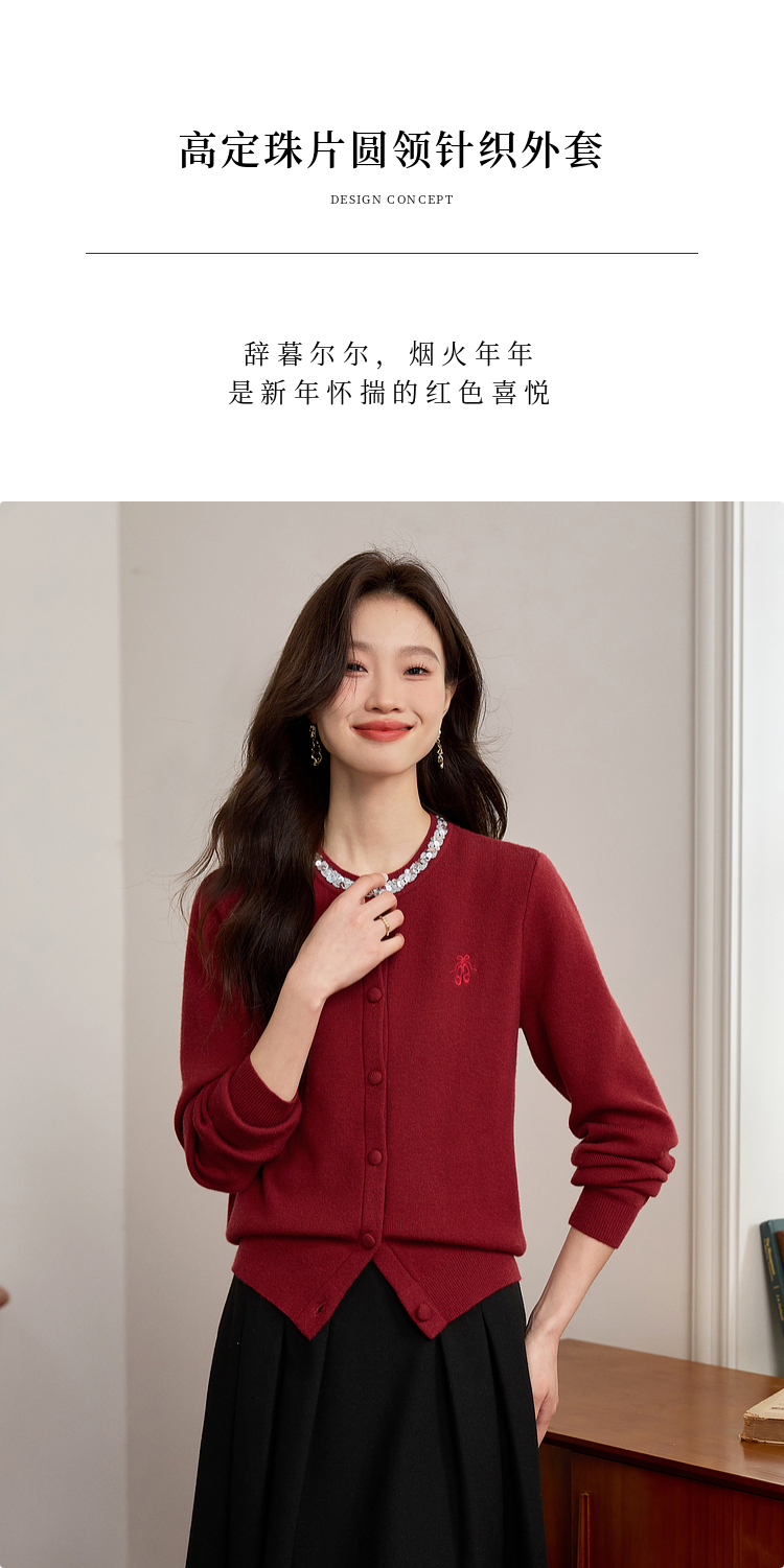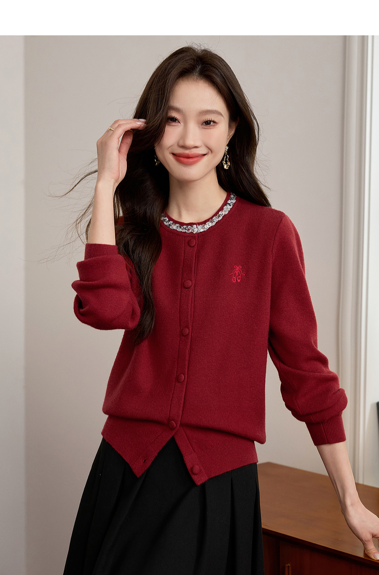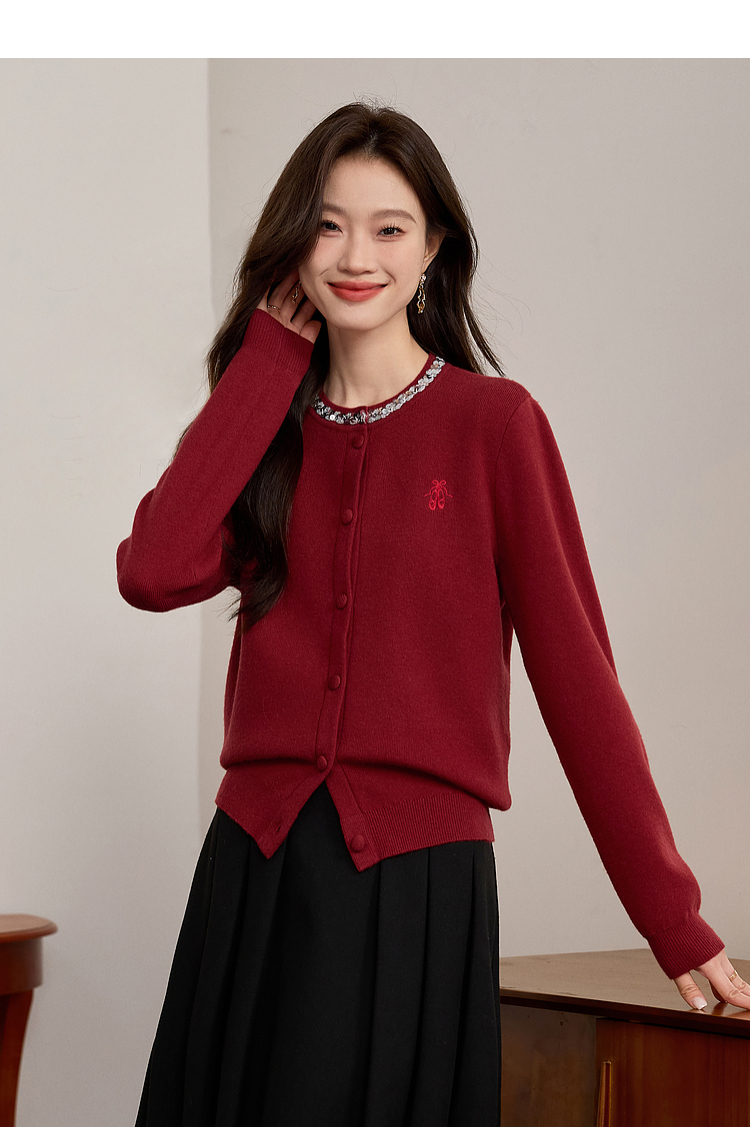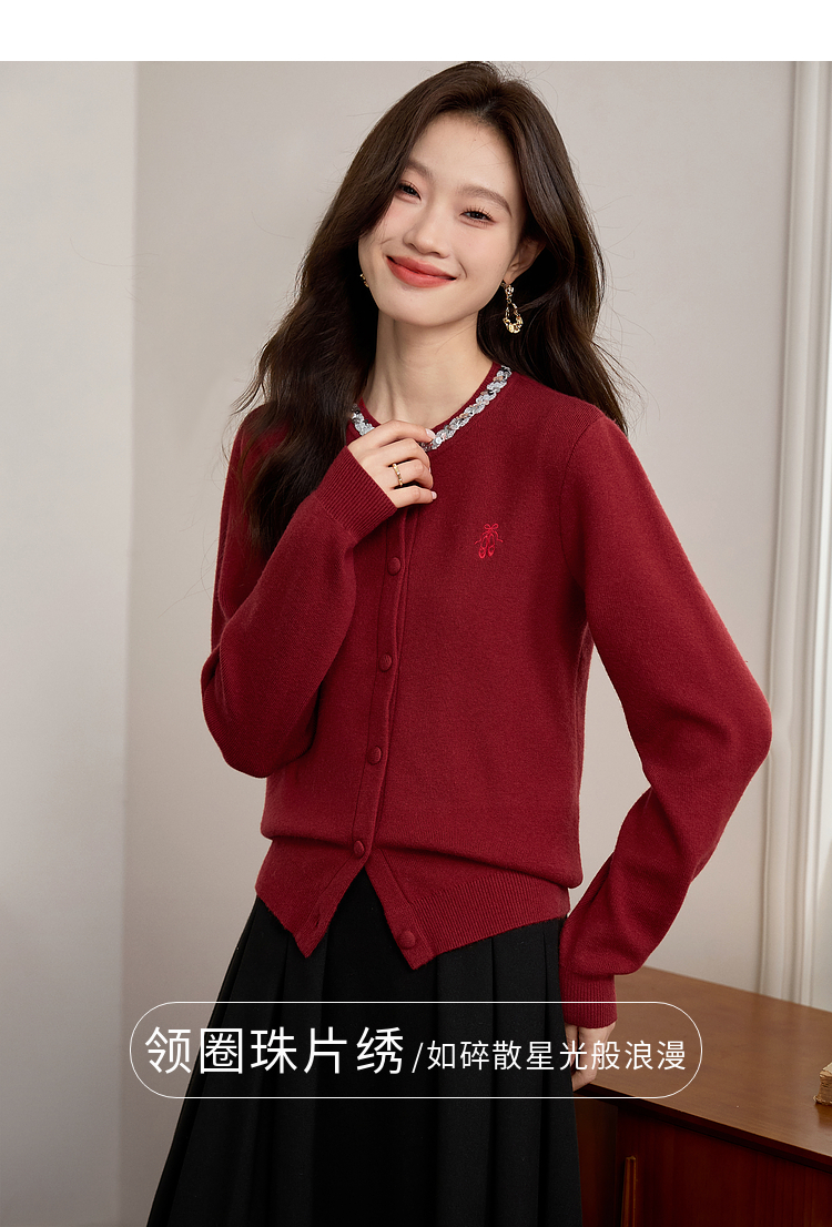 【年货节】熙世界氛围感珠片圆领针织外套女短款红色毛衣开衫2025新款秋冬