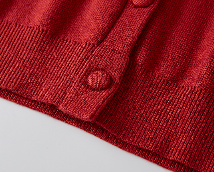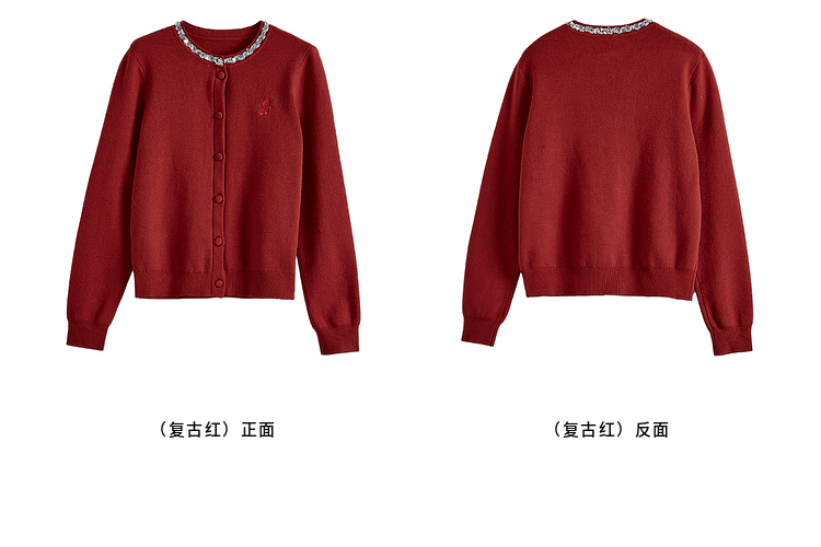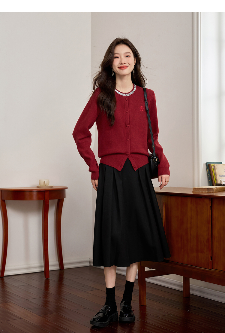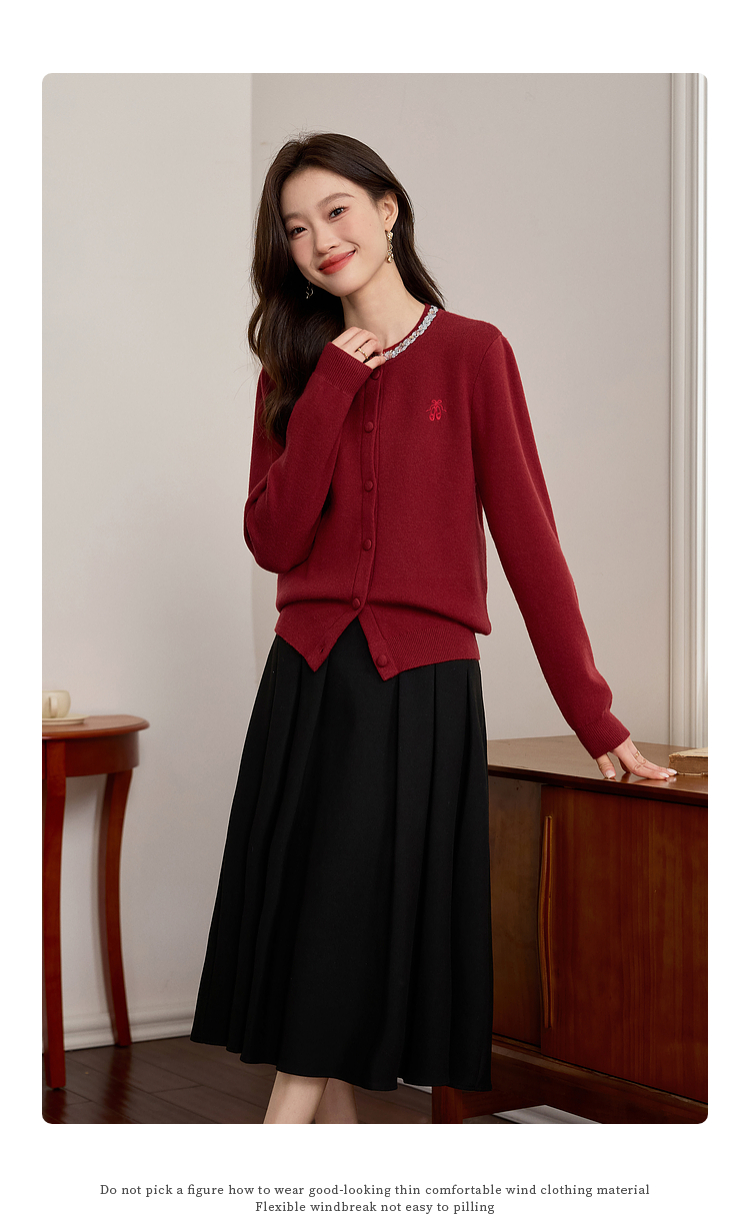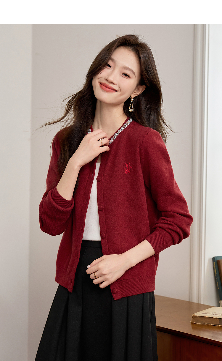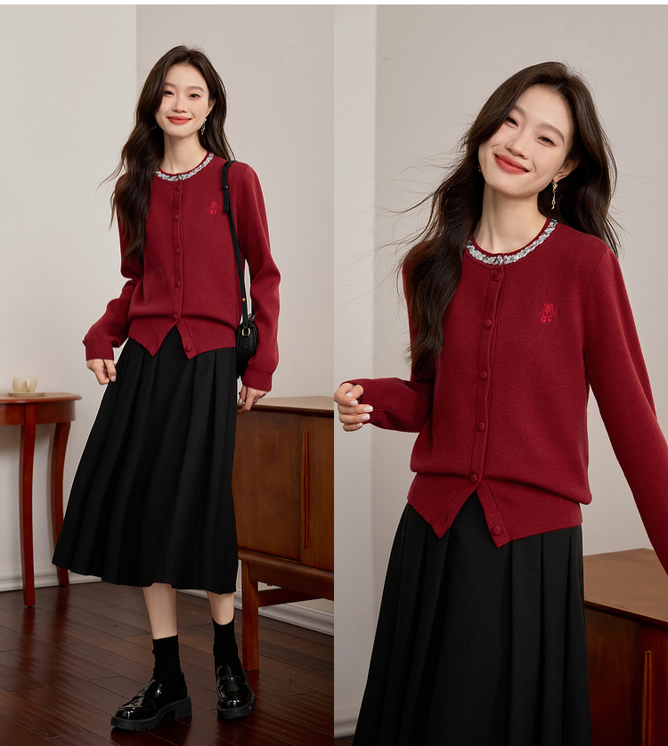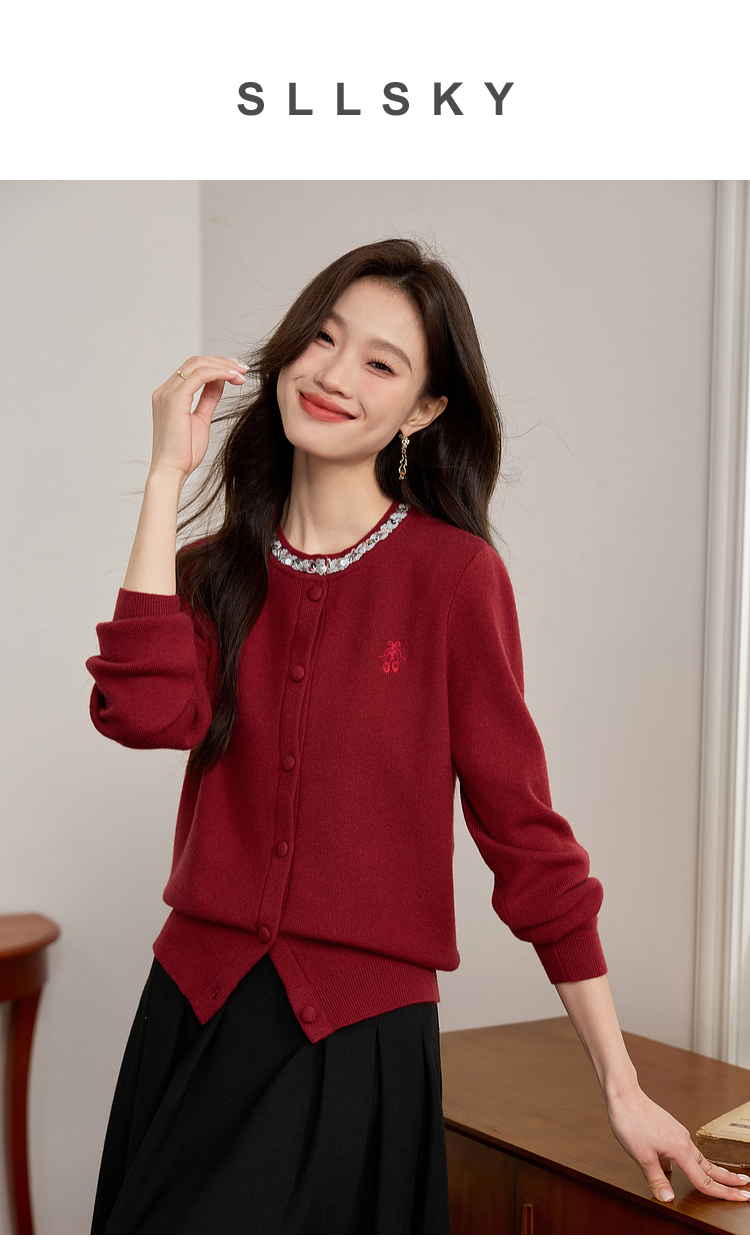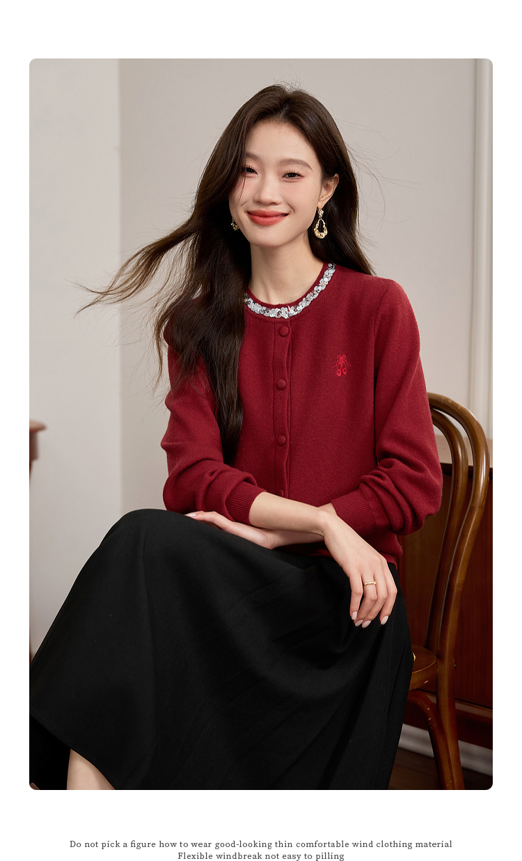 【年货节】熙世界氛围感珠片圆领针织外套女短款红色毛衣开衫2025新款秋冬