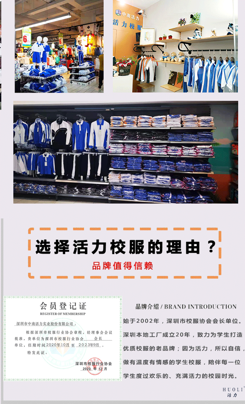 活力校服由深圳市中南活力实业股份有限公司创建的品牌,深圳二十一年老品牌,教育局中标企业;主营深圳校服、广州校服、东莞校服、佛山校服、肇庆校服、江苏校服、鞋袜、学生床上用品等学生课桌椅一站式教育领域产品