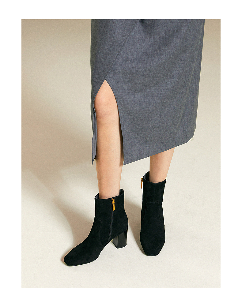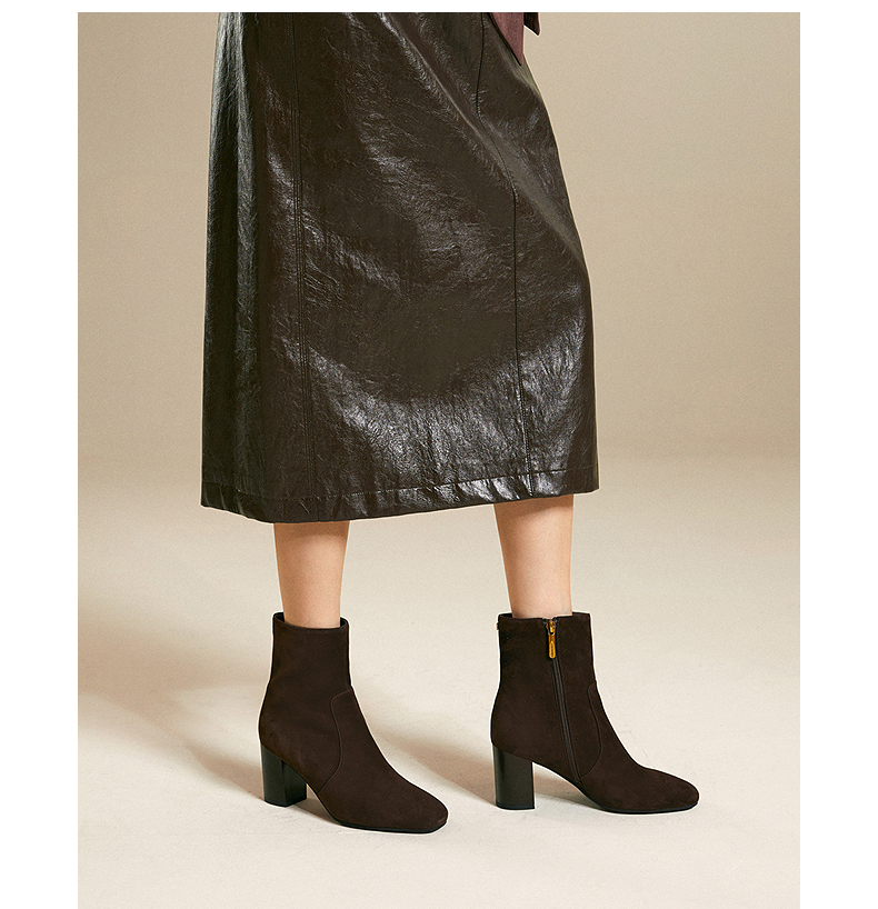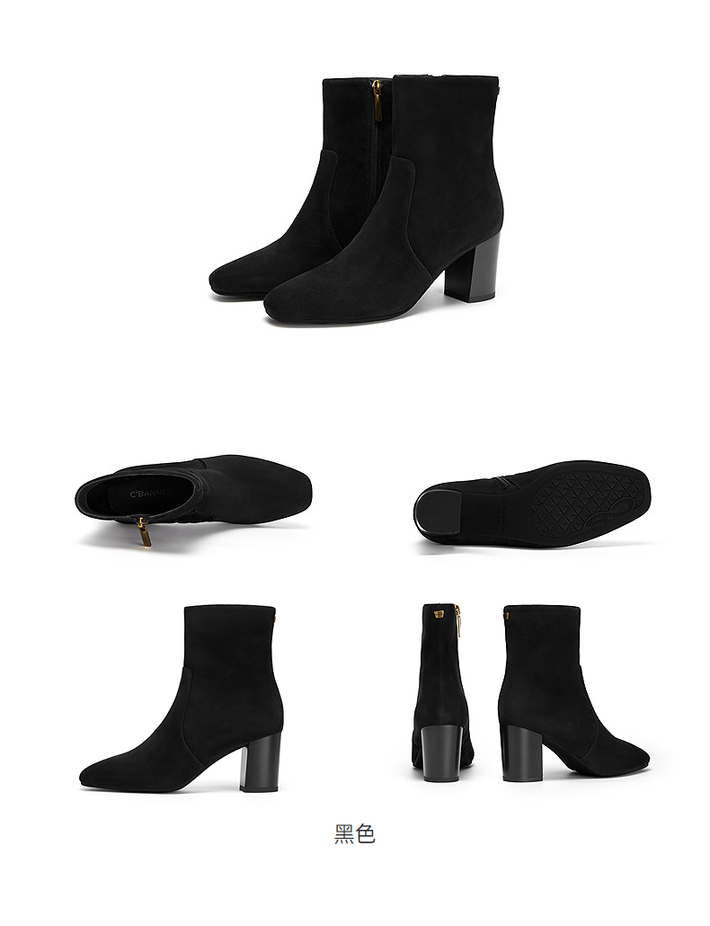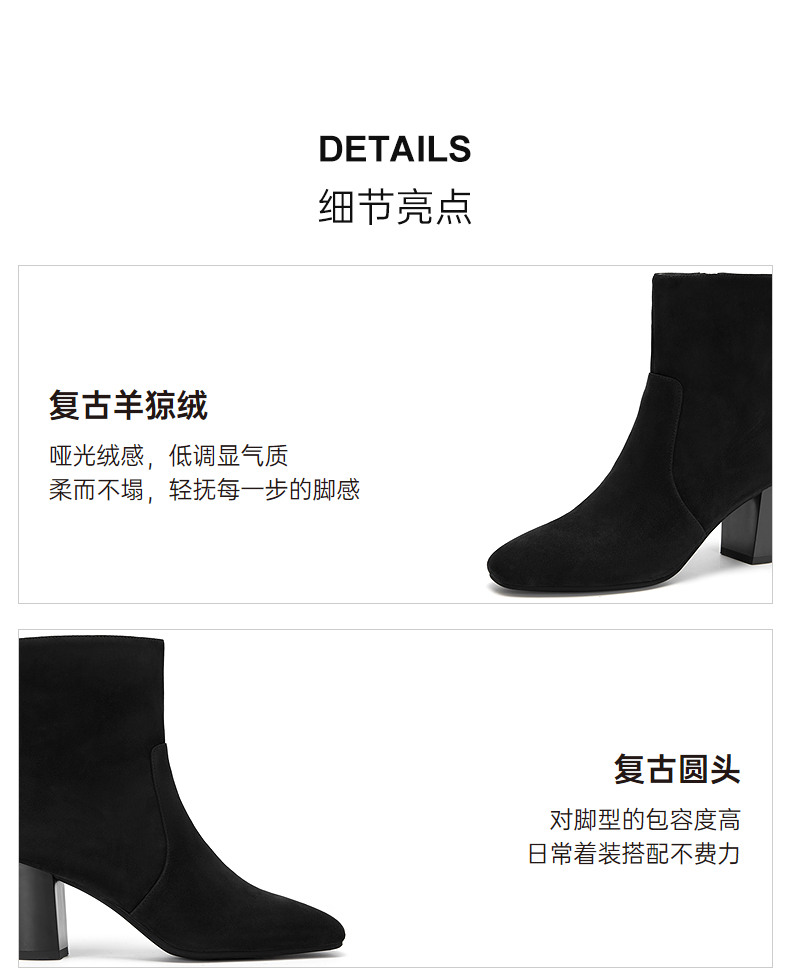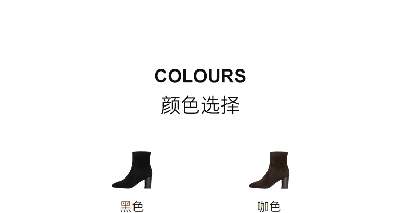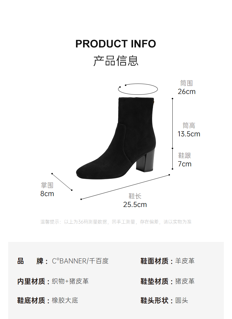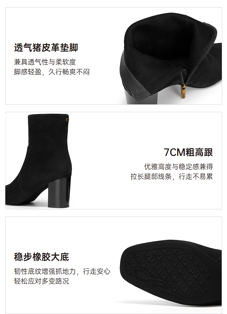 千百度羊皮粗高跟时装靴女弹力袜靴显瘦美拉德短靴子A25551511