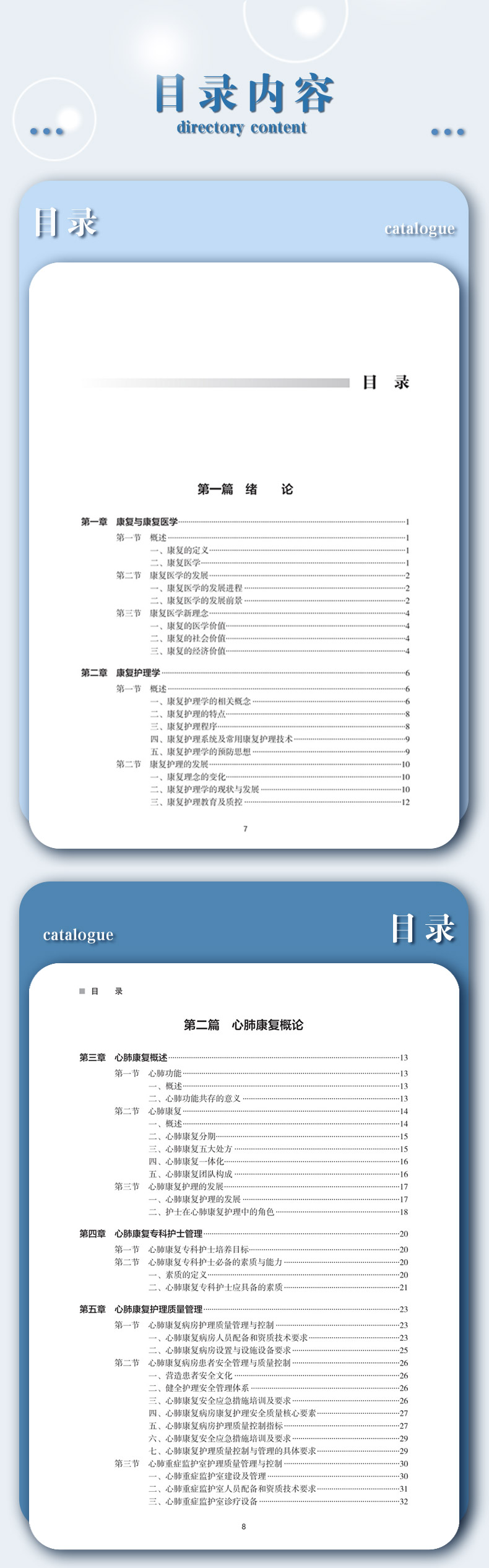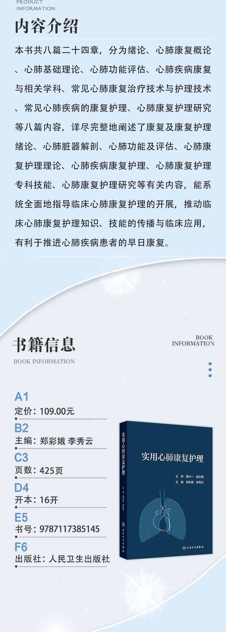 本书共八篇二十四章,分为绪论、心肺康复概论、心肺基础理论、心肺功能评估、心肺疾病康复与相关学科、常见心肺康复治疗技术与护理技术、常见心肺疾病的康复护理、心肺康复护理研究等八篇内容,详尽完整地阐述了康复及康复护理绪论、心肺脏器解剖、心肺功能及评估、心肺康复护理理论、心肺疾病康复护理、心肺康复护理专科技能、心肺康复护理研究等有关内容,能系统全面地指导临床心肺康复护理的开展,推动临床心肺康复护理知识、技能的传播与临床应用,有利于推进心肺疾病患者的早日康复。