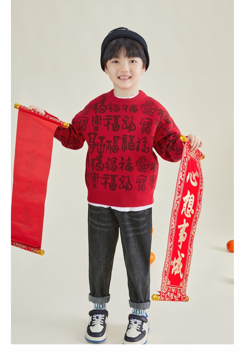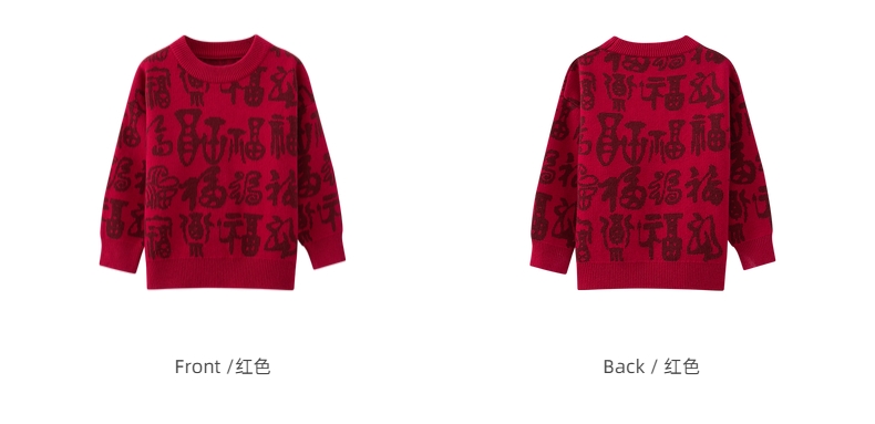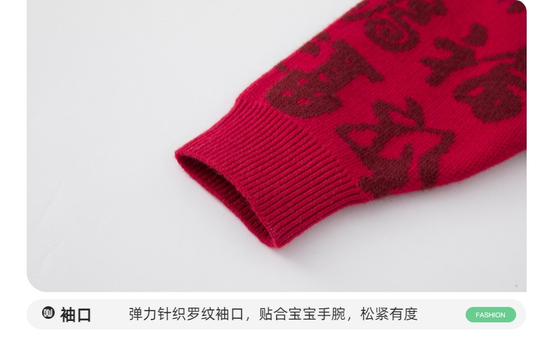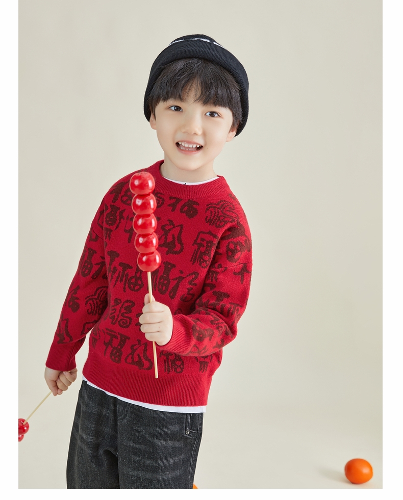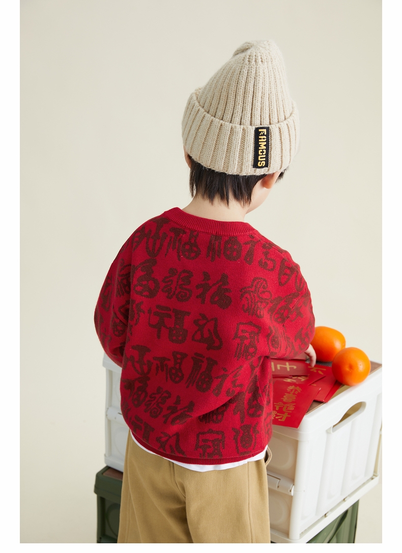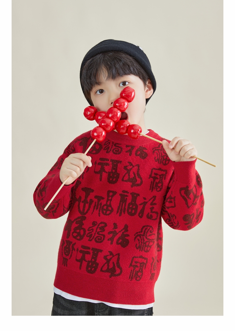 【团购价79.9-89.9】多多家男童毛衣红色年服2023新款福字满印儿童毛线衫中大冬上衣5726