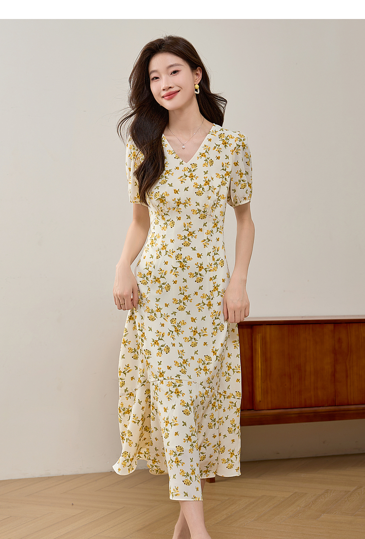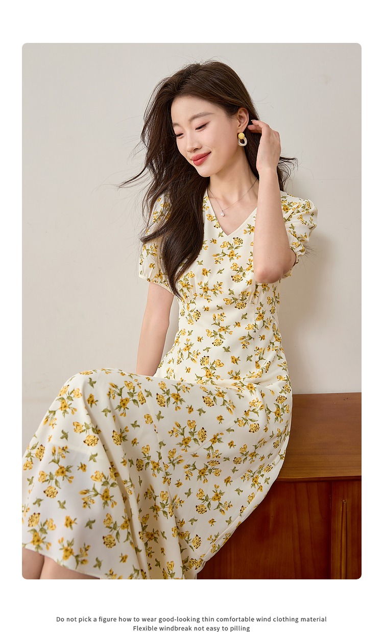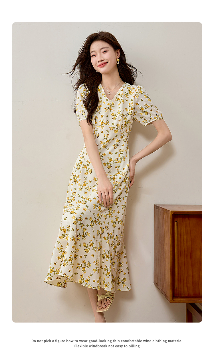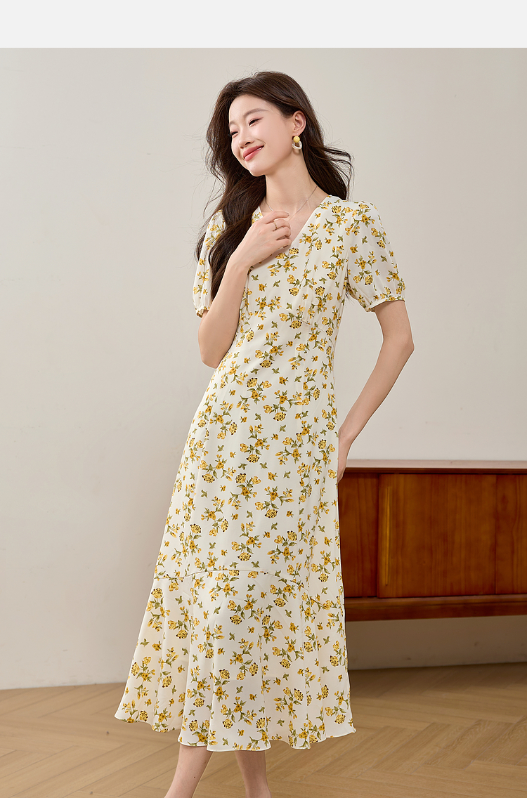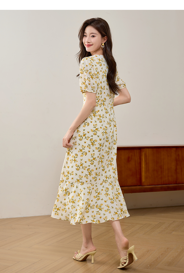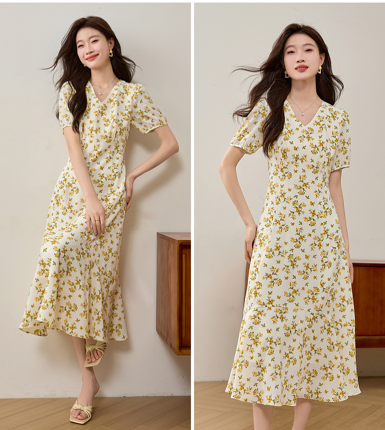 【专属特价】熙世界小黄花碎花连衣裙夏2025新款泡泡袖V领鱼尾裙过膝长裙子