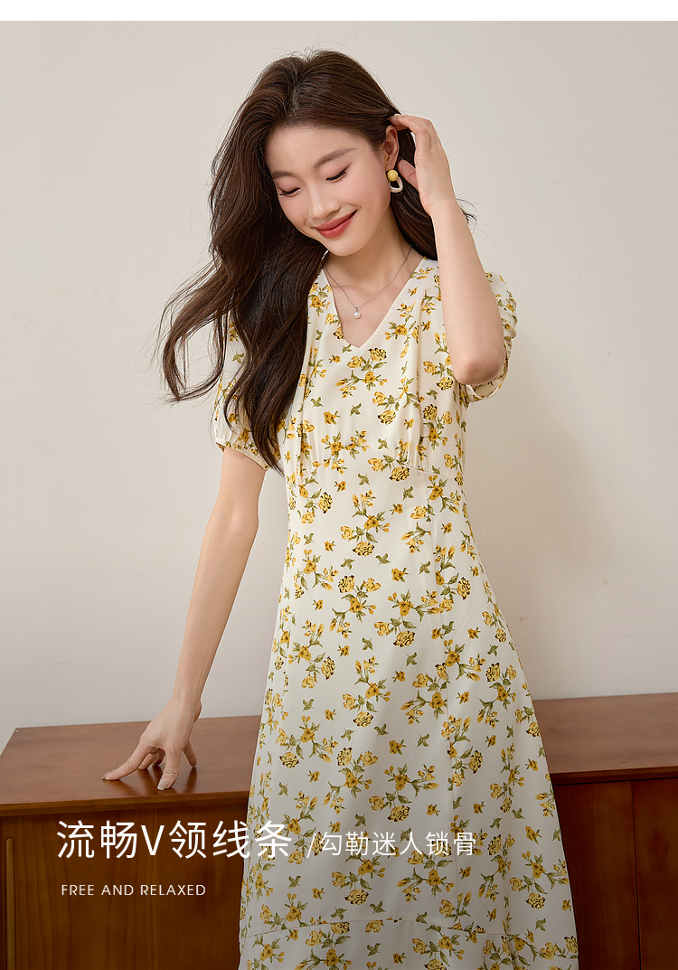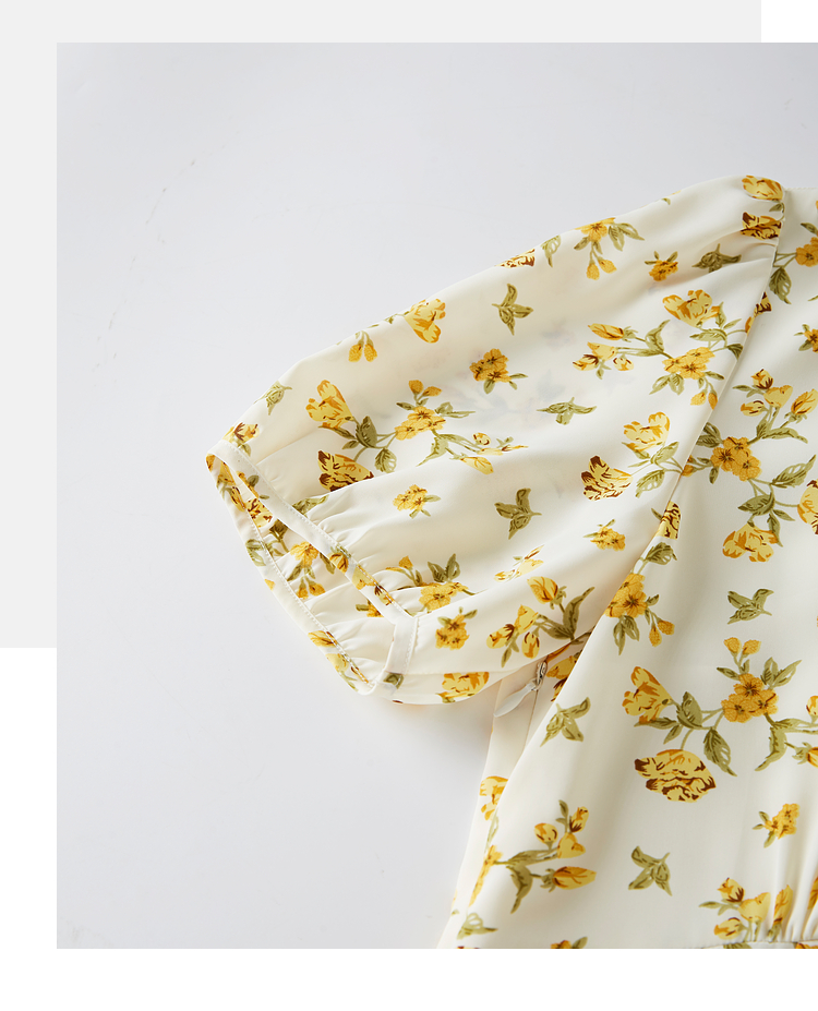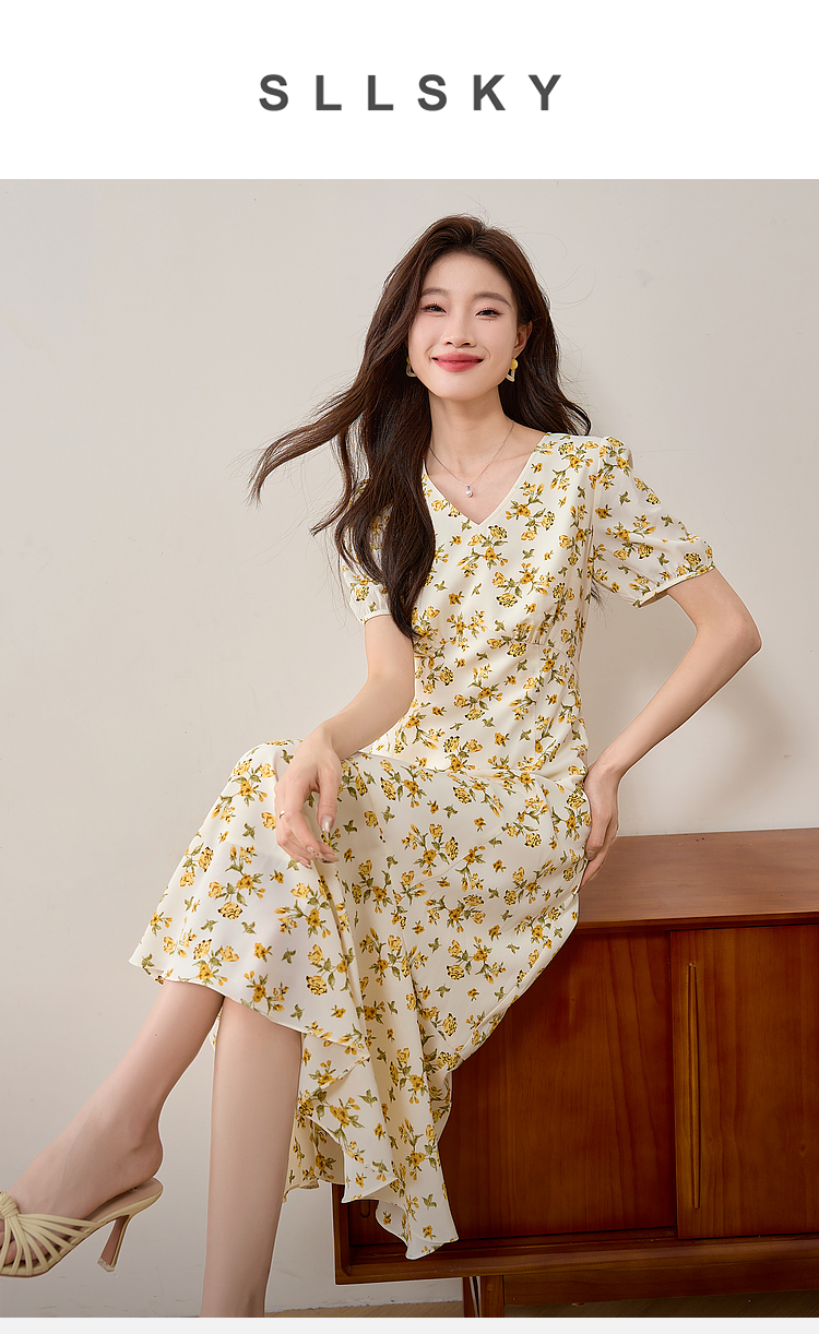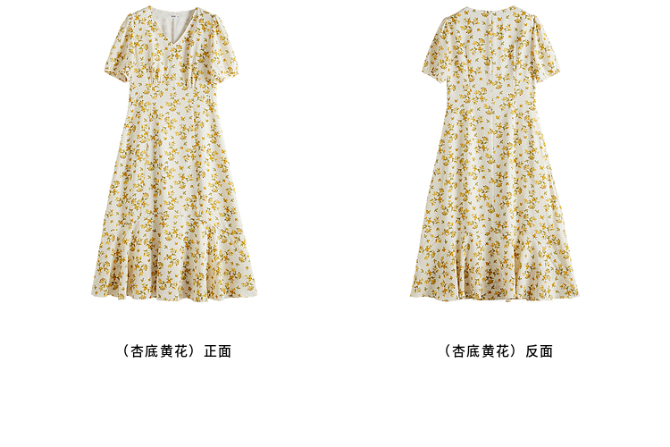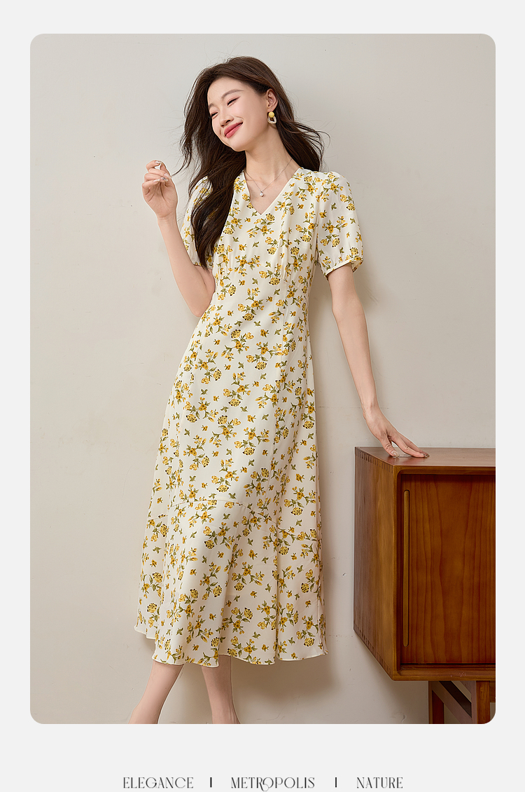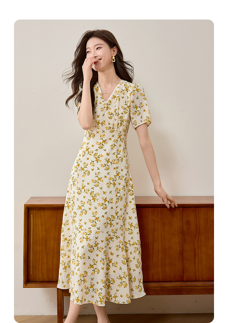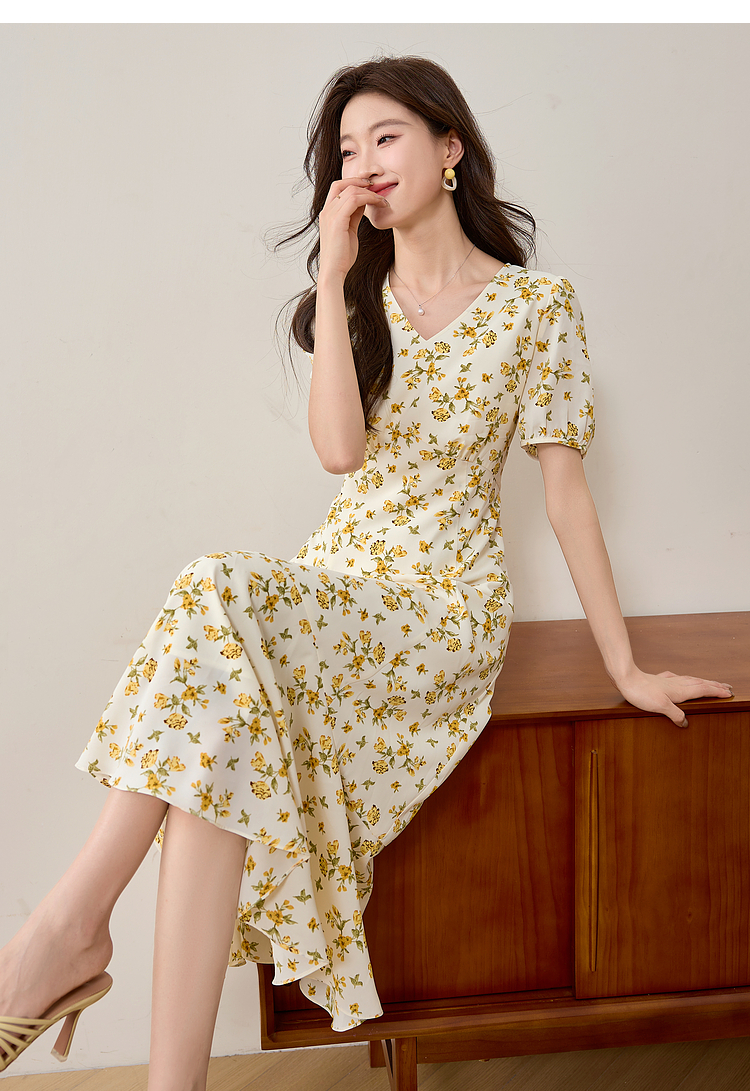 【专属特价】熙世界小黄花碎花连衣裙夏2025新款泡泡袖V领鱼尾裙过膝长裙子