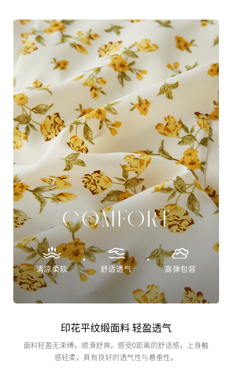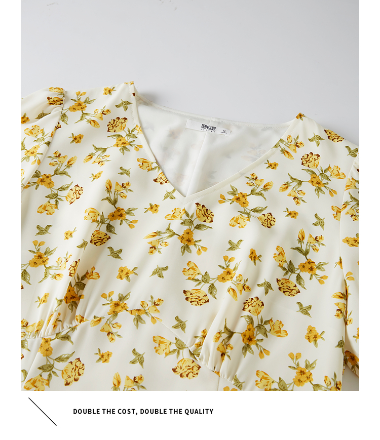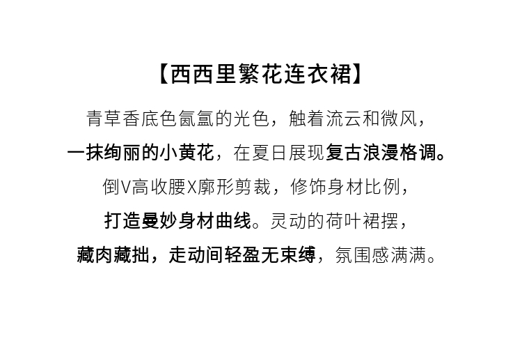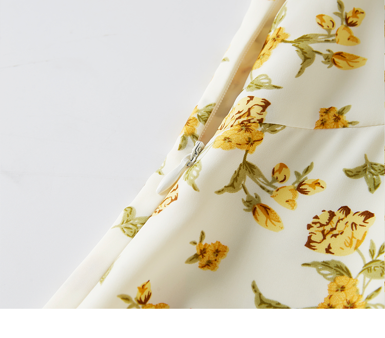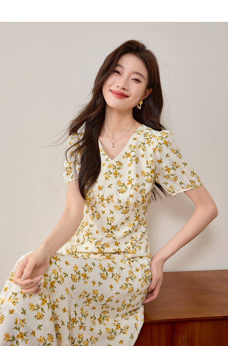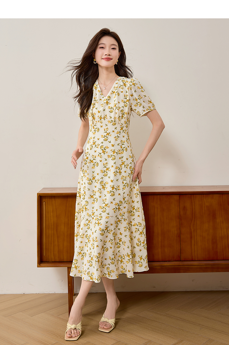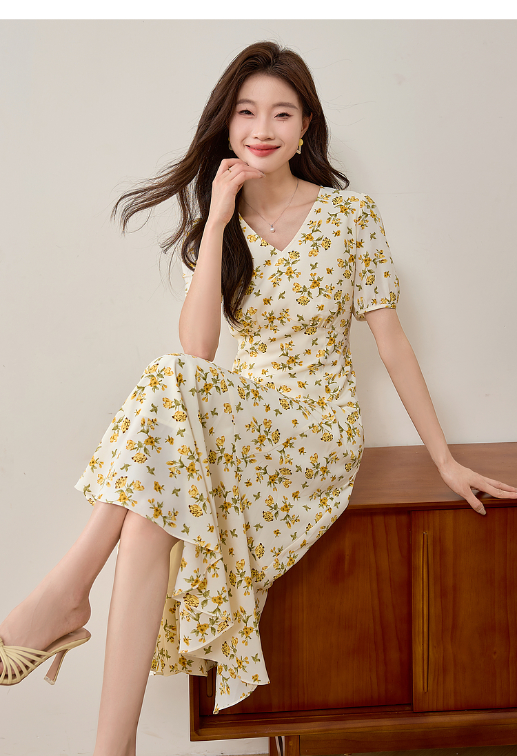 【专属特价】熙世界小黄花碎花连衣裙夏2025新款泡泡袖V领鱼尾裙过膝长裙子