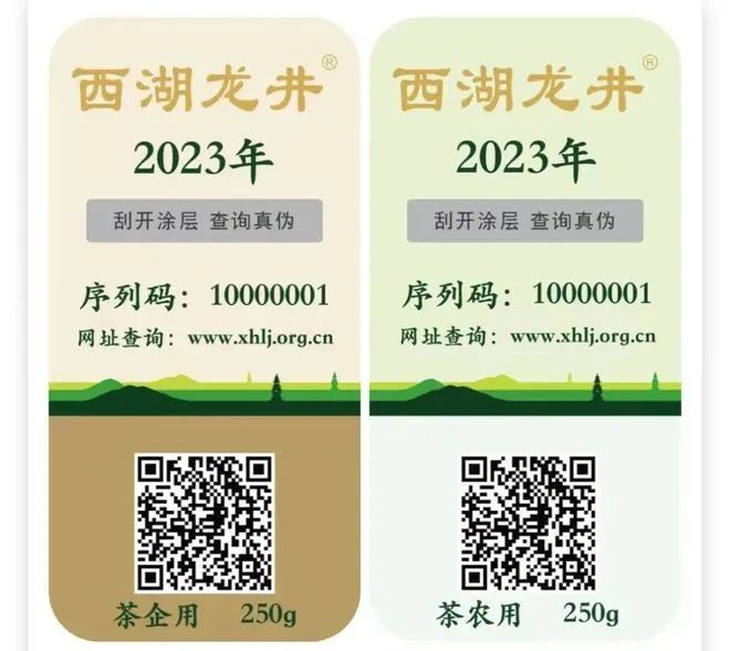 看 茶农标 西湖茶协会根据茶农茶园面积按照相应亩产量配置的防伪标识,刮开涂层可查询茶农姓名、茶园面积等信息,可以说是西湖龙井茶的防伪标识。
