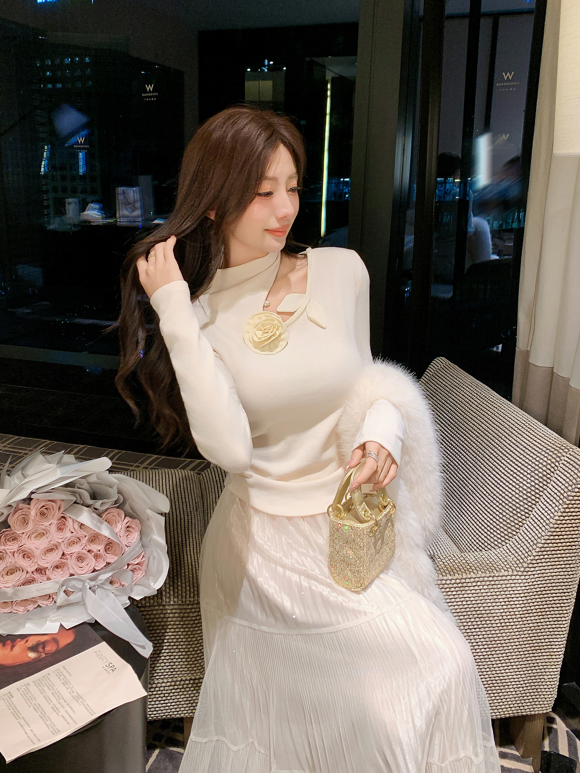 张心子【温柔可露丽】立体花温柔挂脖打底衫上衣 U2512017