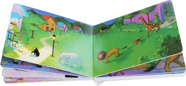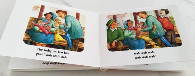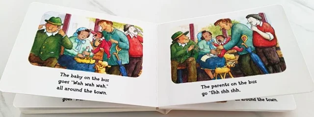 《The wheels on the bus》是一首非常经典的英语童谣。其标准清晰的英语发音,更是不可多得的英语启蒙教材。在讲读这本书时,就可以以一当三,可以先唱读儿歌,第二遍再仔细品味故事细节。第三遍,还可以作为宝宝的认知书,引导宝宝辨别不同的人物、颜色和物品。