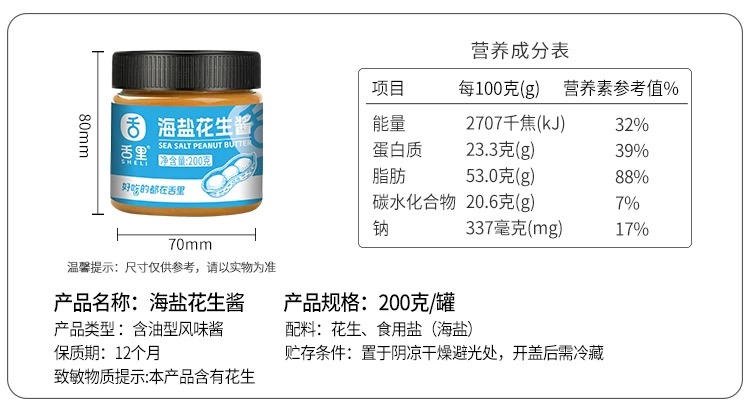 【舌里海盐花生酱200g/瓶】面包搭档 无人为添加蔗糖 无增稠剂 配料干净