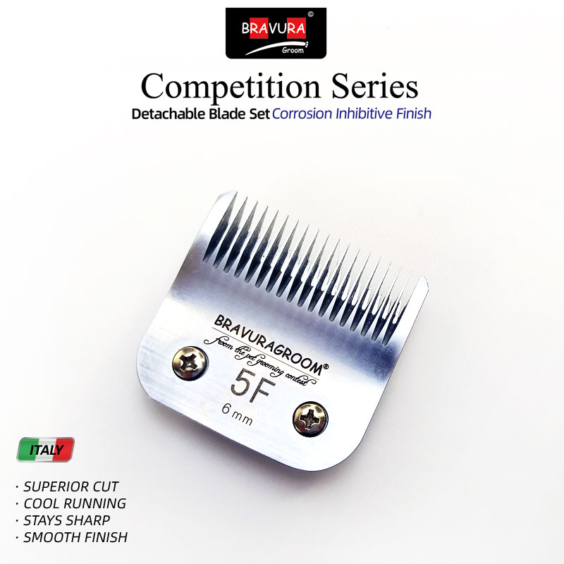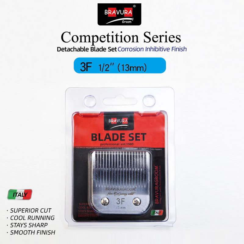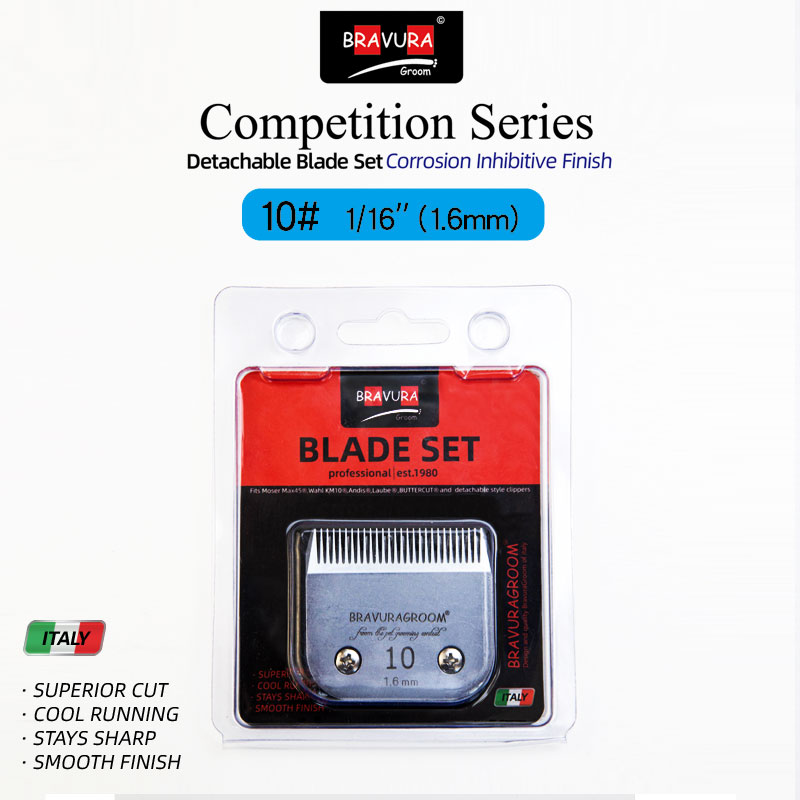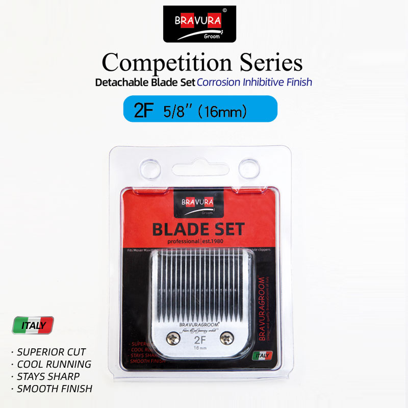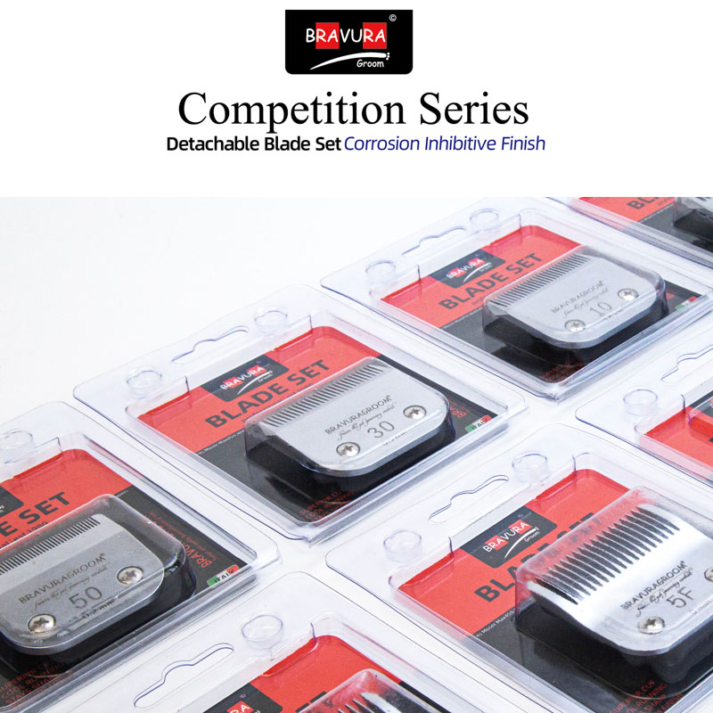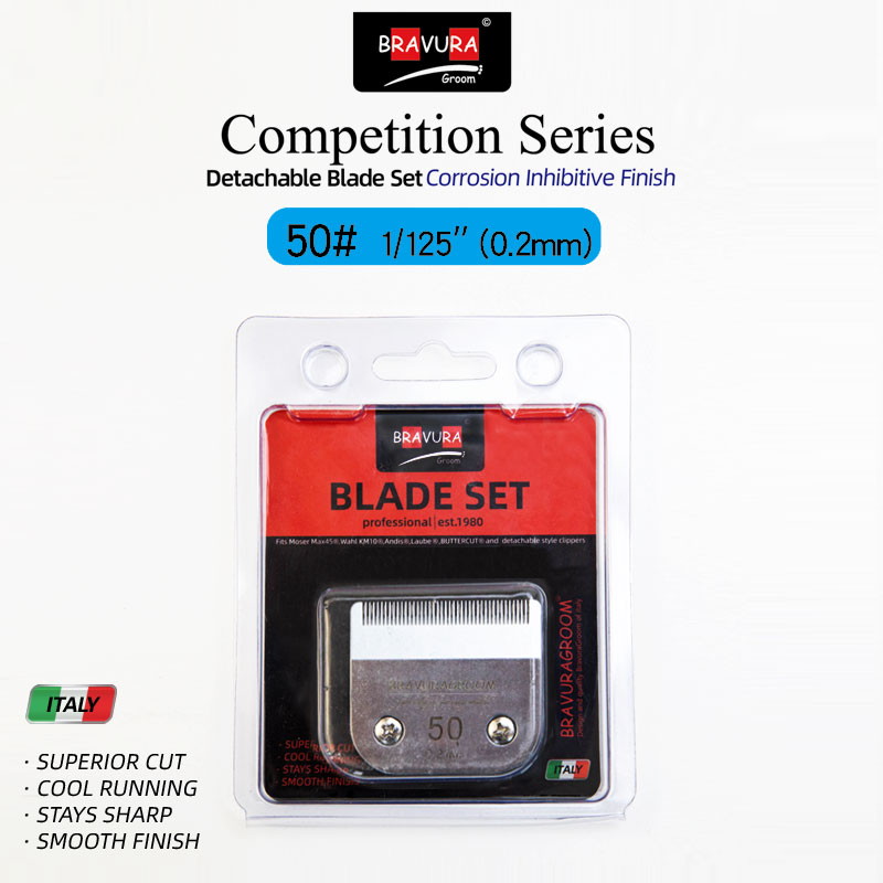 Looking for a replacement blade for your BRAVURA detachable blade clipper? BRAVURA's Ultimate Competition blades can be used with all of those clippers and compatible competitor clippers. Blade sizes range from 16mm (#2F) to 0.2mm (#50), which is a close, surgical grade cut. The #30 blade can be used with BRAVURA's Stainless Steel Attachment Guide Combs for even longer cutting length options. The Ultimate Competition series goes through additional processing during manufacturing that coats the blades to protect against rust and keeps them sharper longer than the original Competition series. Compatible with ANDIS, LAUBE, Wahl's KM Cordless, KM10, KM5, MOSER-MAX45, clippers.
