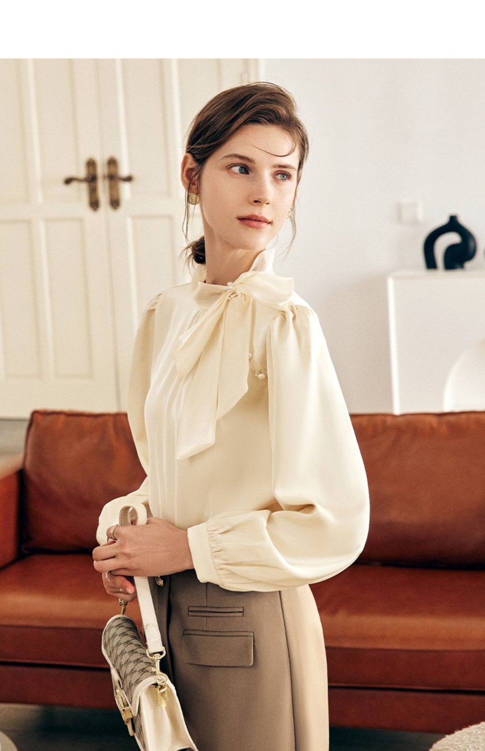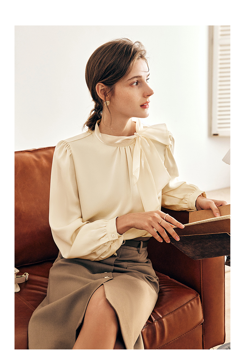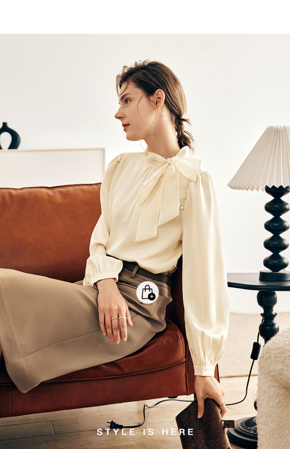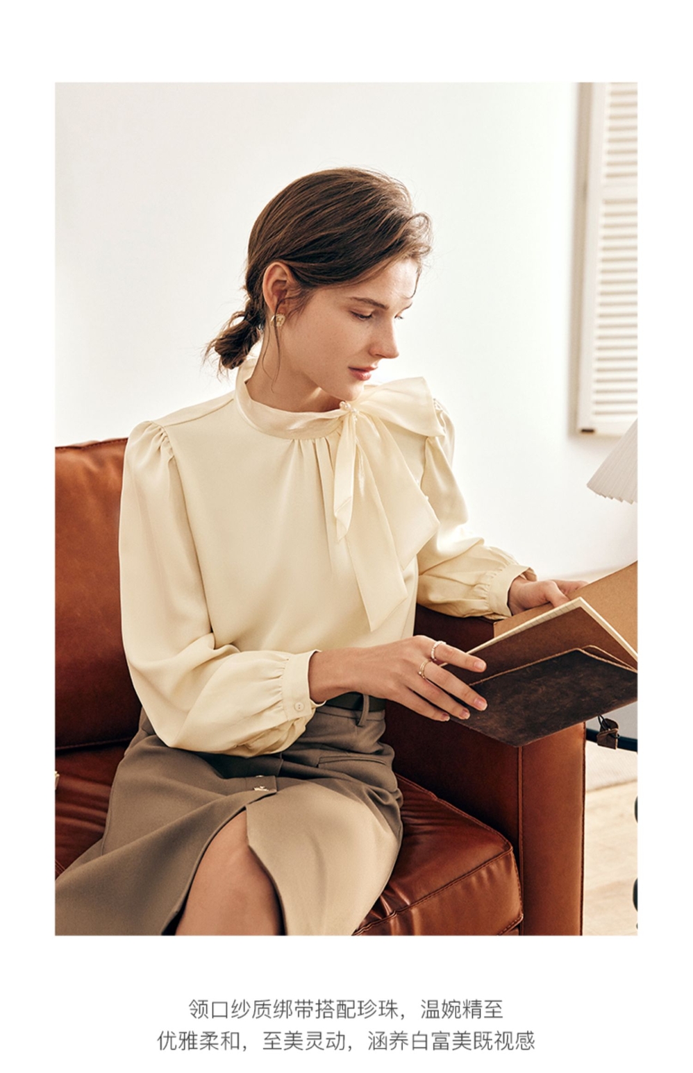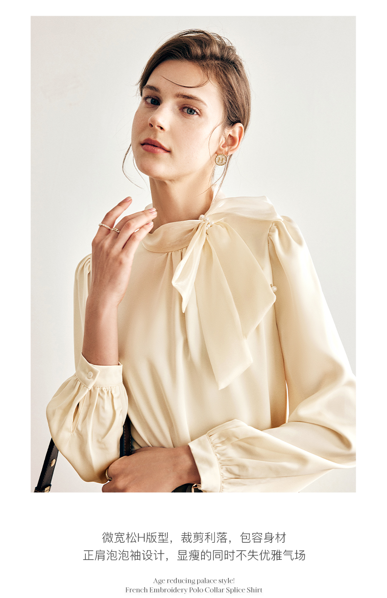 OLrain欧芮儿法式缎面蕾丝雪纺衫女秋冬2022新款宽松气质绑带衬衣