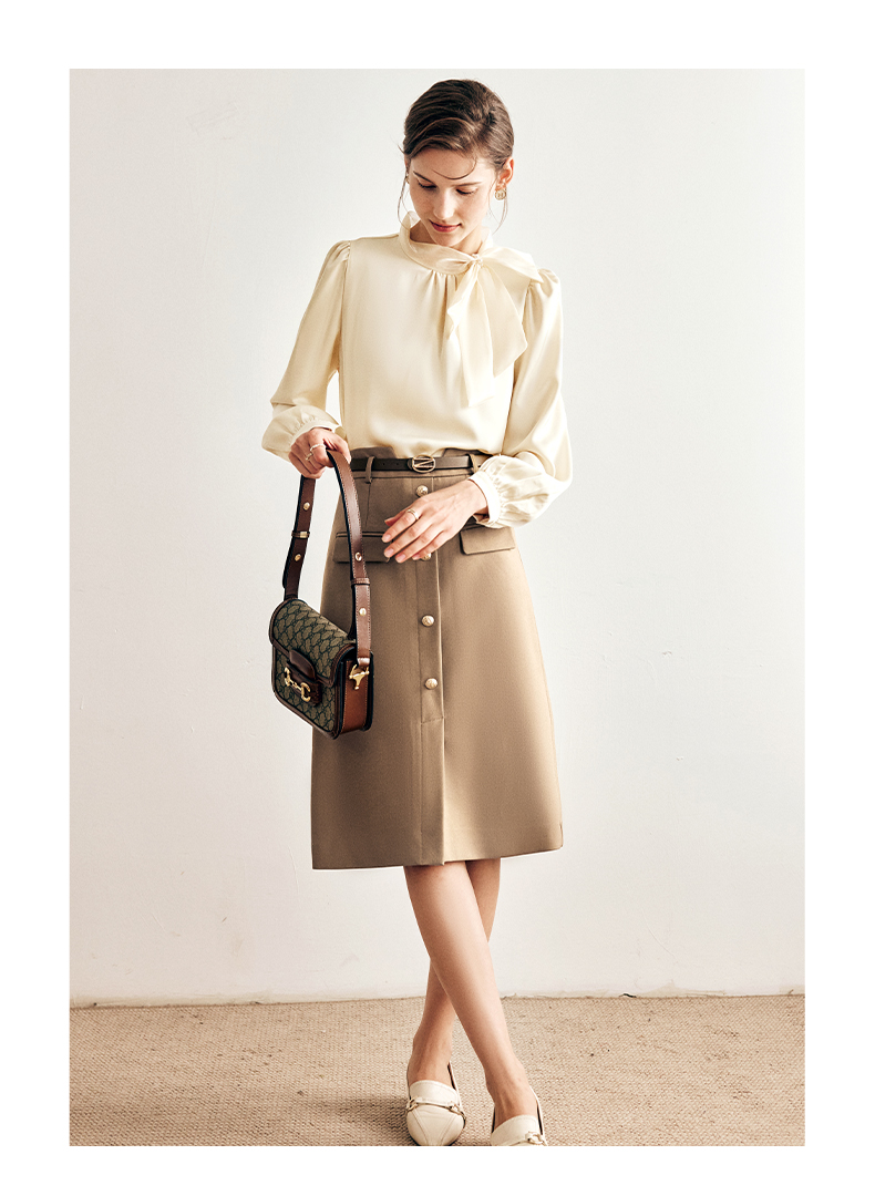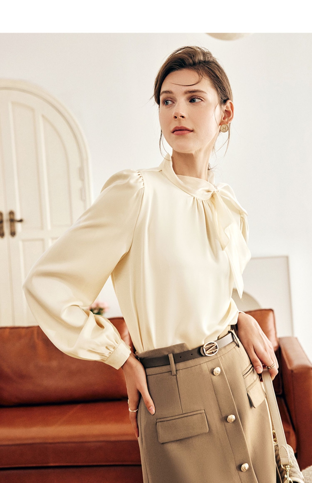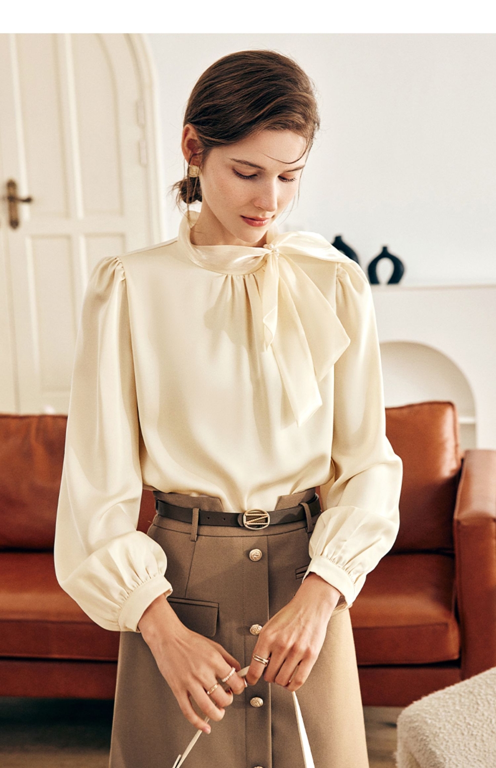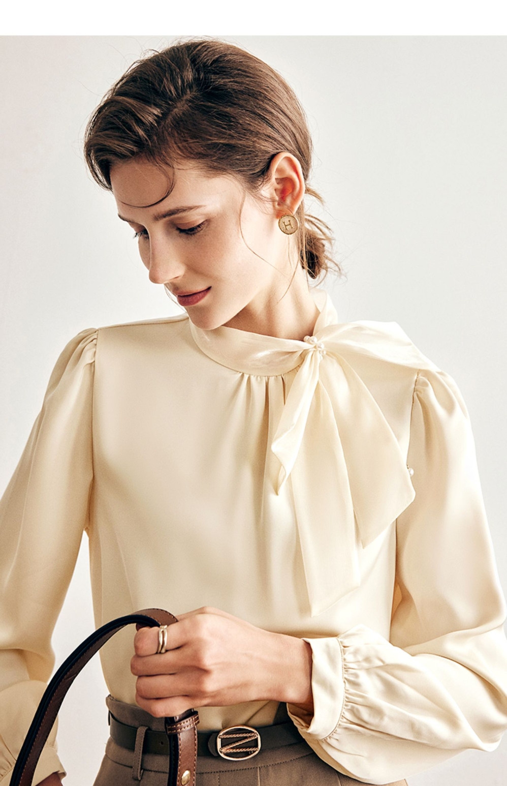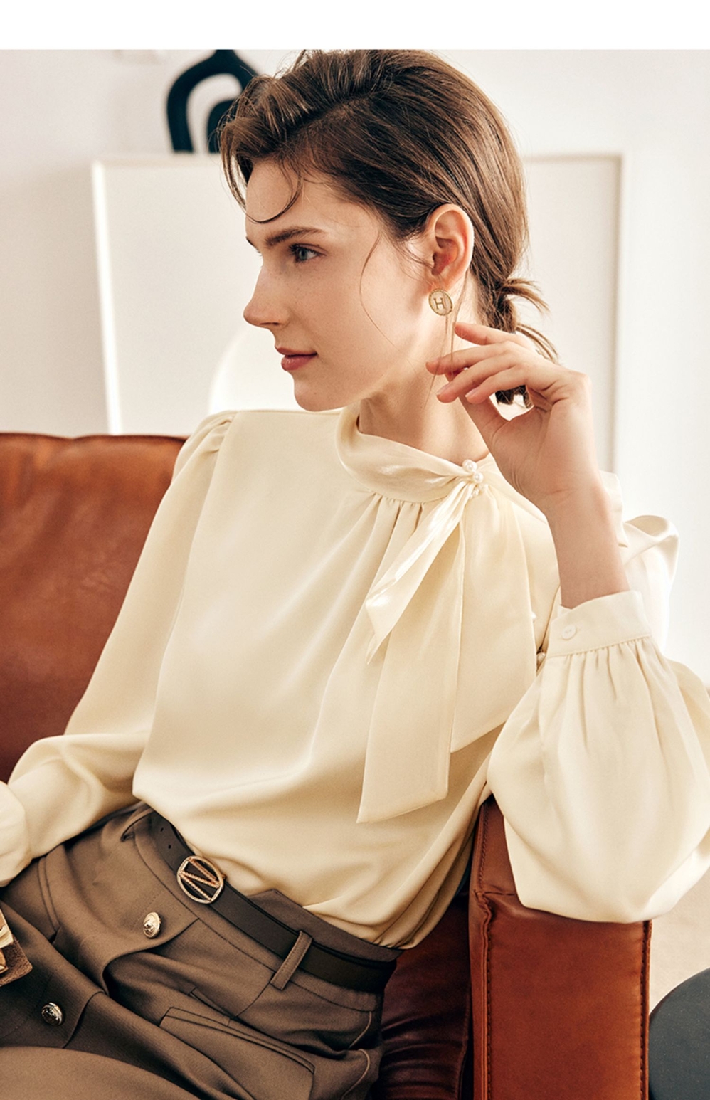 OLrain欧芮儿法式缎面蕾丝雪纺衫女秋冬2022新款宽松气质绑带衬衣