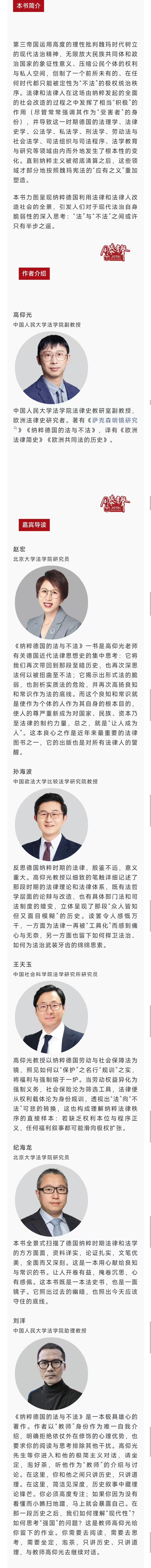 第三帝国运用高度的理性批判魏玛时代树立的现代法治精神,无限放大民族共同体和政治国家的象征性意义、压缩公民个体的权利与私人空间,创制了一个前所未有的、在任何时代都只能被定性为“不法”的极权统治秩序。法律和法律人在这场由纳粹发起的全面的社会改造的过程之中发挥了相当积极的作用(尽管常常强调其作为“受害者”的身份),并导致这一时期德国的法理学、法律史学、公法学、私法学、刑法学、劳动法与社会法学、司法组织与司法程序、法学教育与研究等领域由内而外地发生了根本性的变化。直到纳粹主义被彻底清算之后,这些领域才部分地按照魏玛宪法的“应有之义”重加塑造。本书力图呈现纳粹德国利用法律和法律人改造社会的全景,引发人们对于现代法治自身脆弱性的深入思考:“法”与“不法”之间或许只有半步之遥。