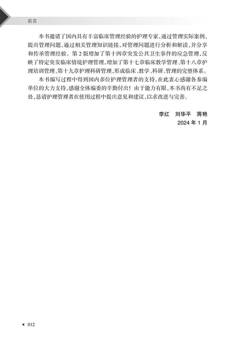 本书由刘华平、李红、蒋艳主编,在编写结构上,全书共分15个章节,贯穿主线的有:管理学的四大原理,如系统原理、人本原理、动态原理和效益原理;护理管理的五项基本职能,如护理计划、护理组织管理、护理领导、护理人力资源管理、护理控制等;当前我国护理的难点和热点问题,如护理岗位管理、护理绩效管理、护理文化管理、护理危机管理、护理信息管理以及护理创新管理等。邀请了国内具有丰富临床管理经验的护理专家,引用管理实际案例,提出管理问题,借由相关管理的知识链接,对管理问题进行分析和解读,并分享和传承管理经验。 读者对象:各级各类医院护理部主任、护理院长、护士长,从事护理管理工作的从业人员,本书同时也是医院各级护理管理人员的管理指南用书,还可作为高等学校护理管理教学使用的参考书。