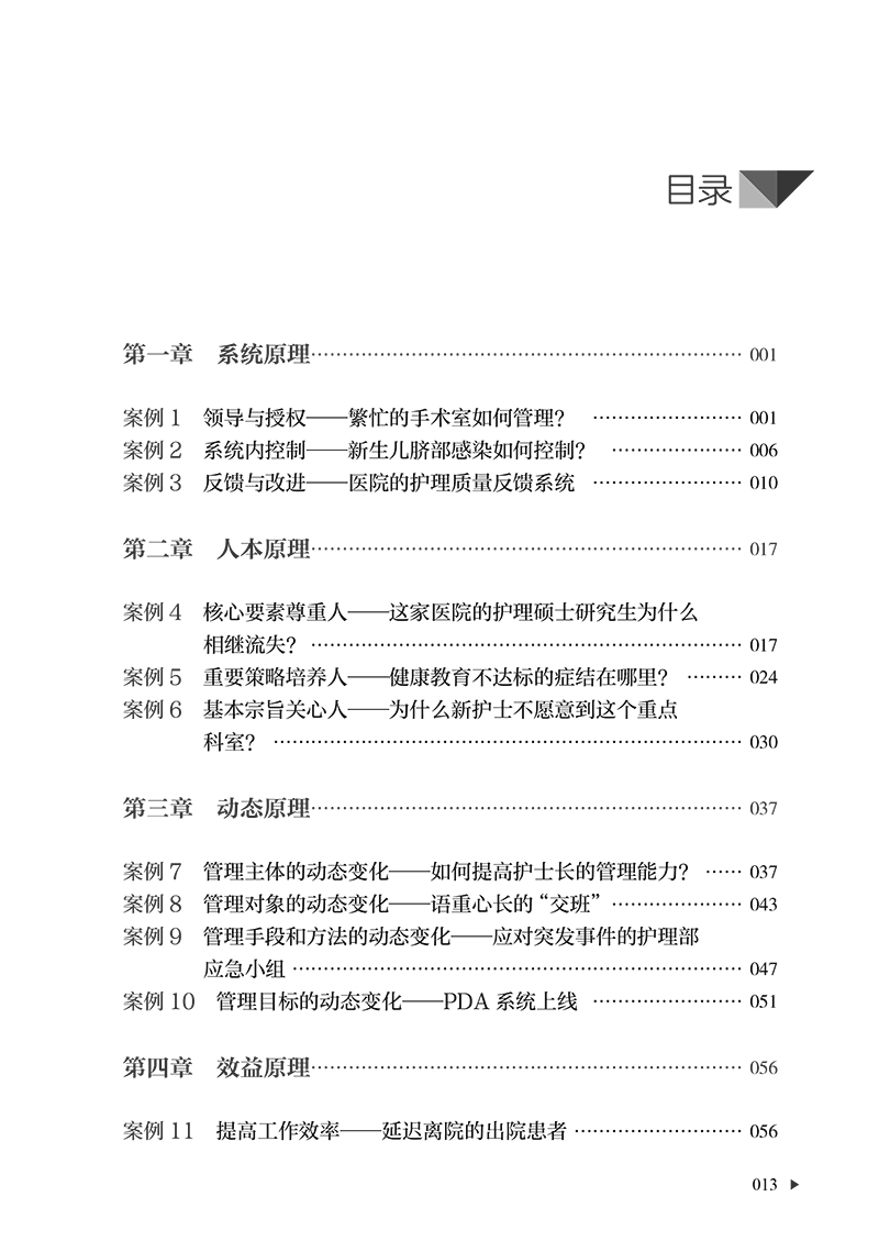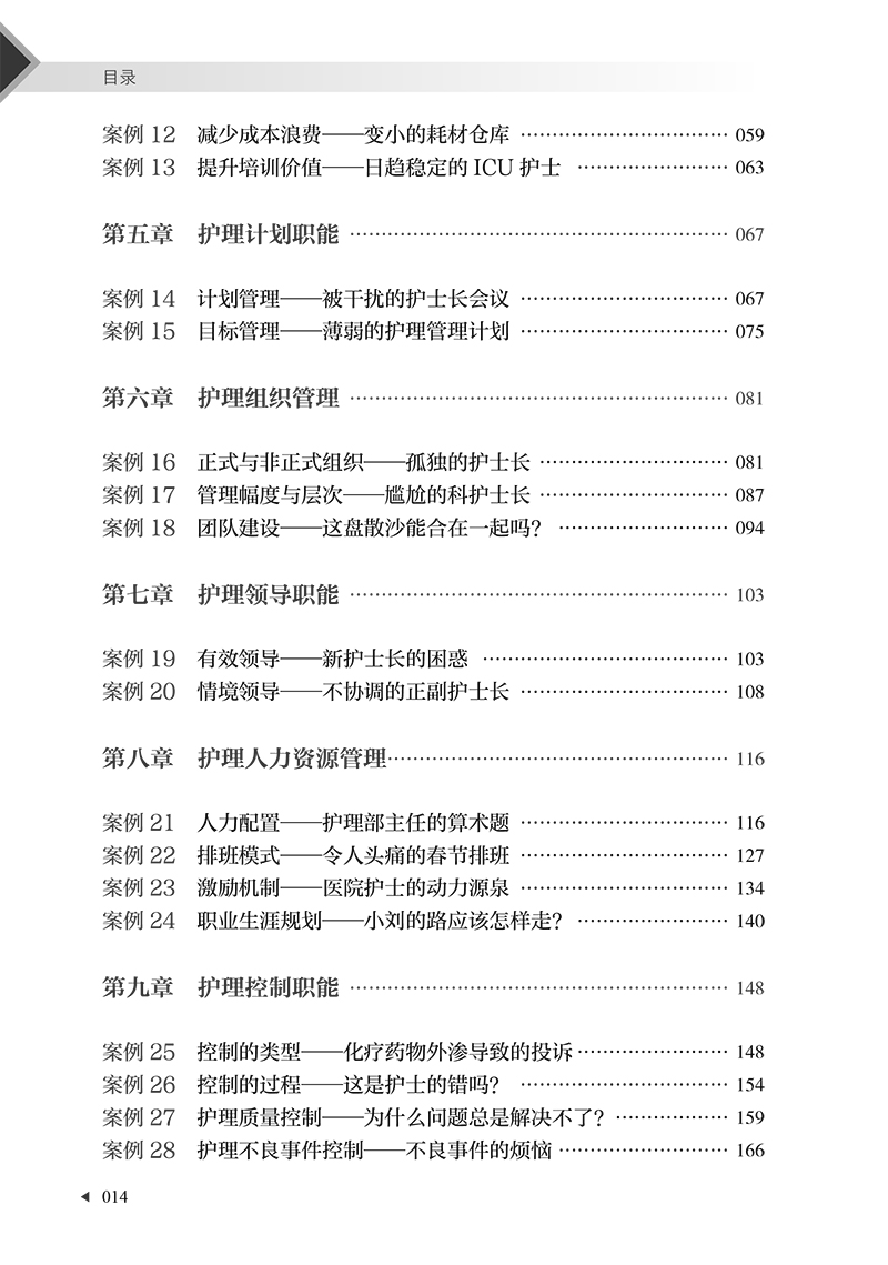 第一章 系统原理/ 001 案例1 领导与授权——繁忙的手术室如何管理?/ 001 案例2 系统内控制——新生儿脐部感染如何控制?/ 006 案例3 反馈与改进——医院的护理质量反馈系统/ 010 第二章 人本原理/ 017 案例4 核心要素尊重人——这家医院的护理硕士研究生为什么相继流失?/ 017 案例5 重要策略培养人——健康教育不达标的症结在哪里?/ 024 案例6 基本宗旨关心人——为什么新护士不愿意到这个重点科室?/ 030 第三章 动态原理/ 037 案例7 管理主体的动态变化——如何提高护士长的管理能力?/ 037 案例8 管理对象的动态变化——语重心长的“交班”/ 043 案例9 管理手段和方法的动态变化——应对突发事件的护理部应急小组/ 047 案例10 管理目标的动态变化——PDA 系统上线/ 051 第四章 效益原理/ 056 案例11 提高工作效率——延迟离院的出院患者/ 056 案例12 减少成本浪费——变小的耗材仓库/ 059 案例13 提升培训价值——日趋稳定的ICU 护士/ 063 第五章 护理计划职能/ 067 案例14 计划管理——被干扰的护士长会议/ 067 案例15 目标管理——薄弱的护理管理计划/ 075 第六章 护理组织管理/ 081 案例16 正式与非正式组织——孤独的护士长/ 081 案例17 管理幅度与层次——尴尬的科护士长/ 087 案例18 团队建设——这盘散沙能合在一起吗?/ 094 第七章 护理领导职能/ 103 案例19 有效领导——新护士长的困惑/ 103 案例20 情境领导——不协调的正副护士长/ 108 第八章 护理人力资源管理/ 116 案例21 人力配置——护理部主任的算术题/ 116 案例22 排班模式——令人头痛的春节排班/ 127 案例23 激励机制——医院护士的动力源泉/ 134 案例24 职业生涯规划——小刘的路应该怎样走?/ 140 第九章 护理控制职能/ 148 案例25 控制的类型——化疗药物外渗导致的投诉/ 148 案例26 控制的过程——这是护士的错吗?/ 154 案例27 护理质量控制——为什么问题总是解决不了?/ 159 案例28 护理不良事件控制——不良事件的烦恼/ 166 第十章 护理绩效管理/ 173 案例29 绩效考评——没有“激励作用”的绩效考评/ 173 案例30 薪酬管理——打造高效的护理团队/ 181 第十一章 护理文化管理/ 189 案例31 组织文化——“问题病房”应该怎么管?/ 189 案例32 文化测量——“今非昔比”的医院/ 197 案例33 文化落地——护理不良事件上报为什么这样难?/ 205 第十二章 护理岗位管理/ 212 案例34 岗位分析—— 一次变革失败后的思考/ 212 案例35 岗位设置——护理部主任之惑/ 218 案例36 岗位评价—— 一次评分造成的困扰/ 223 案例37 岗位分层管理—— 一次重症患者抢救事件之后/ 228 第十三章 护理危机管理/ 236 案例38 危机管理的重要性——谁“对”谁“错”,理性识别护理危机/ 236 案例39 危机管理预案——预案将危机“扼杀于摇篮”/ 243 案例40 完善制度与流程——规范制度“护人护己”/ 247 案例41 化解风险——转“危”为“机”/ 250 第十四章 突发公共卫生事件的应急管理/ 255 案例42 护理应急管理体系——“急中生智”应对疫情/ 255 案例43 突发公共卫生事件人力调度——不只是数字/ 264 第十五章 护理信息管理/ 272 案例44 临床护理信息管理——最后10 米的信息距离/ 272 案例45 护理人力信息管理——善用护理人力资源管理的利器/ 281 第十六章 护理创新管理/ 289 案例46 护理器具创新——卧床患者也可以“器械锻炼”了!/ 289 案例47 人才培养使用创新——让她们“飞”得更高更远/ 299 案例48 技能考核创新——“独占鳌头”的团队如何练成?/ 304 第十七章 临床教学管理/ 312 案例49 临床教学组织管理——教学质量下降的反思/ 312 案例50 临床教学过程管理——不一样的实习经历/ 317 案例51 临床教学评价—— 一致好评的困惑/ 322 第十八章 护理培训管理/ 329 案例52 新入职护士规范化培训—— 一例患者引发的纠纷/ 329 案例53 护士的分层培训——被排斥的科室培训/ 335 案例54 专科护士培训——抓住机遇,成就专家之路/ 339 第十九章 护理科研管理/ 348 案例55 科研项目管理——护理部科研管理的难题/ 348 案例56 科研团队建设——原来优秀的护理科研团队可以这么做!/ 355 案例57 科研诚信管理——晋升虽可贵,诚信价更高/ 361 参考文献/ 367