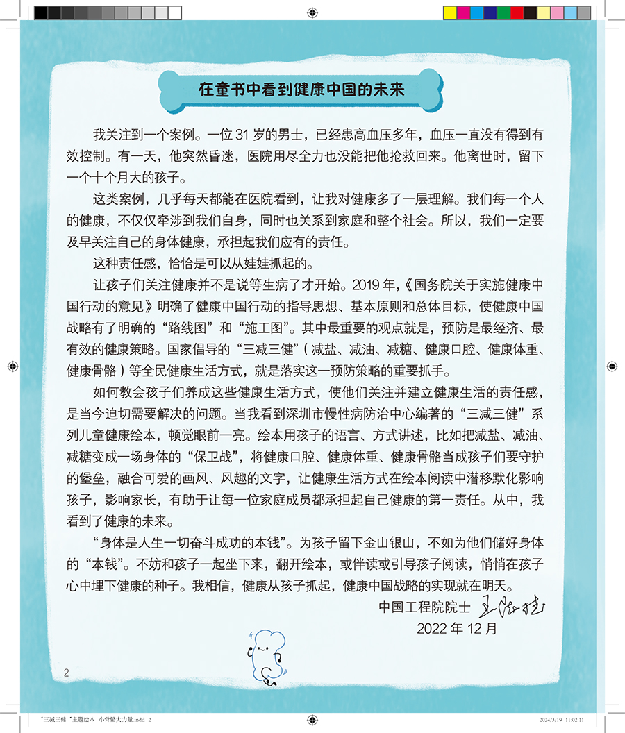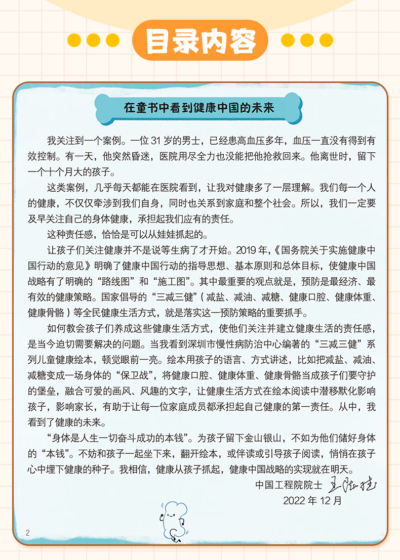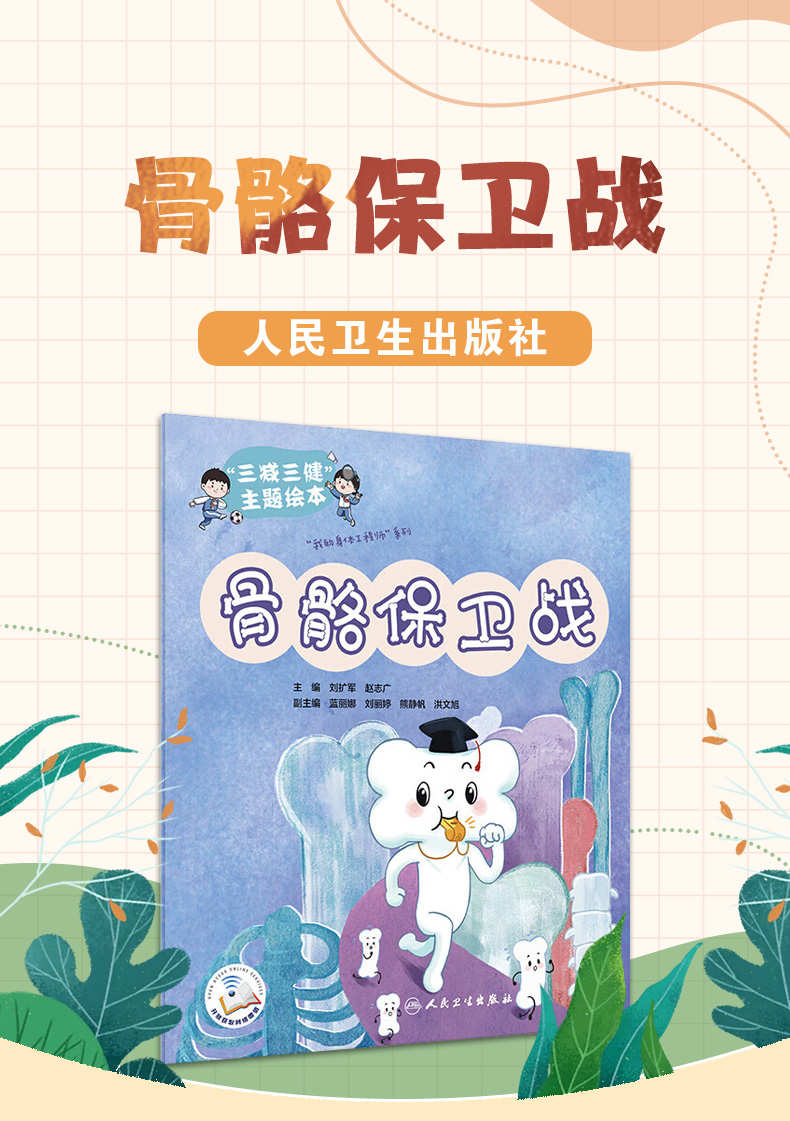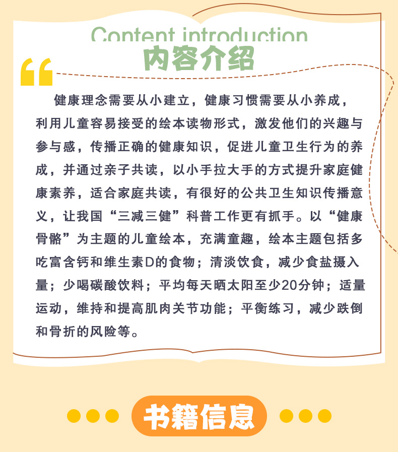 健康理念需要从小建立,健康习惯需要从小养成,利用儿童容易接受的绘本读物形式,激发他们的兴趣与参与感,传播正确的健康知识,促进儿童卫生行为的养成,并通过亲子共读,以小手拉大手的方式提升家庭健康素养,适合家庭共读,有很好的公共卫生知识传播意义,让我国“三减三健”科普工作更有抓手。以“健康骨骼”为主题的儿童绘本,充满童趣,绘本主题包括多吃富含钙和维生素D的食物;清淡饮食,减少食盐摄入量;少喝碳酸饮料;平均每天晒太阳至少20分钟;适量运动,维持和提高肌肉关节功能;平衡练习,减少跌倒和骨折的风险等。