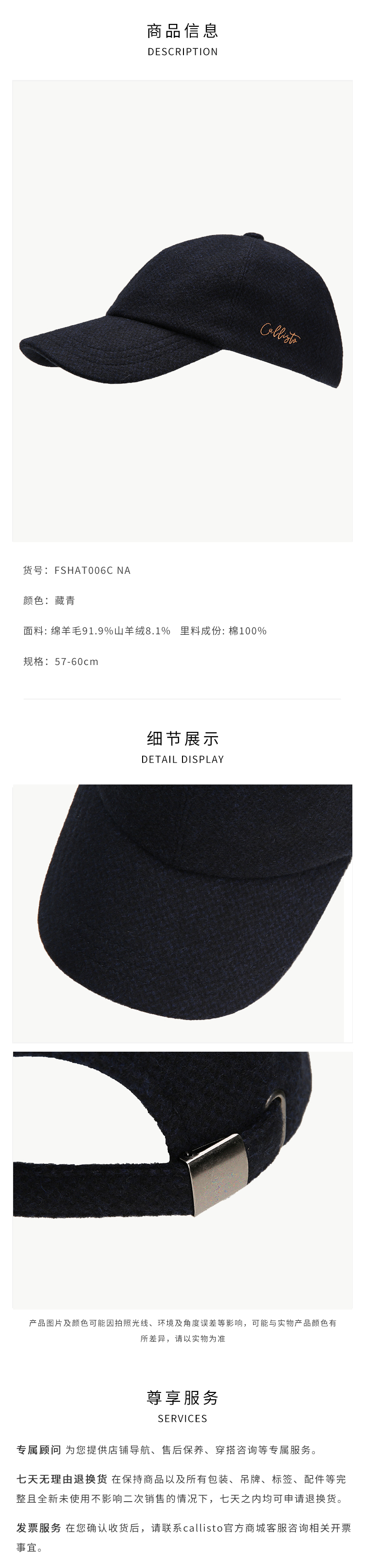 callisto藏青绵羊毛混纺帽子 FSHAT006C NA