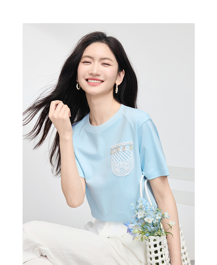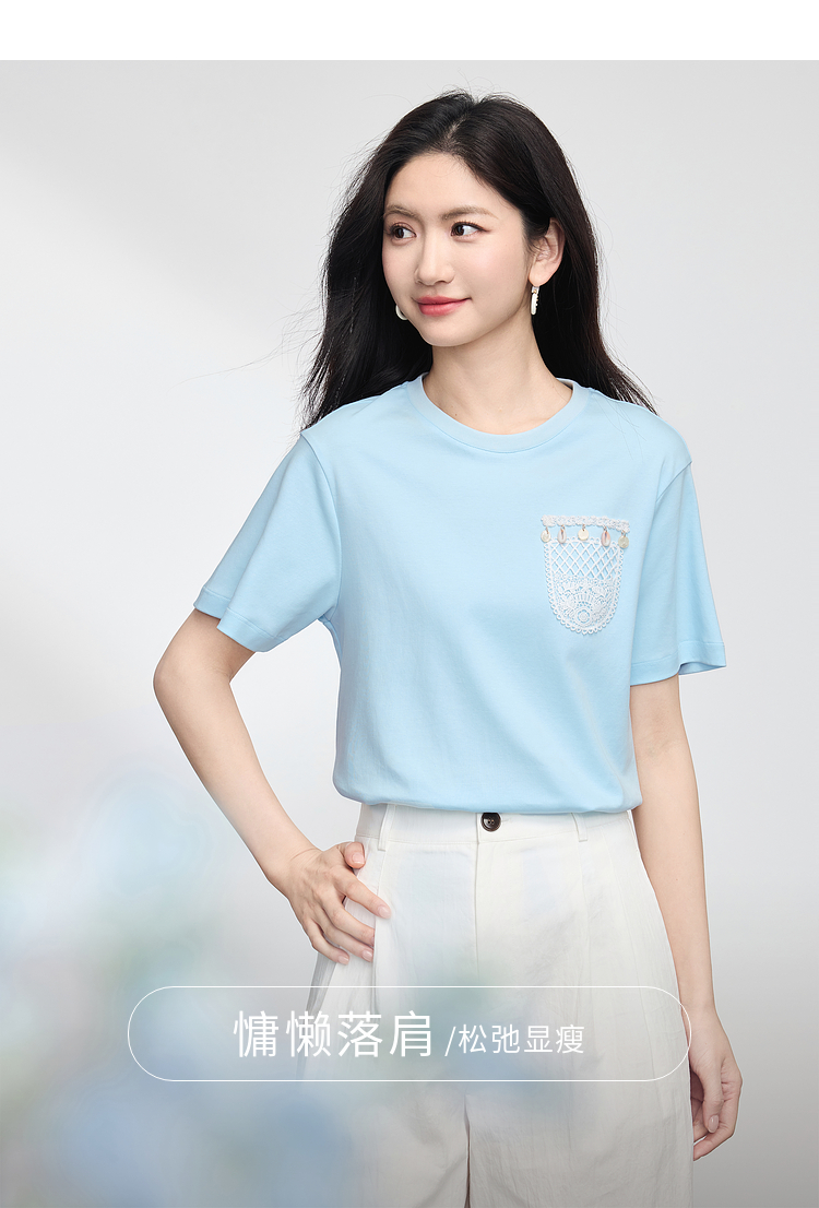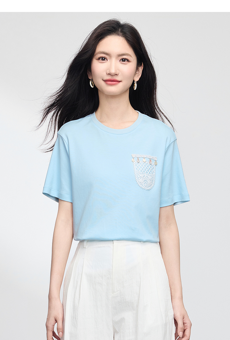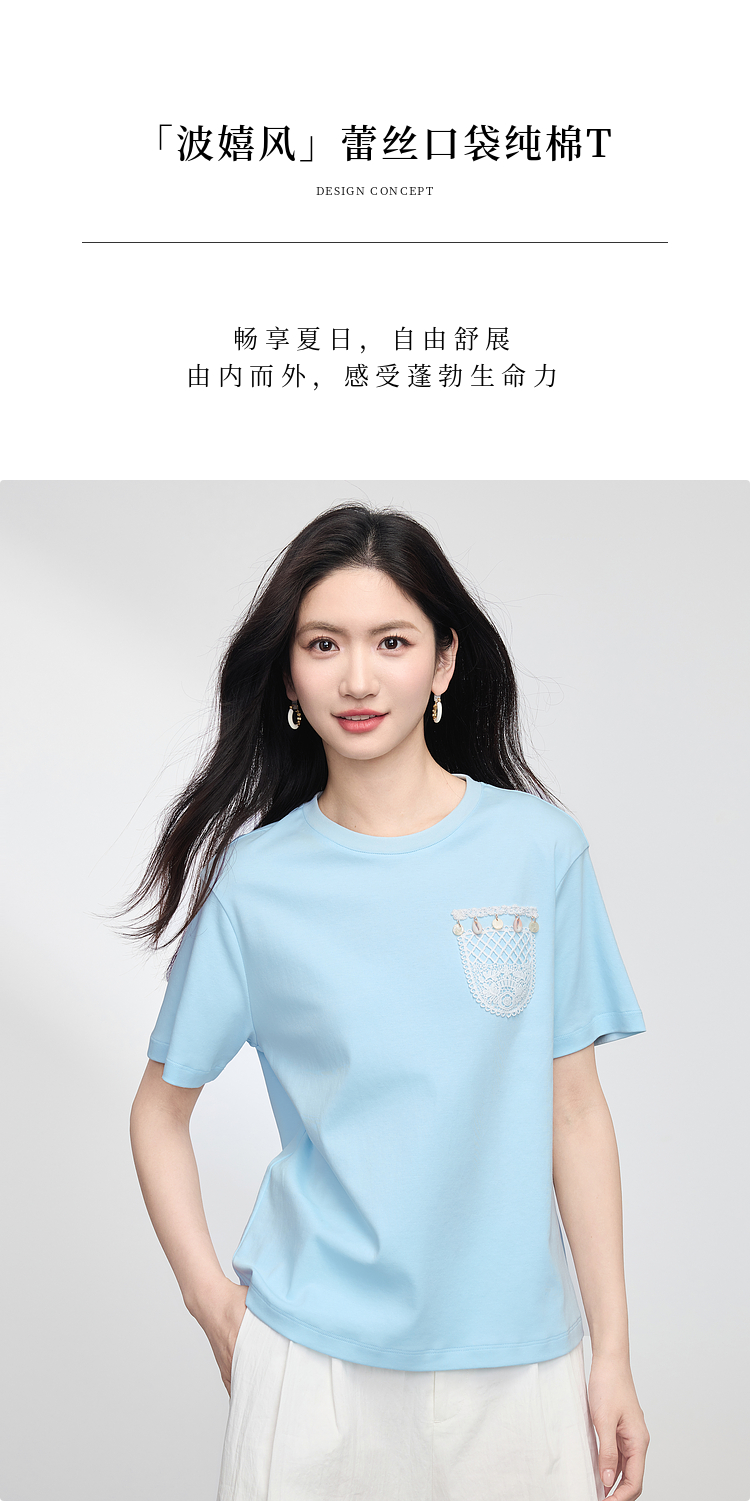 【专属特价】熙世界设计感蕾丝口袋纯棉T恤短袖女时尚减龄蓝色上衣2025夏新款