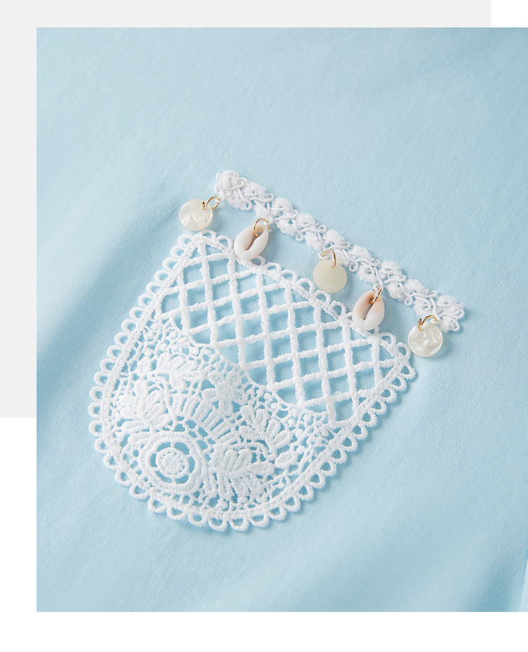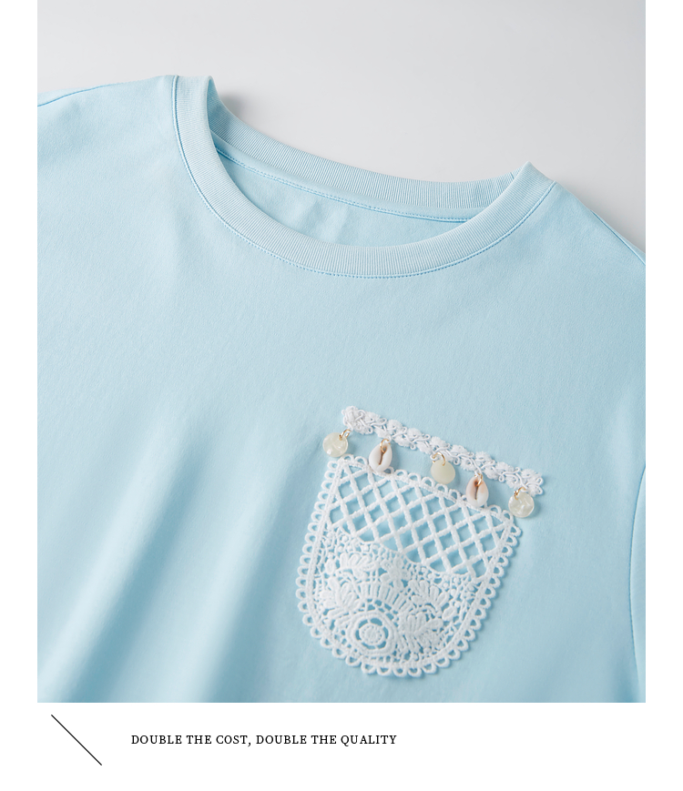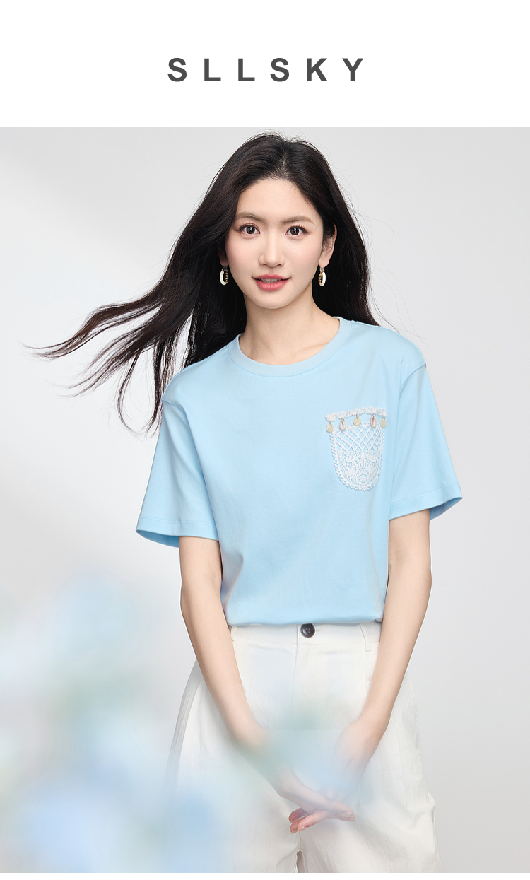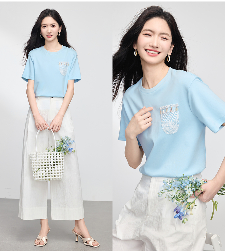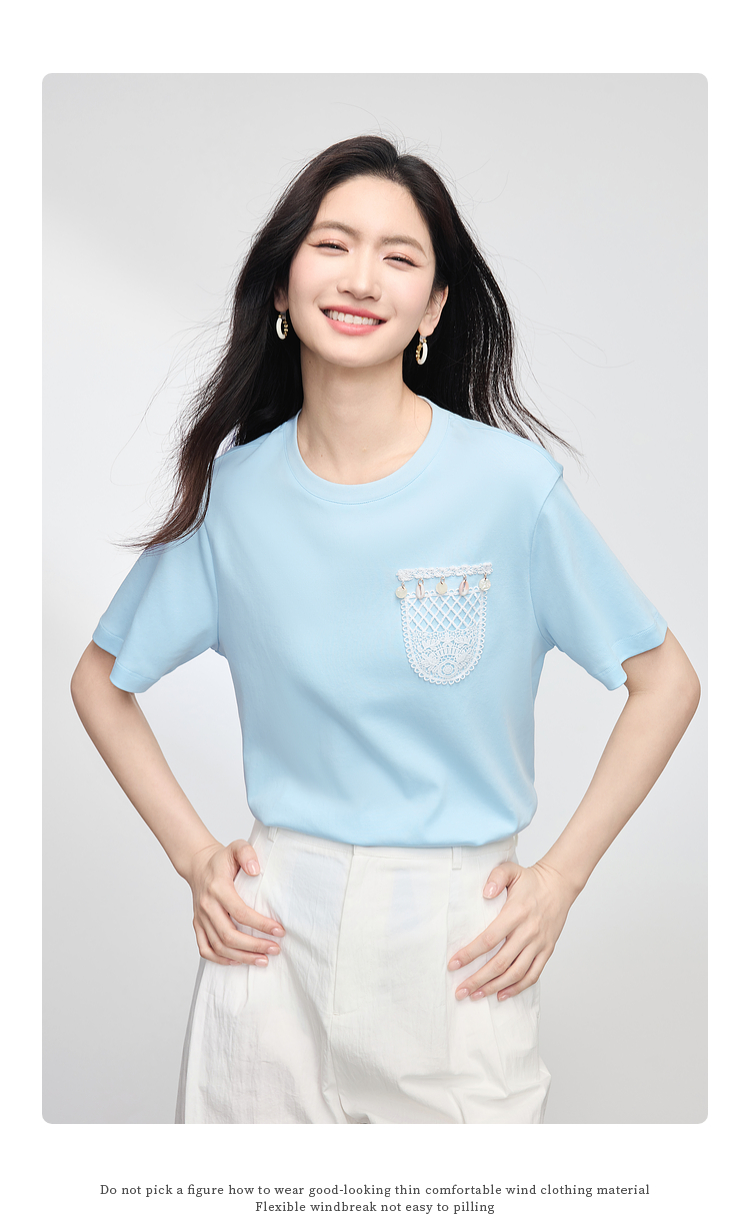 【专属特价】熙世界设计感蕾丝口袋纯棉T恤短袖女时尚减龄蓝色上衣2025夏新款