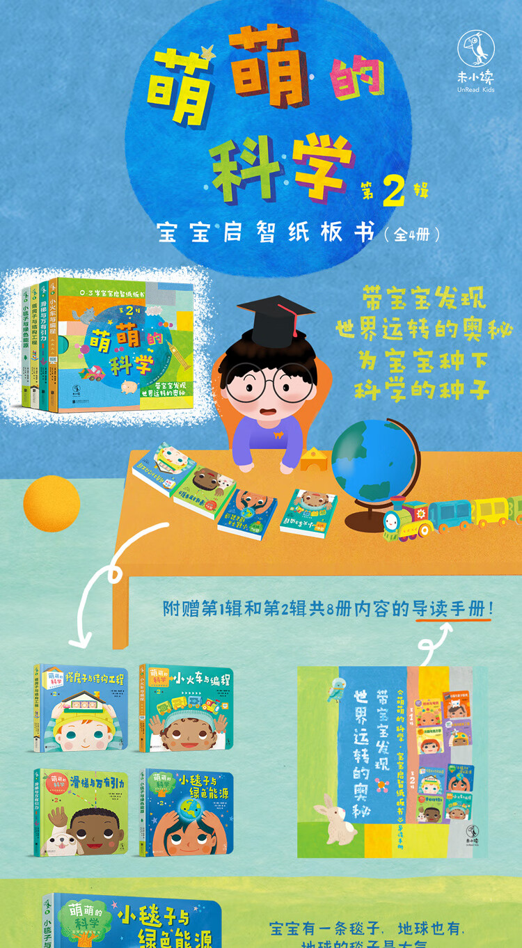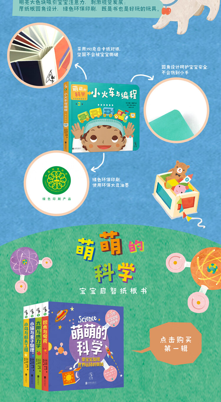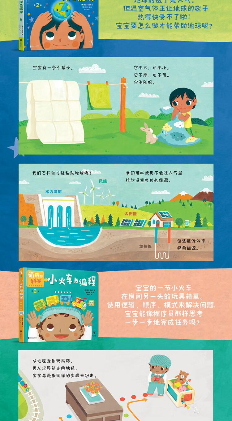 这是一套适合0~3岁孩子阅读的纸板书,共四册,分别为《小毯子与绿色能源》《小火车与编程》 《搭房子与结构工程》 《滑梯与万有引力》。将宝宝的日常体验转化成让宝宝感兴趣的、非正式的学习机会,通过宝宝的毯子引出地球的毯子是大气,通过宝宝去拿玩具的步骤和路线引出算法和编程,通过宝宝搭积木引出工程师建房子,通过宝宝扔面条落地引出万有引力。